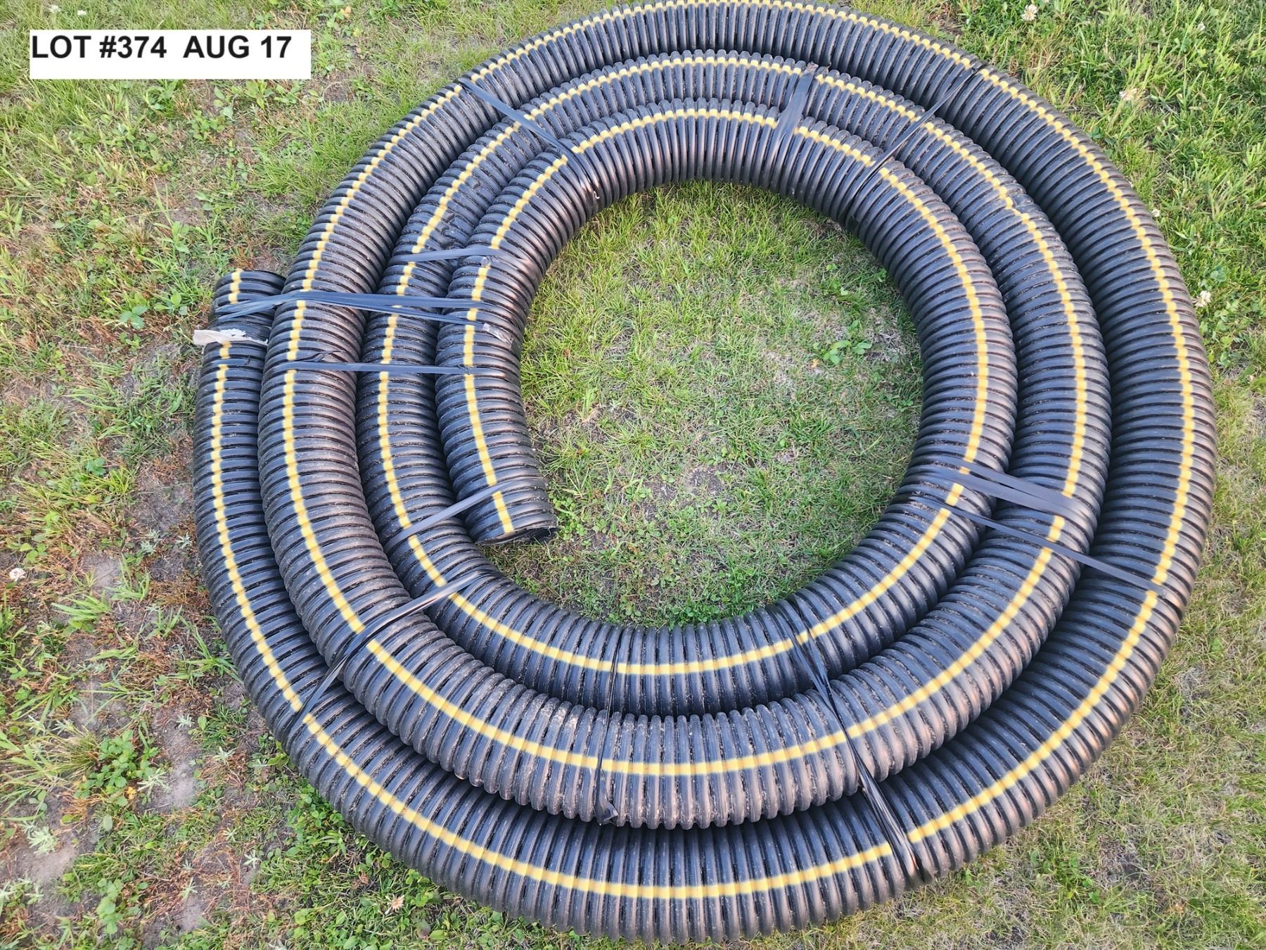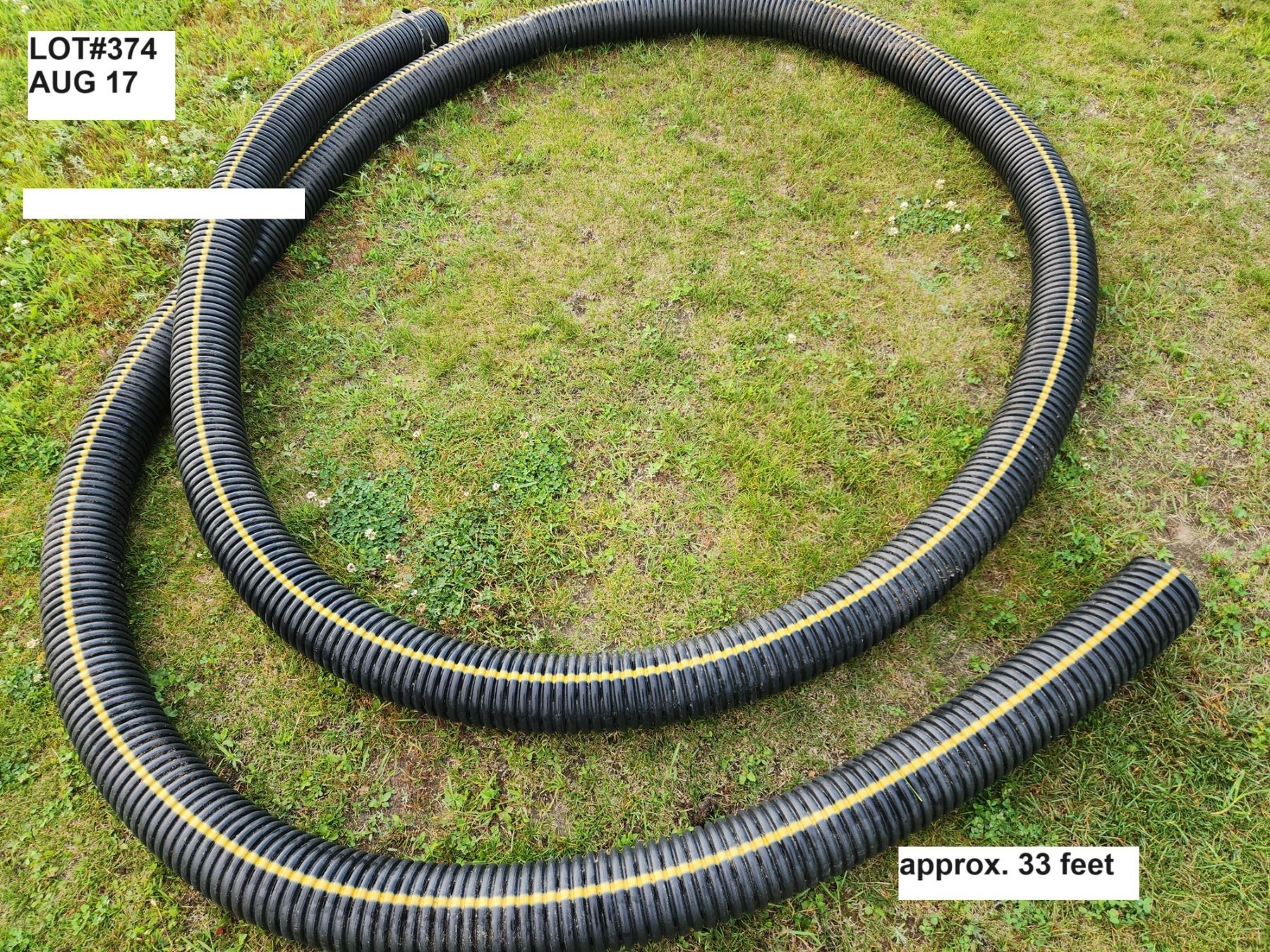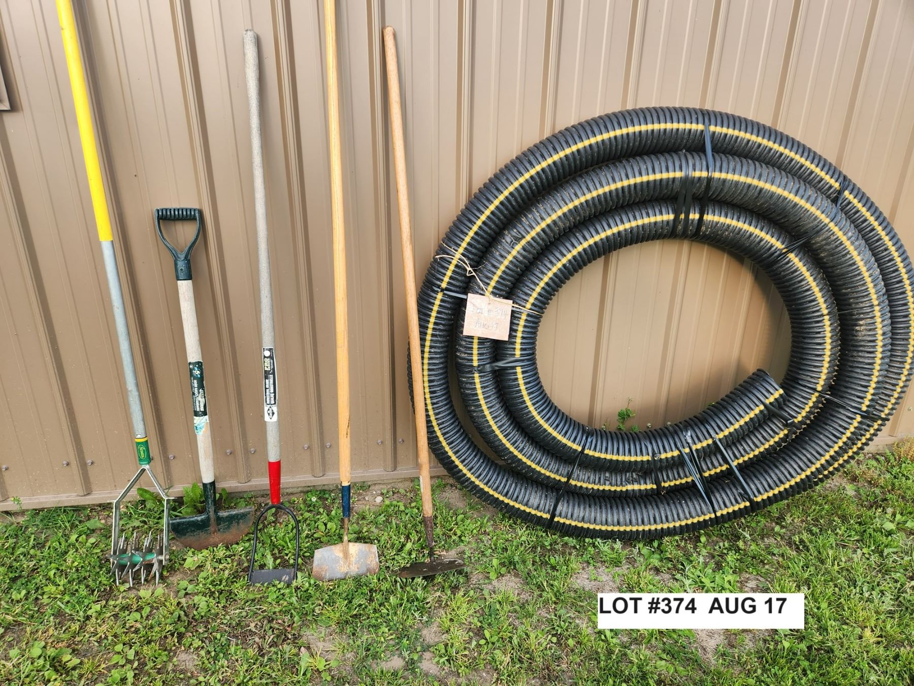 Assorted used garden tools. Approx 33ft of 4 1/2" perforated drainage hose/weeping tile. New. Left over from house build.