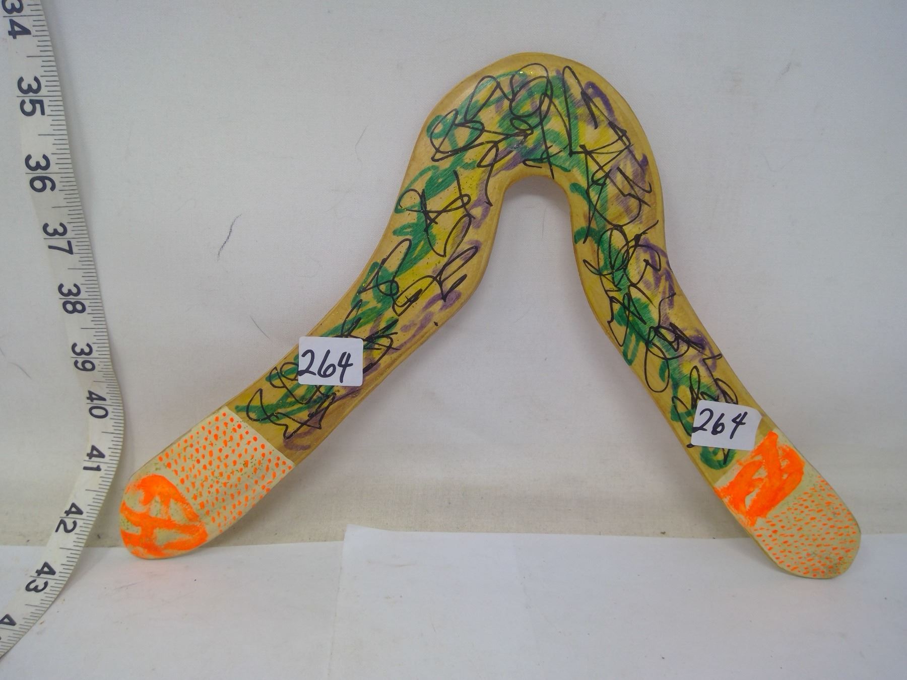Gel Girvin Team Gel Juggler boomerang. Range: 30 meters. Span: 12”. Right hander. Circular, fast, predictable, accurate returner.