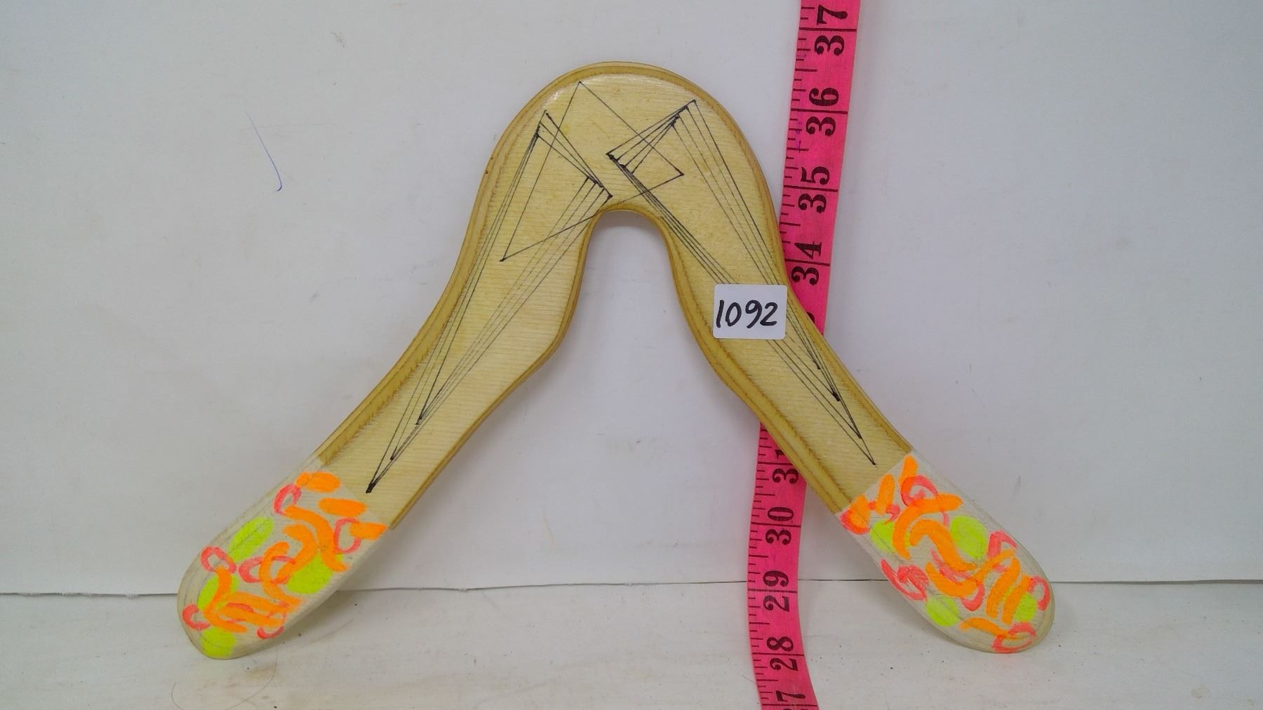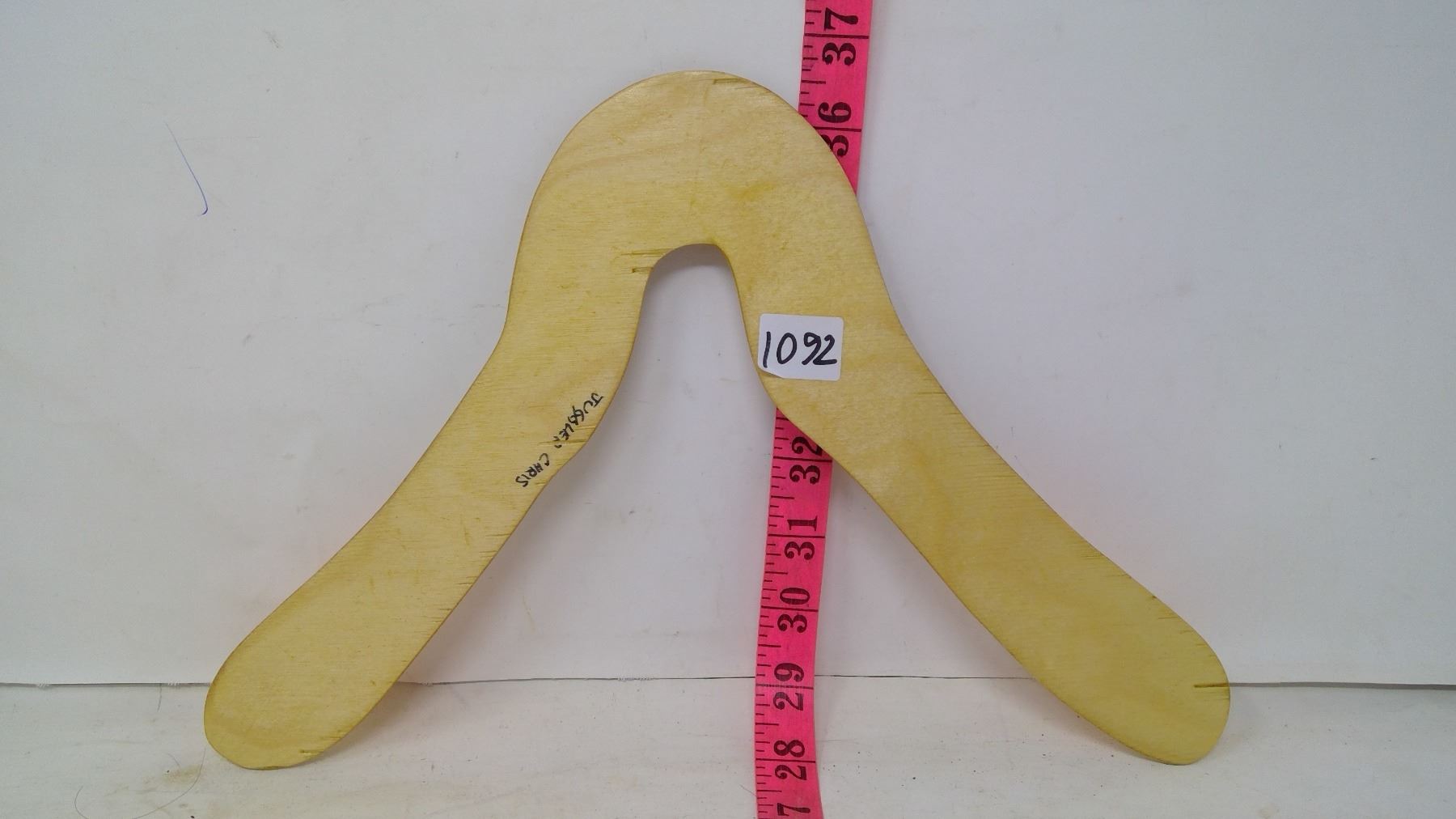 Gel 'Juggler' boomerang designed by Michael Girven of Team Gel San Francisco, USA. Width: 12 1/2". Material: Baltic birch laminate. This boomerang has a forgiving, accurate return. So, two or three will be thrown in rapid succession to 'juggle’. For a right-handed person.