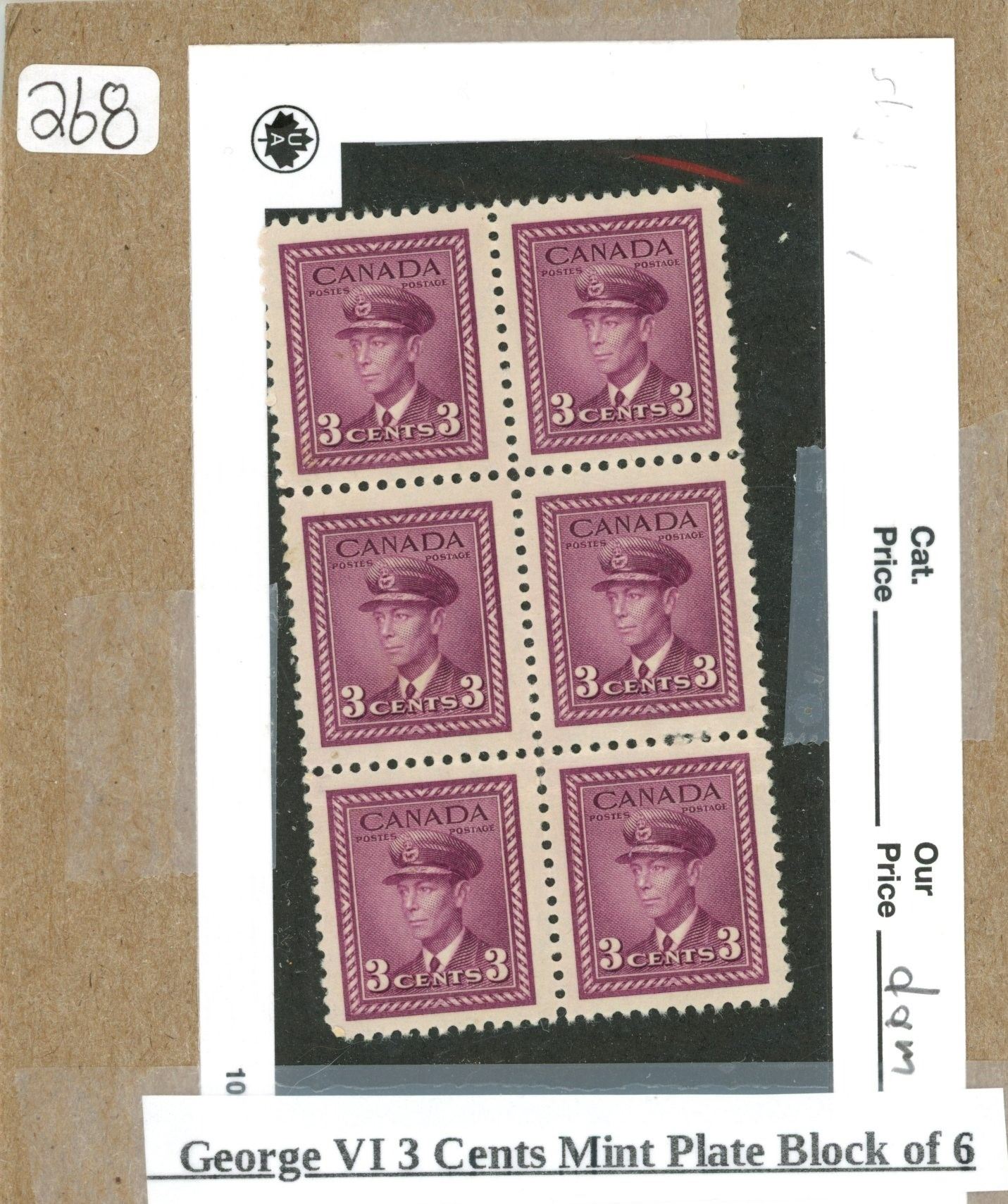 George VI 3 cents mint plate block of 6
