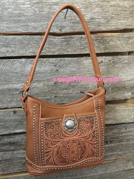Georgeous tooled leather hobo style bag has a silver berry concho on the front flap pocket.Inside single compartment divided by a medium zippered pocket.Inside of bag include a zippered pocket and 2 open pockets. A zippered pocket and an open pocket on the back.Single flat strap Measurements: 12" x 4.75" x 10.5" (Drop 11.5")