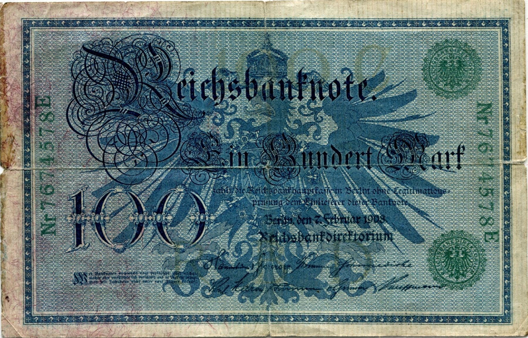German Empire 1908 100 Mark Reichsbanknote. High denomination 113-year-old note. P-34. F.