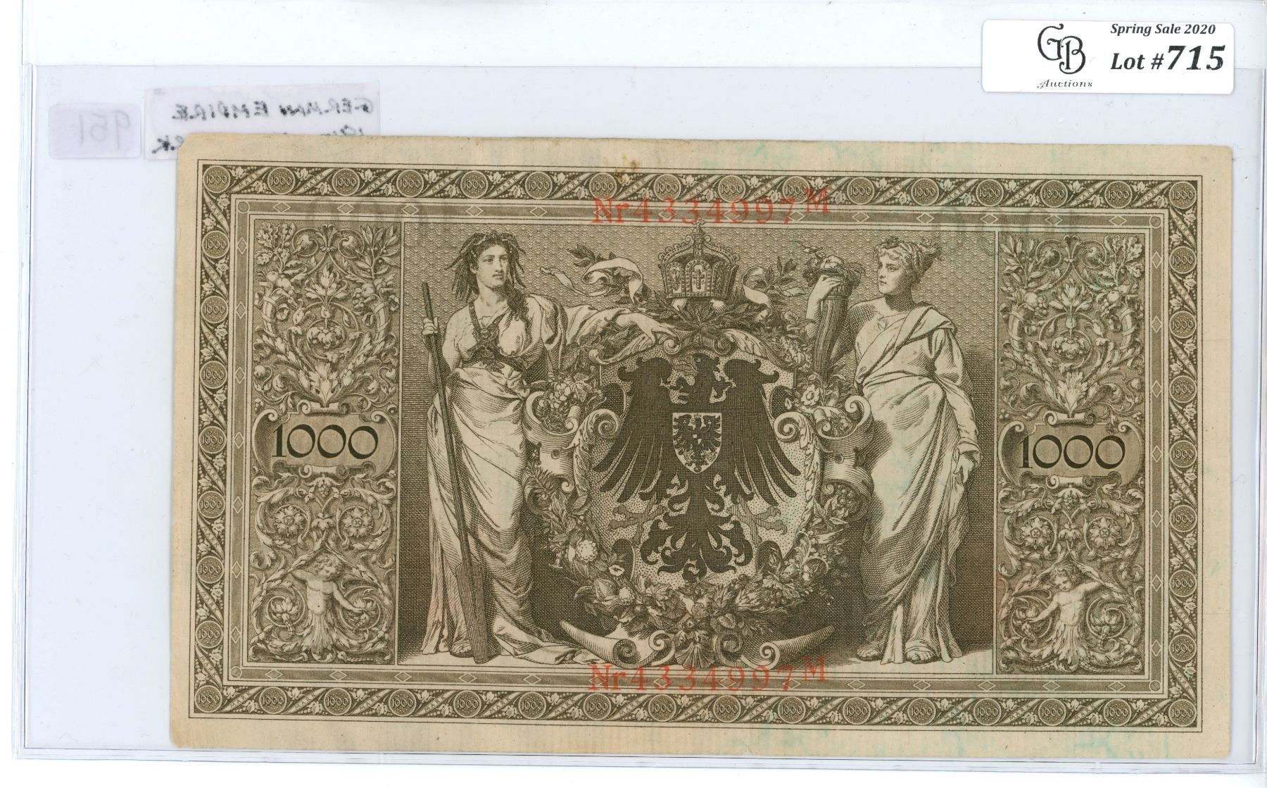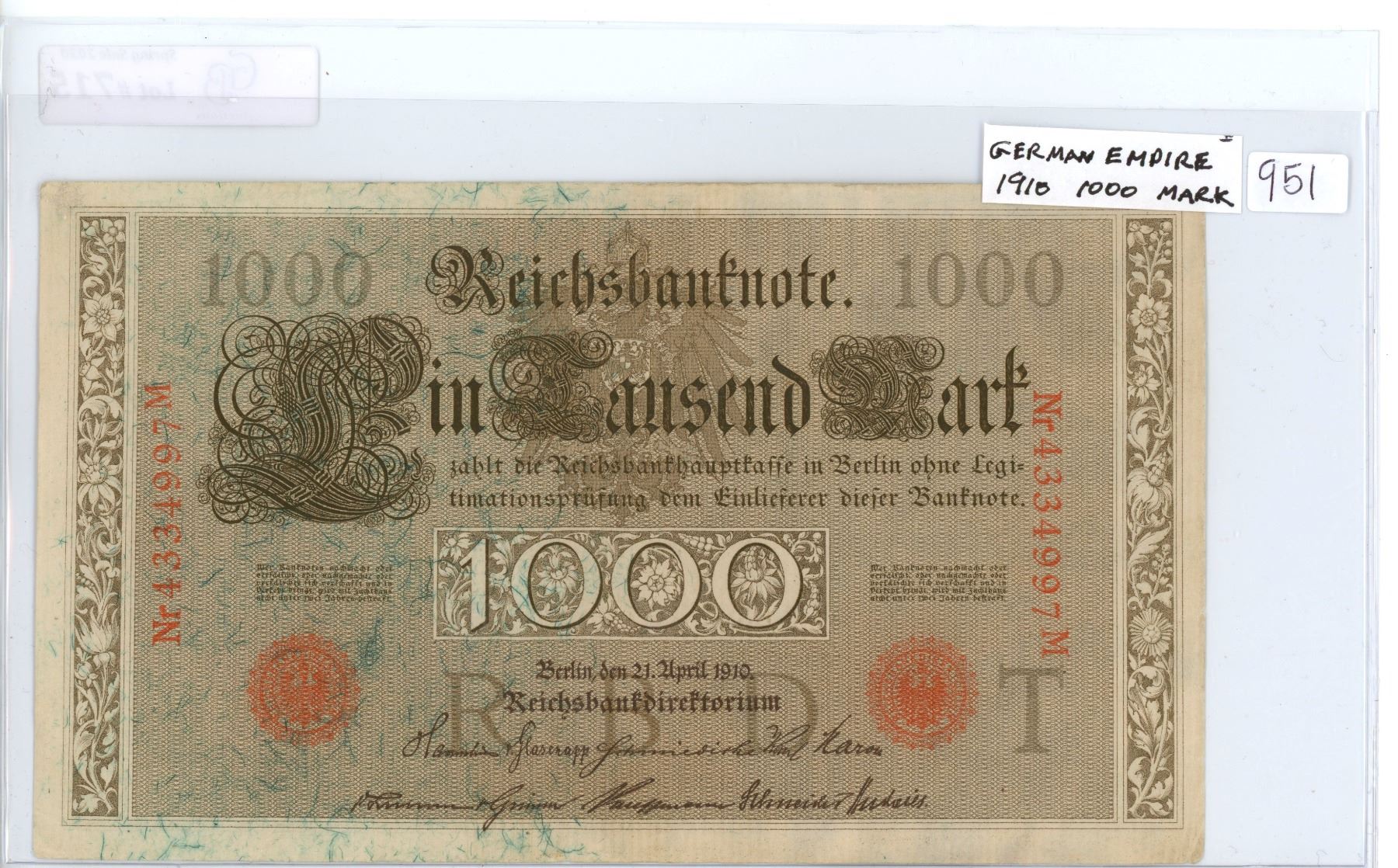 German Empire. 1910 1000 Mark Reichsbanknote. Berlin. A huge amount of money in 1910. VF.