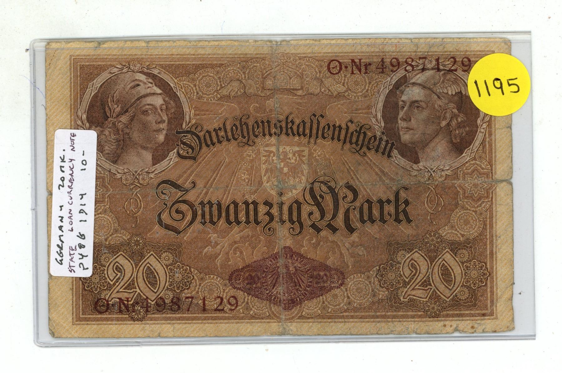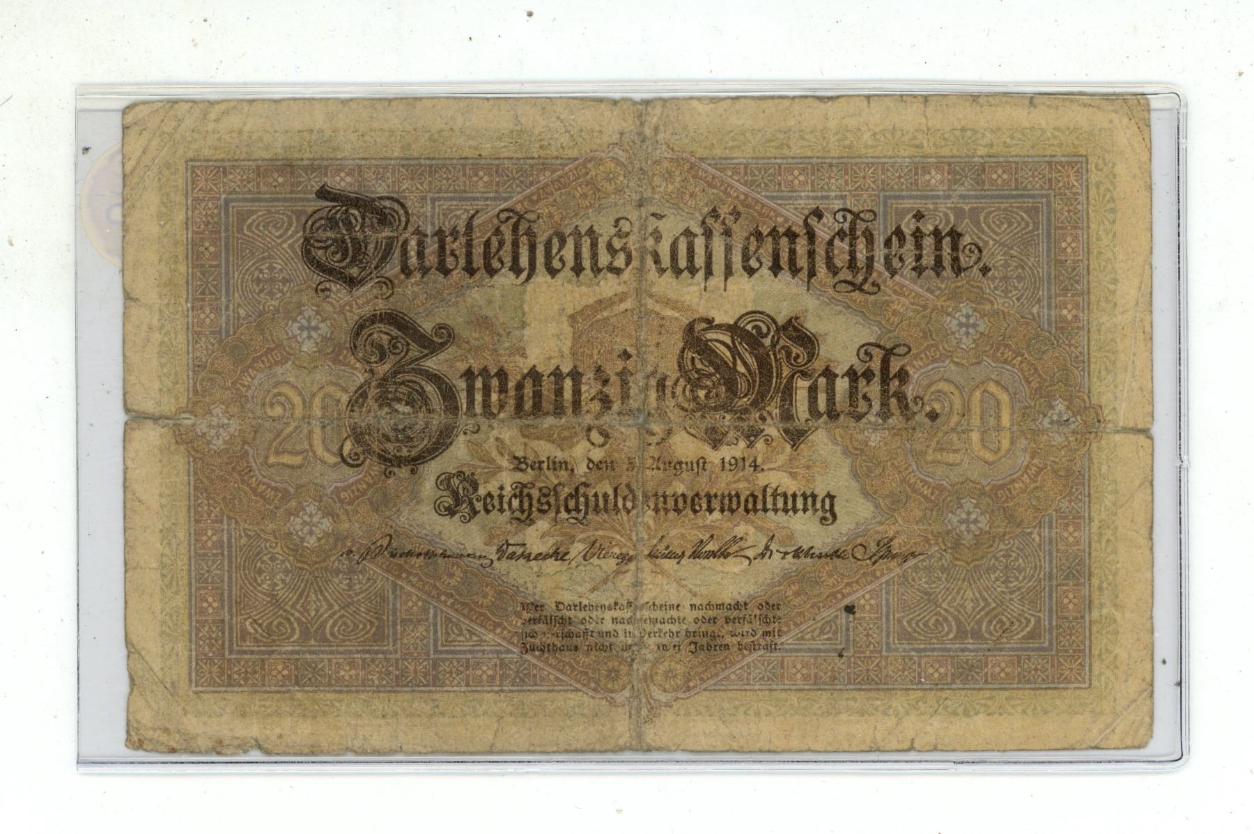 German Empire. 1914 20 Mark Darlehenskassenschein (State Loan Currency Note). VG.