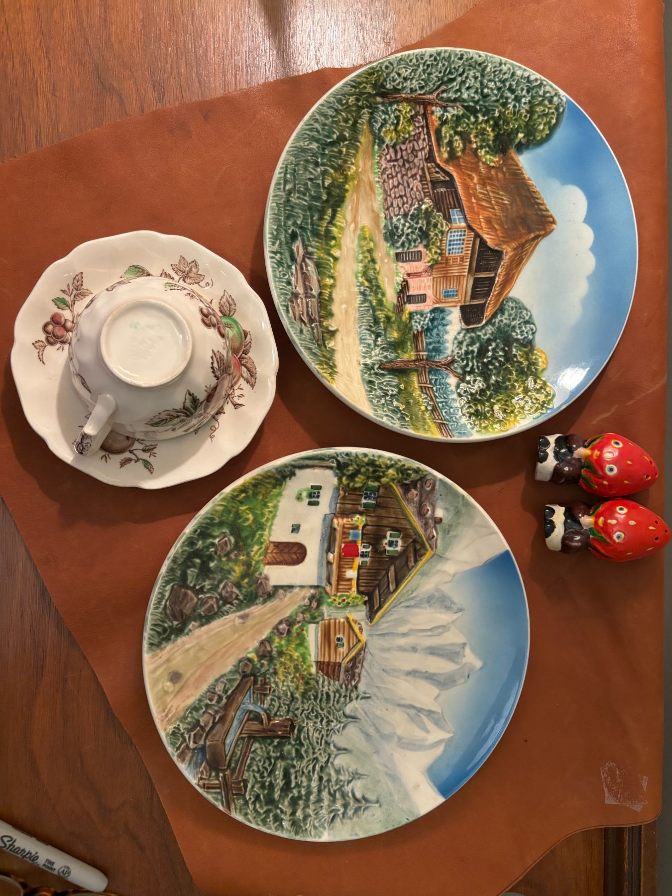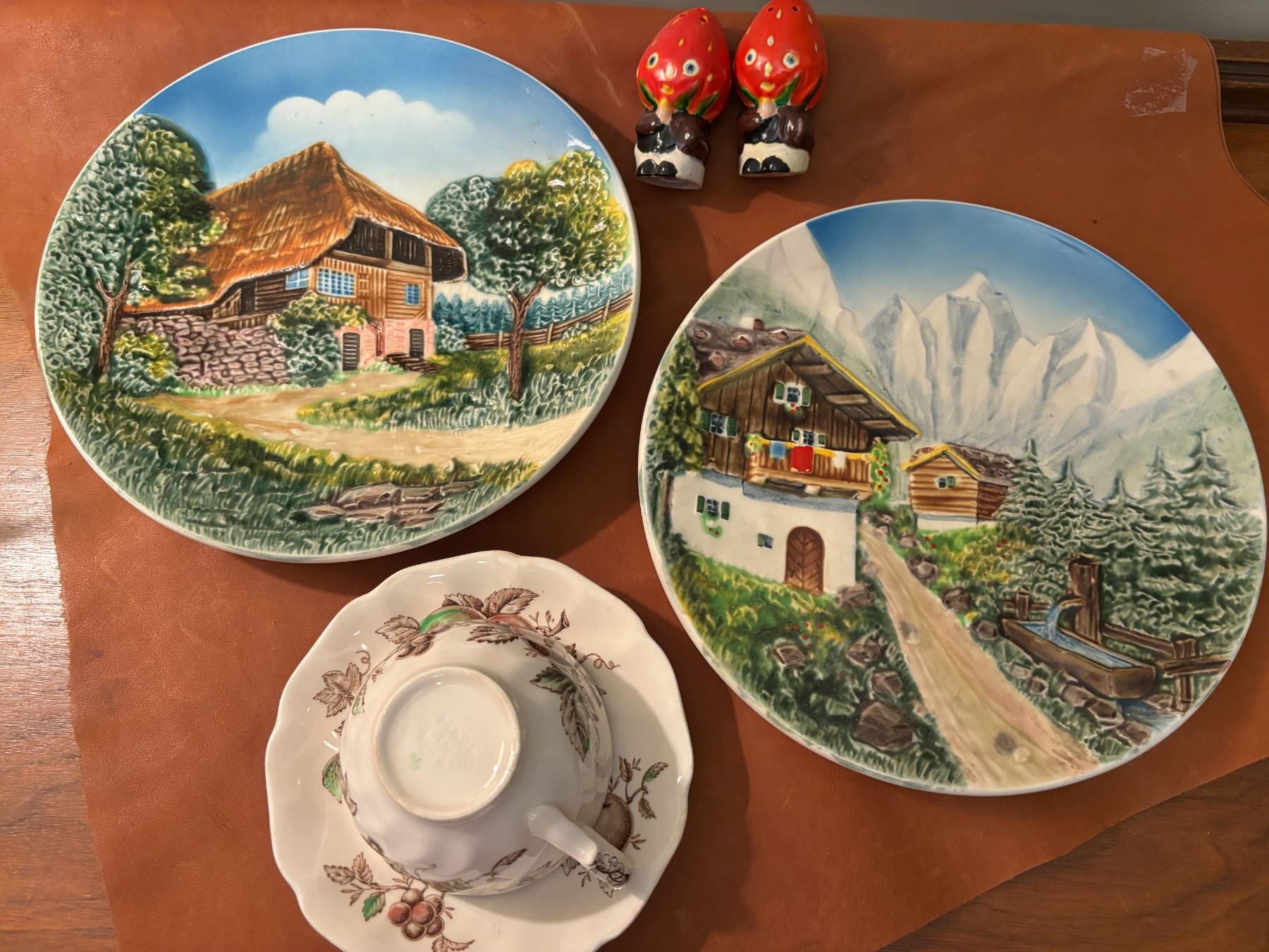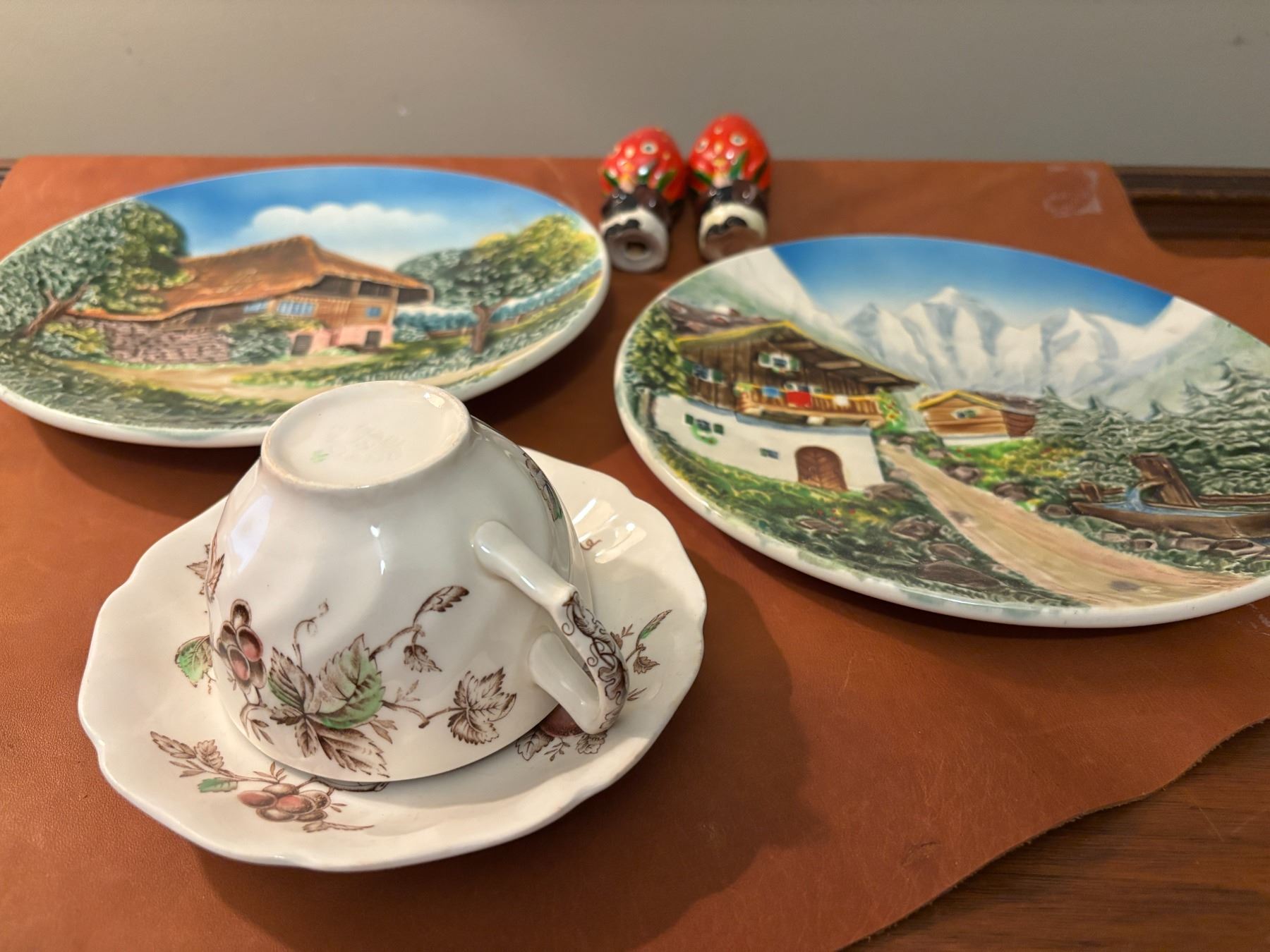 Decorative plates crafted in Western Germany /stamped with a #, Salt/pepper shakers, Harvest Time teacup & Saucer from Johnson Bros’