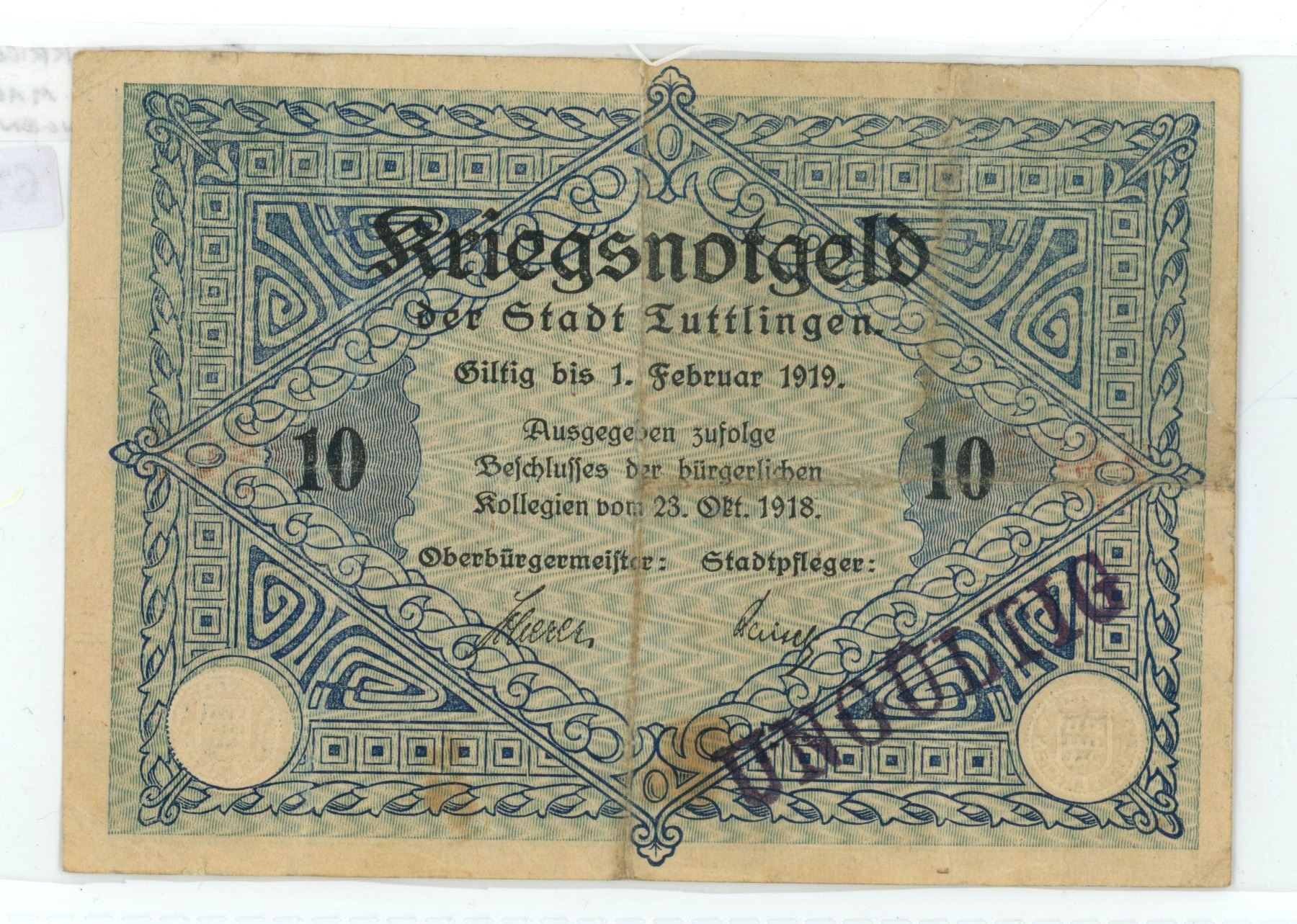 Germany. 1919 10 Mark Kriegsgeld (War Money) issued by the city of Tuttlingen. Fine.