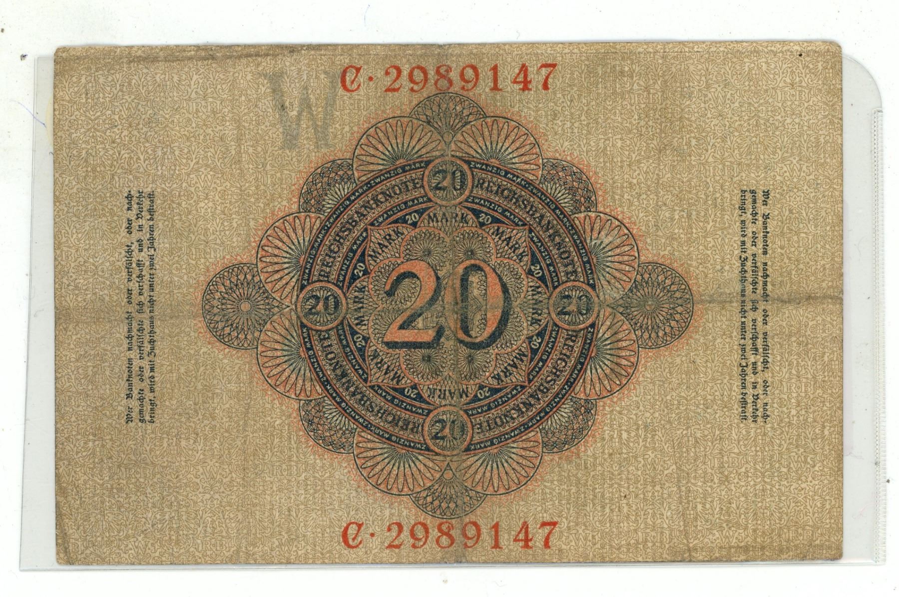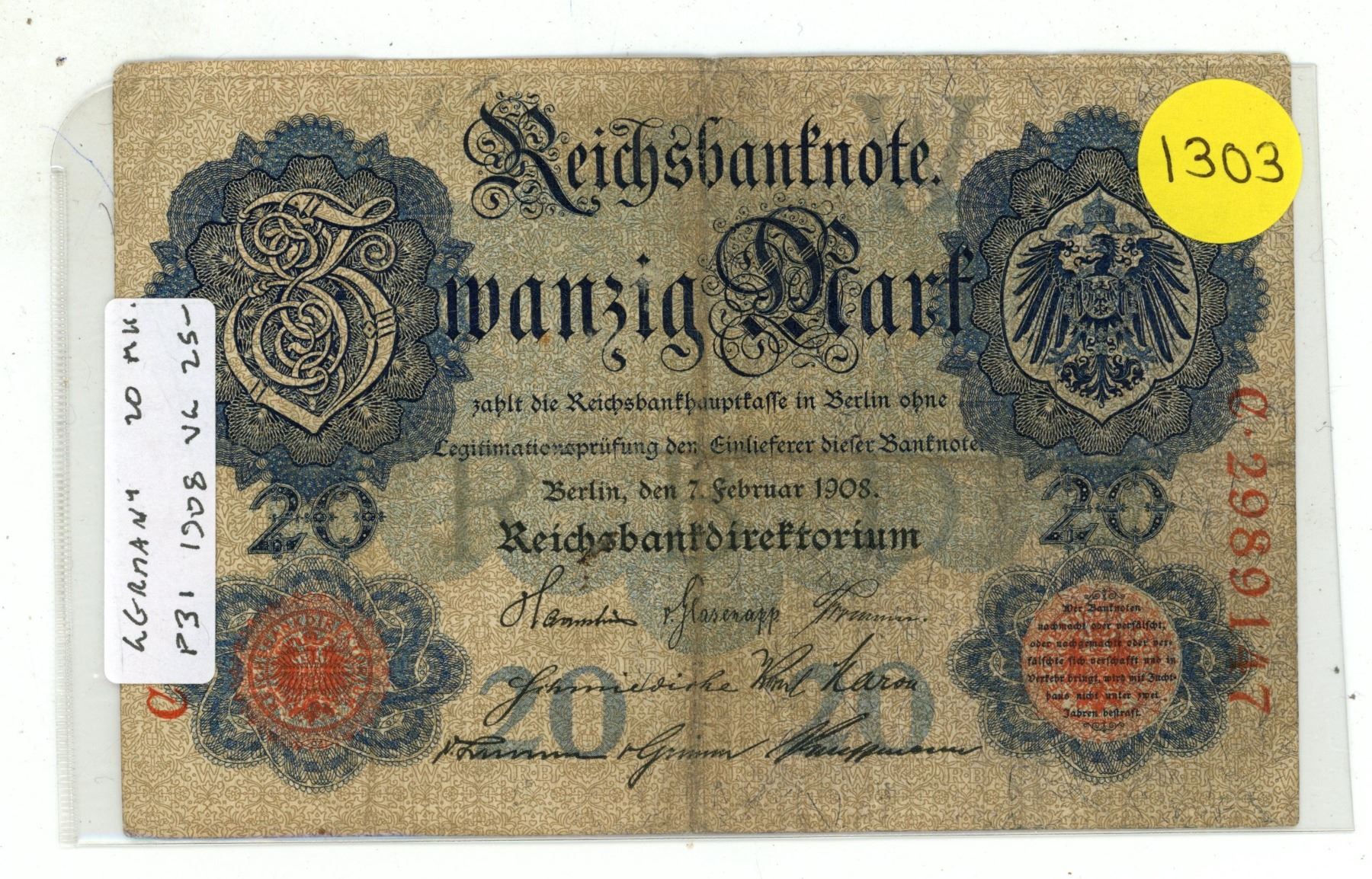 Germany - Empire. 1908 20 Mark Reichsbanknote. VG.