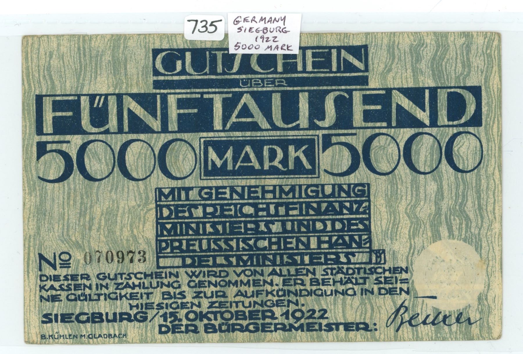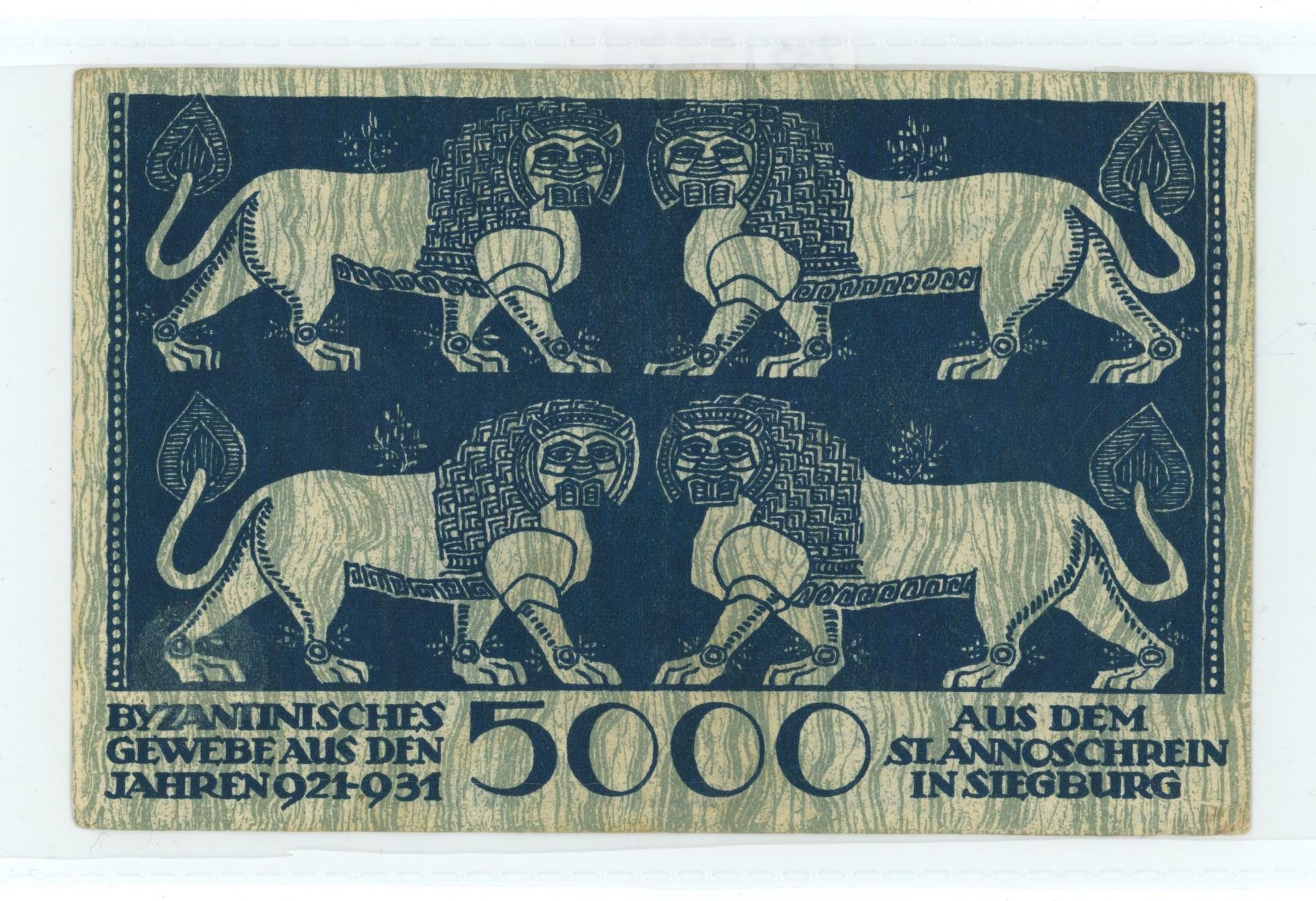 Germany. Siegburg 1922 Gutschein (Good For) 5000 Mark. 4 lions on the. Back. VF+.