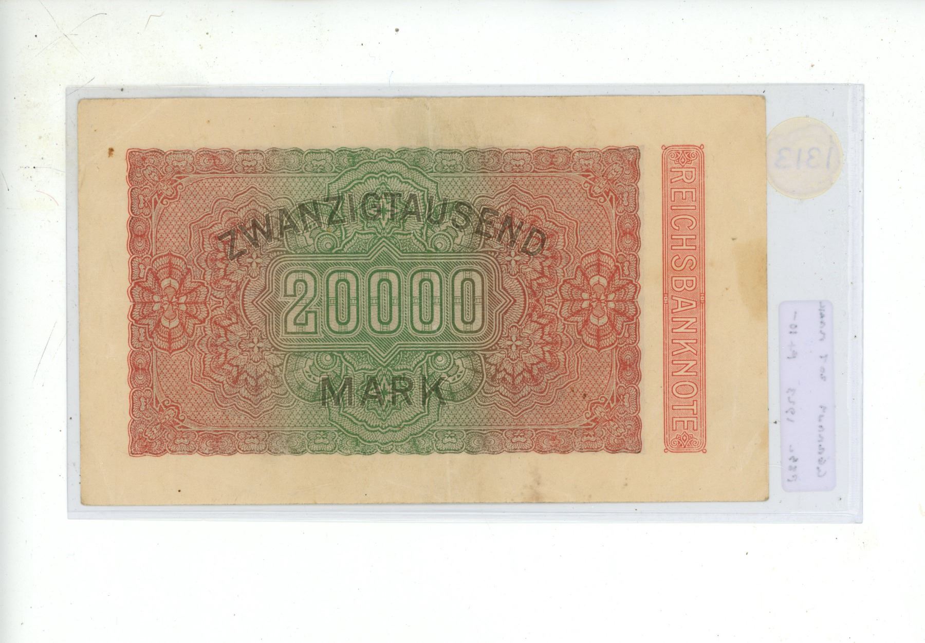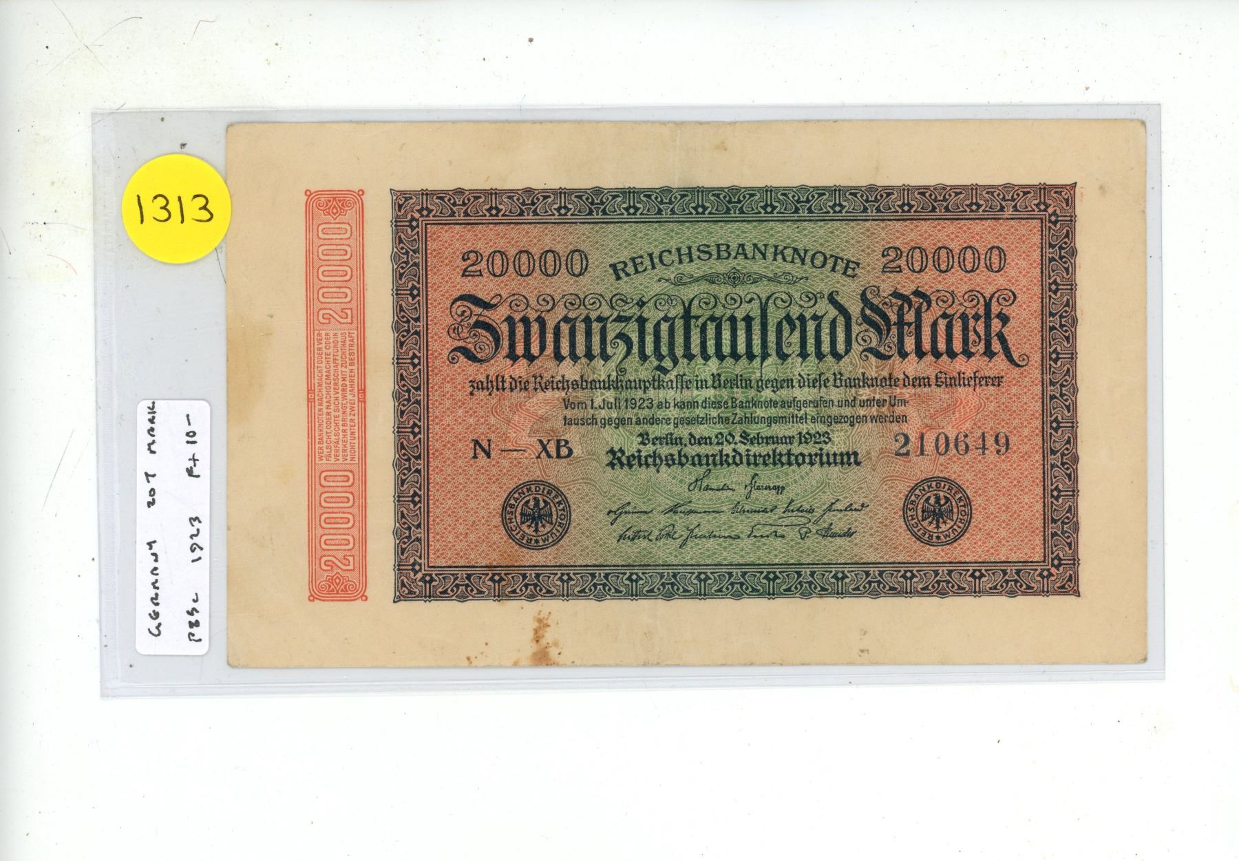Germany – Weimar Republic. 1923 20,000 Mark. Fine+.