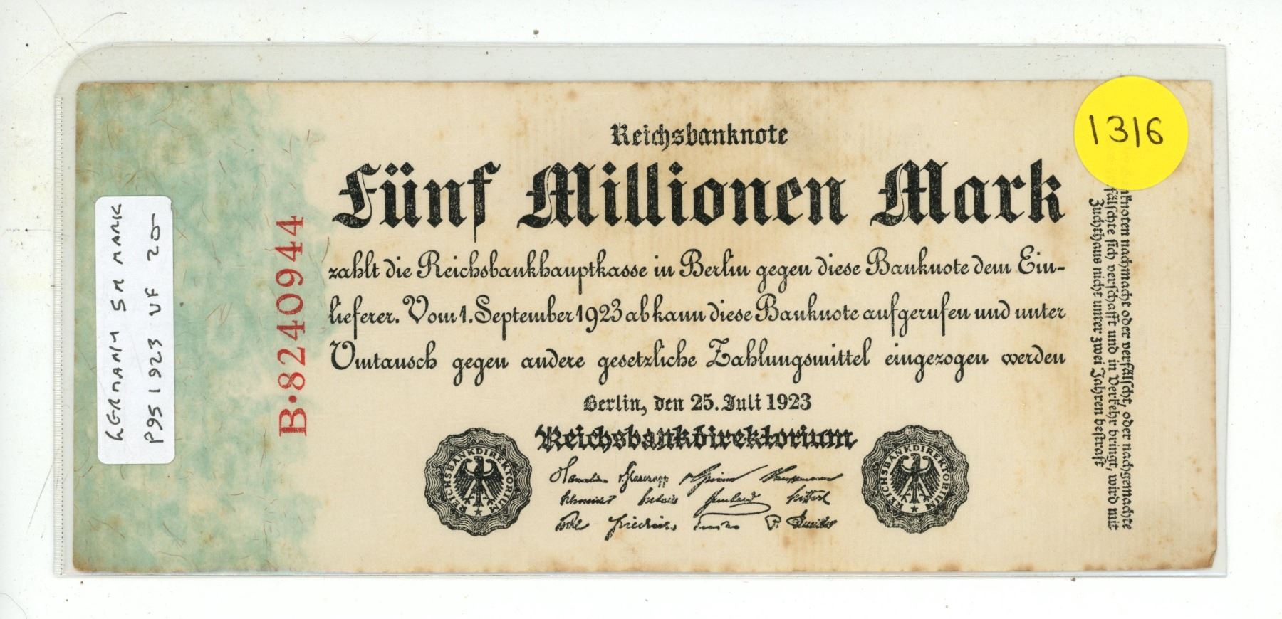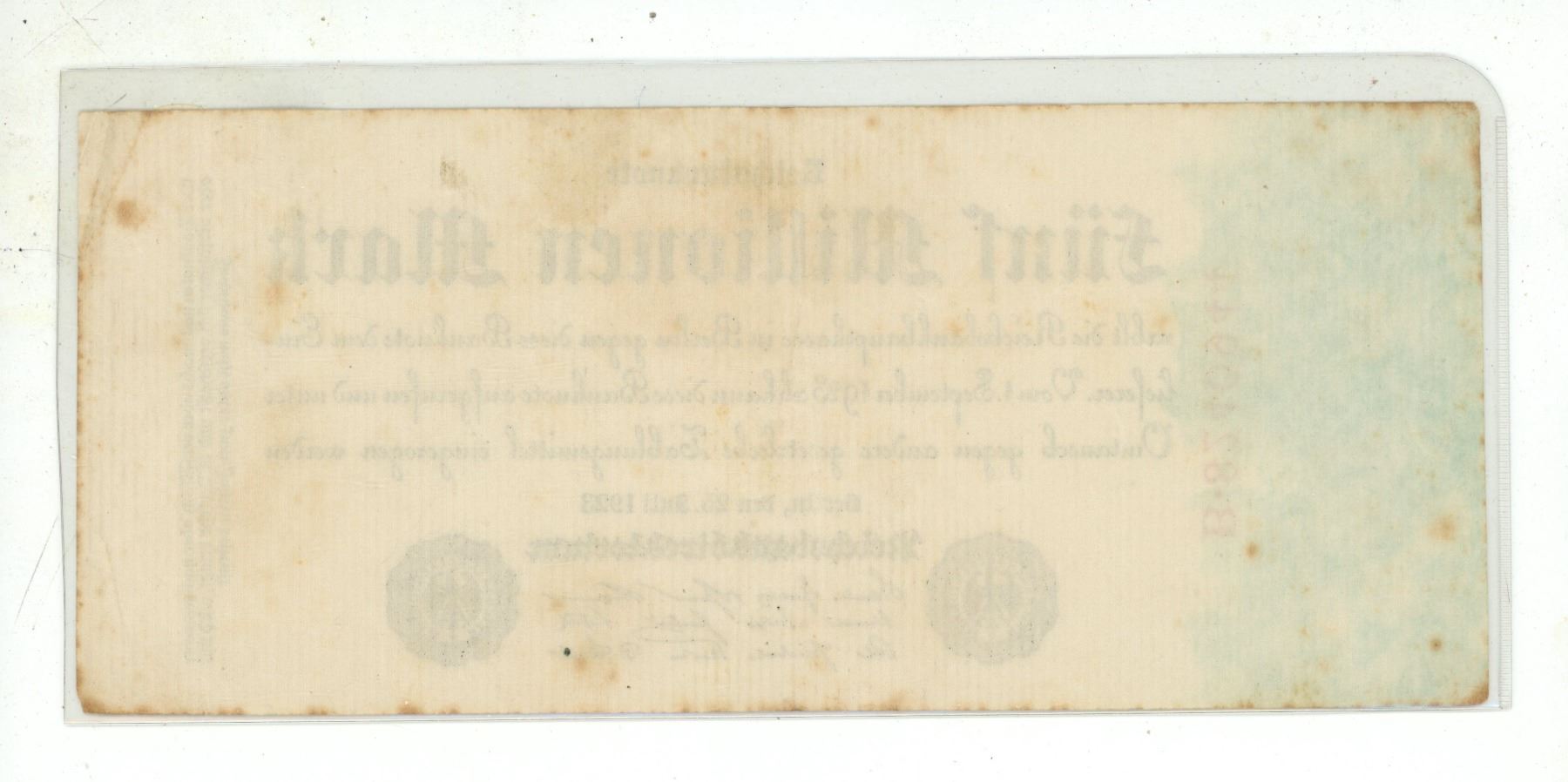 Germany – Weimar Republic. 1923 5 Million Mark. VF.