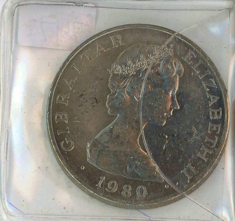 Gibraltar. 1980 Crown. Depicts Admiral Nelson & ship. BU.
