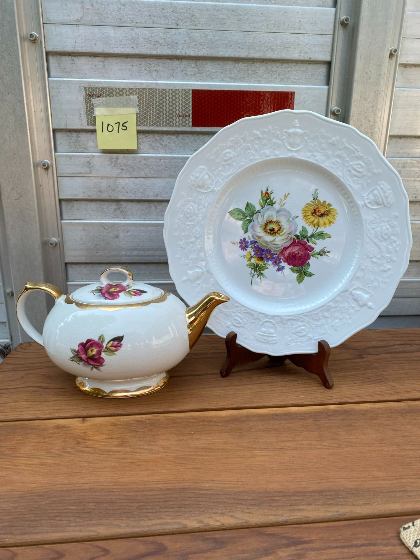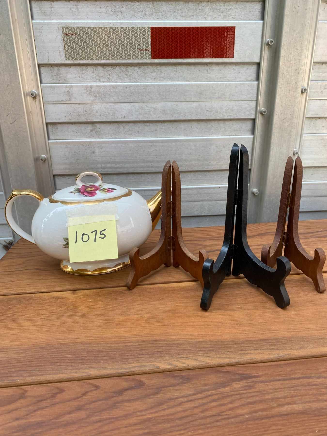 Gibsons Staffordshire teapot floral china plate Simpsons Potteries 3 wood plate stands