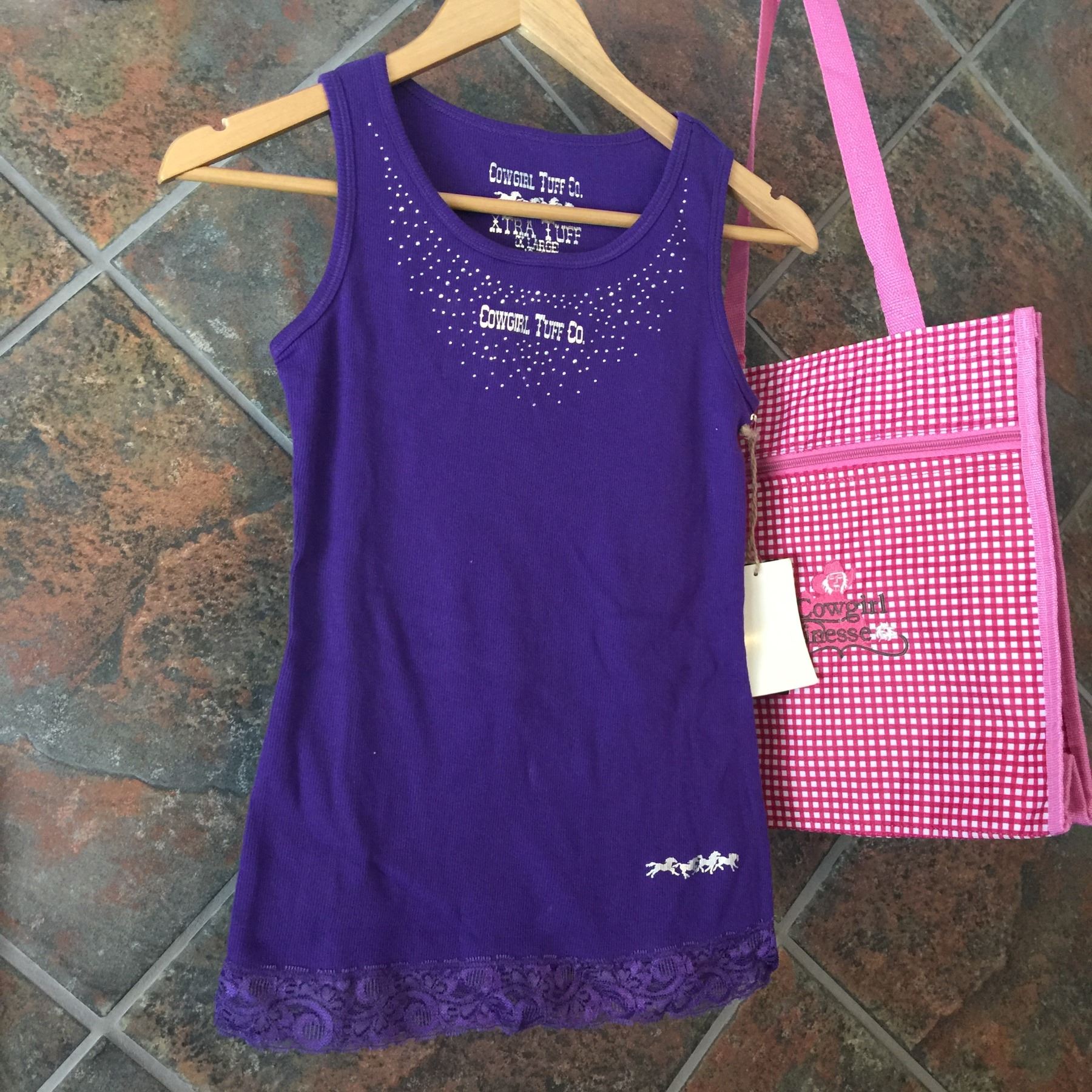 Girls purple tank top with crystals on top of front/Cowgirl Tuff Co. written on front/100% cotton/SIIZE XL/ 18/20 YOUTH/COWGIRL FINESSE FINESSE TOTE BAG