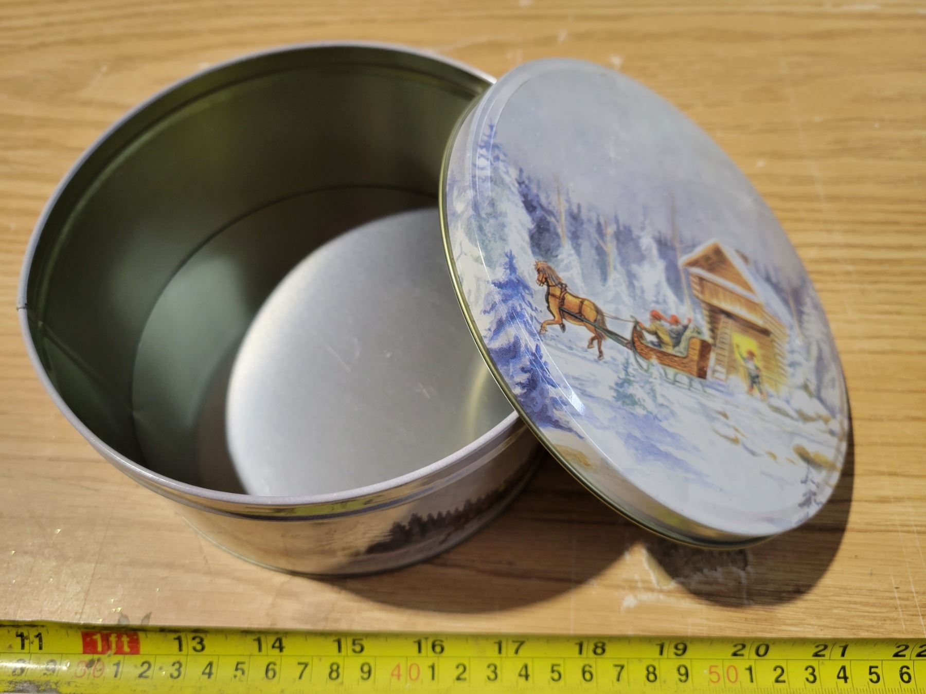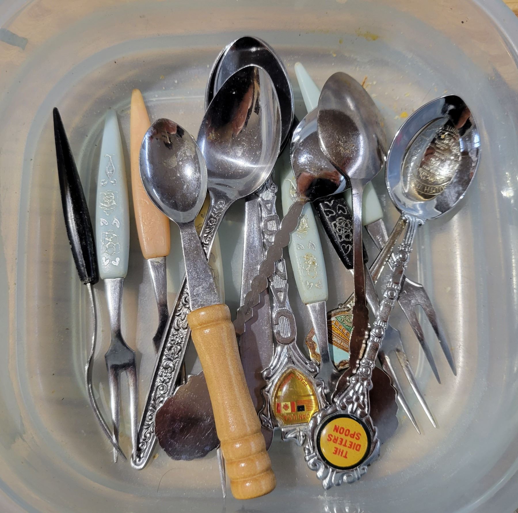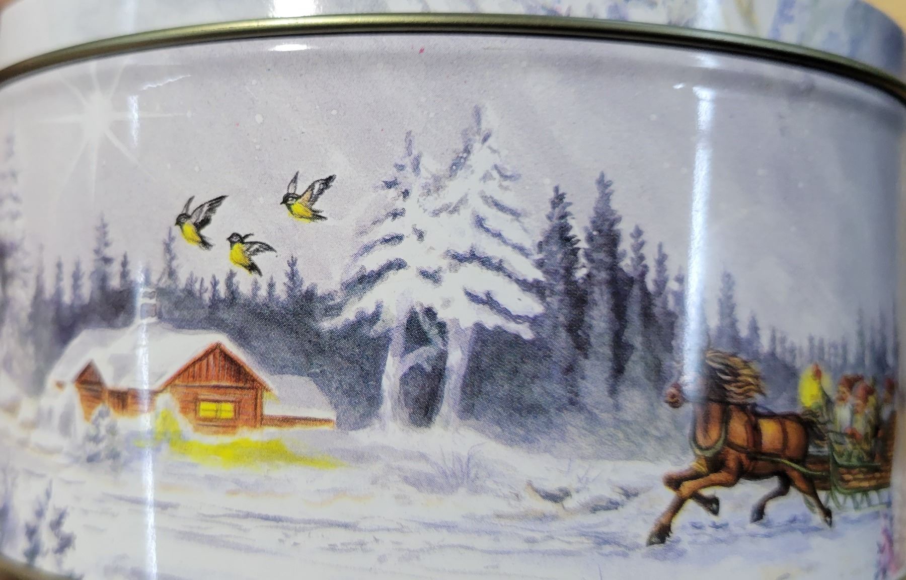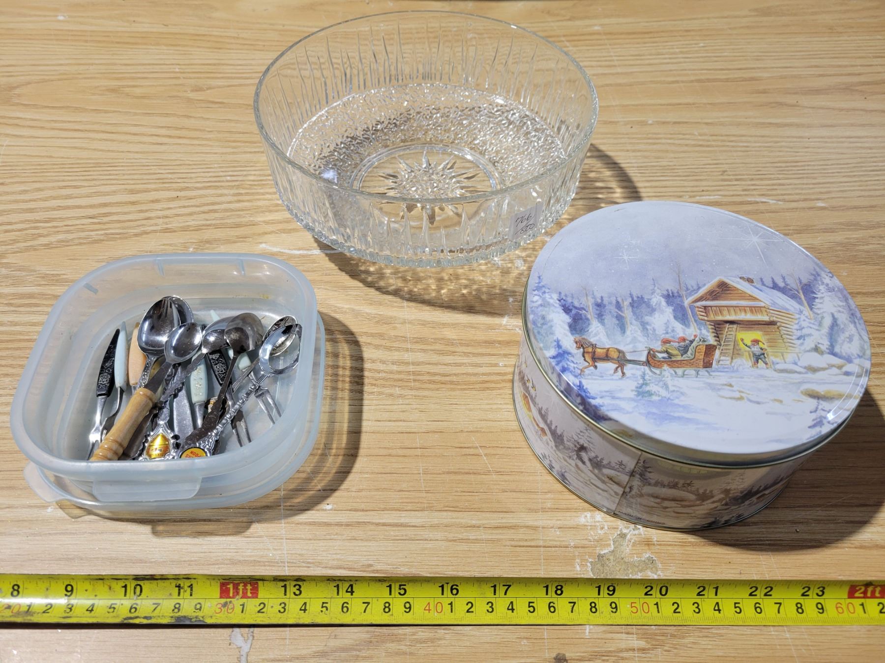 Glas bowl, jam spoons, pickle forks & winter scene tin