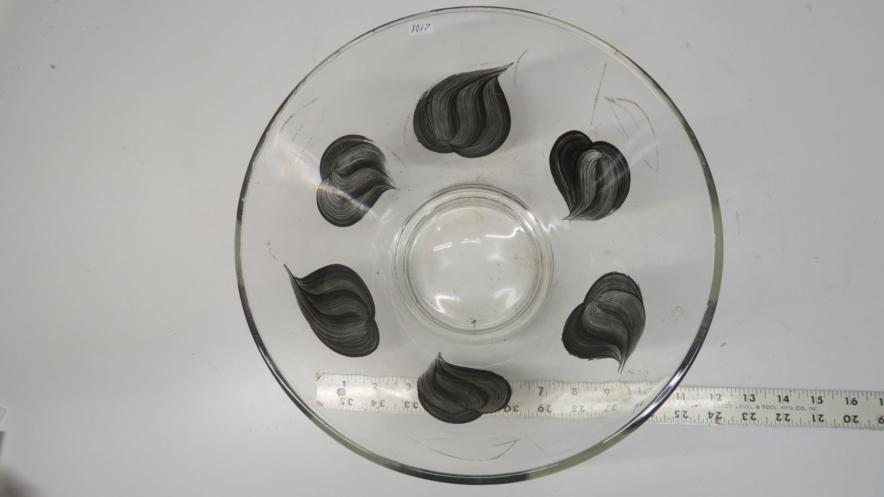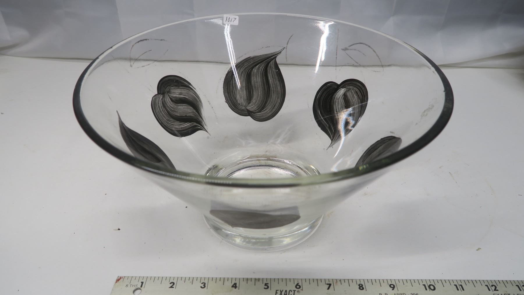 Glass salad bowl with black painted leaf design