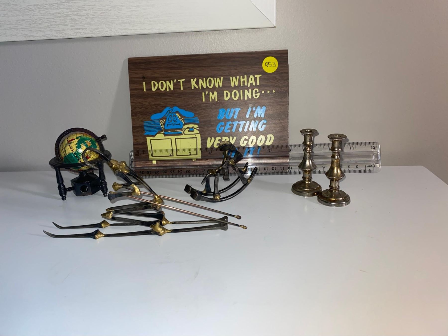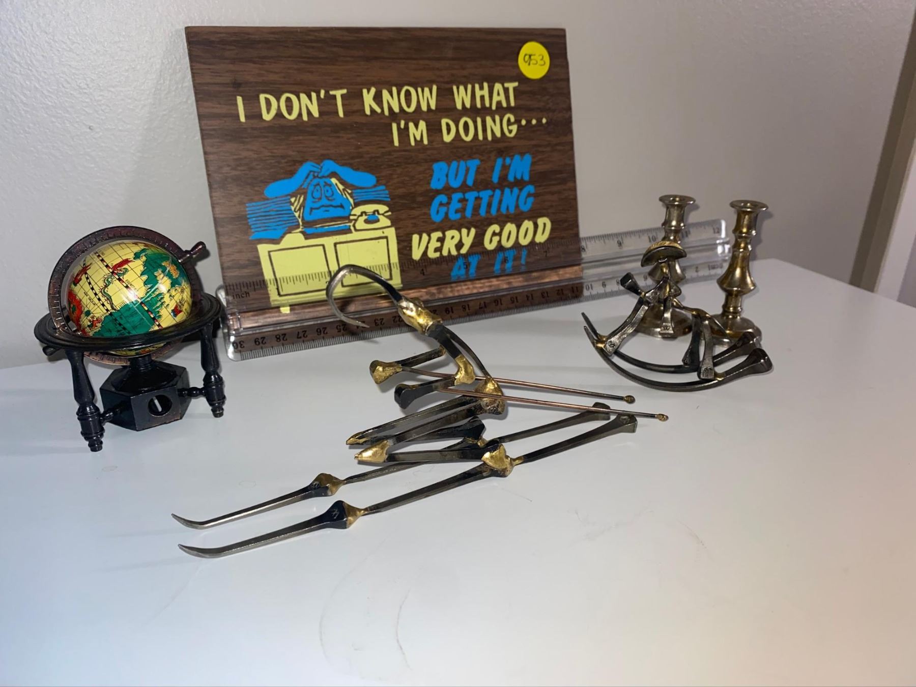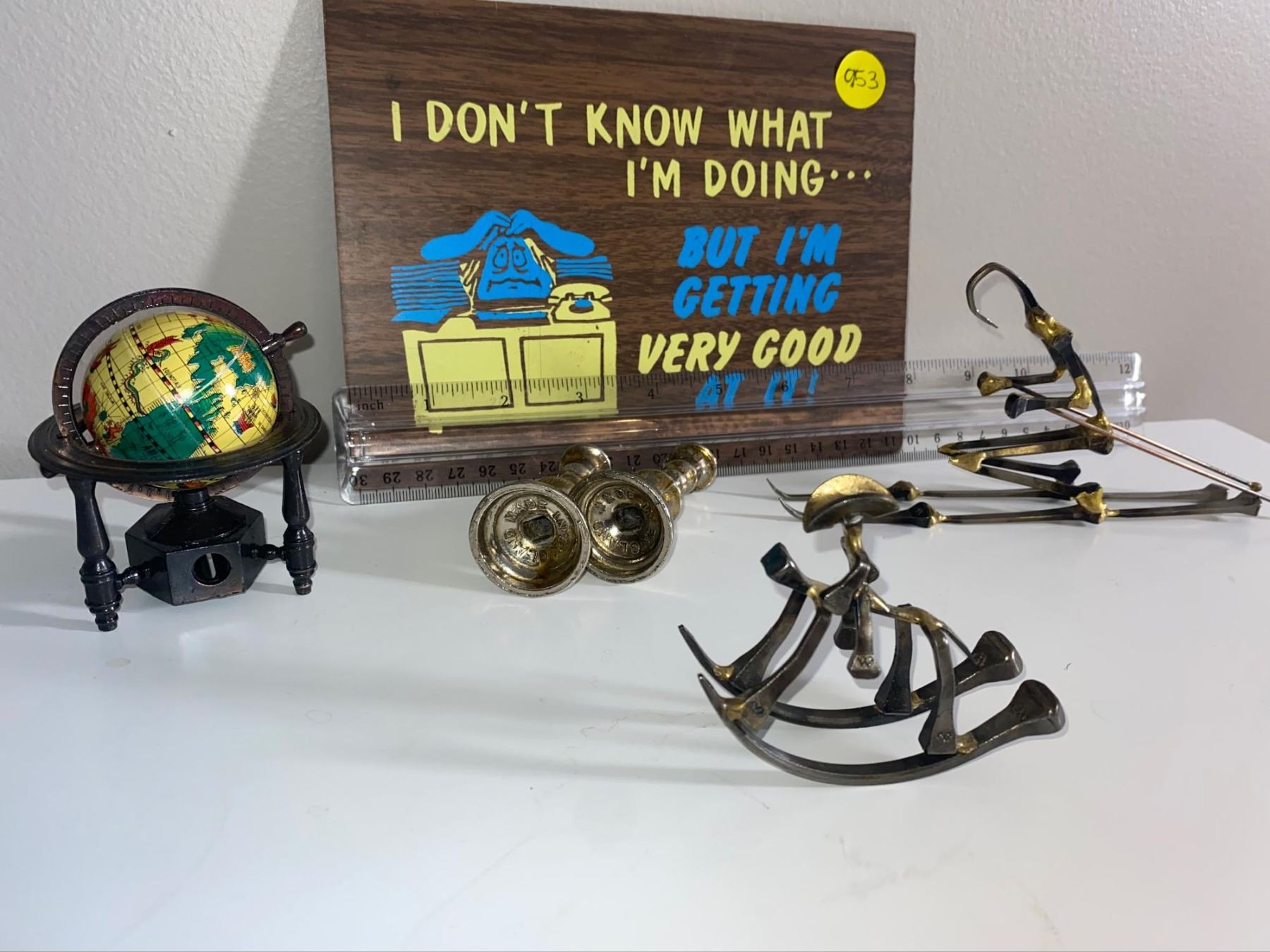Globe pencil sharpener, handmade ornaments from horse shoe, nails, vintage sign and mini candle hold