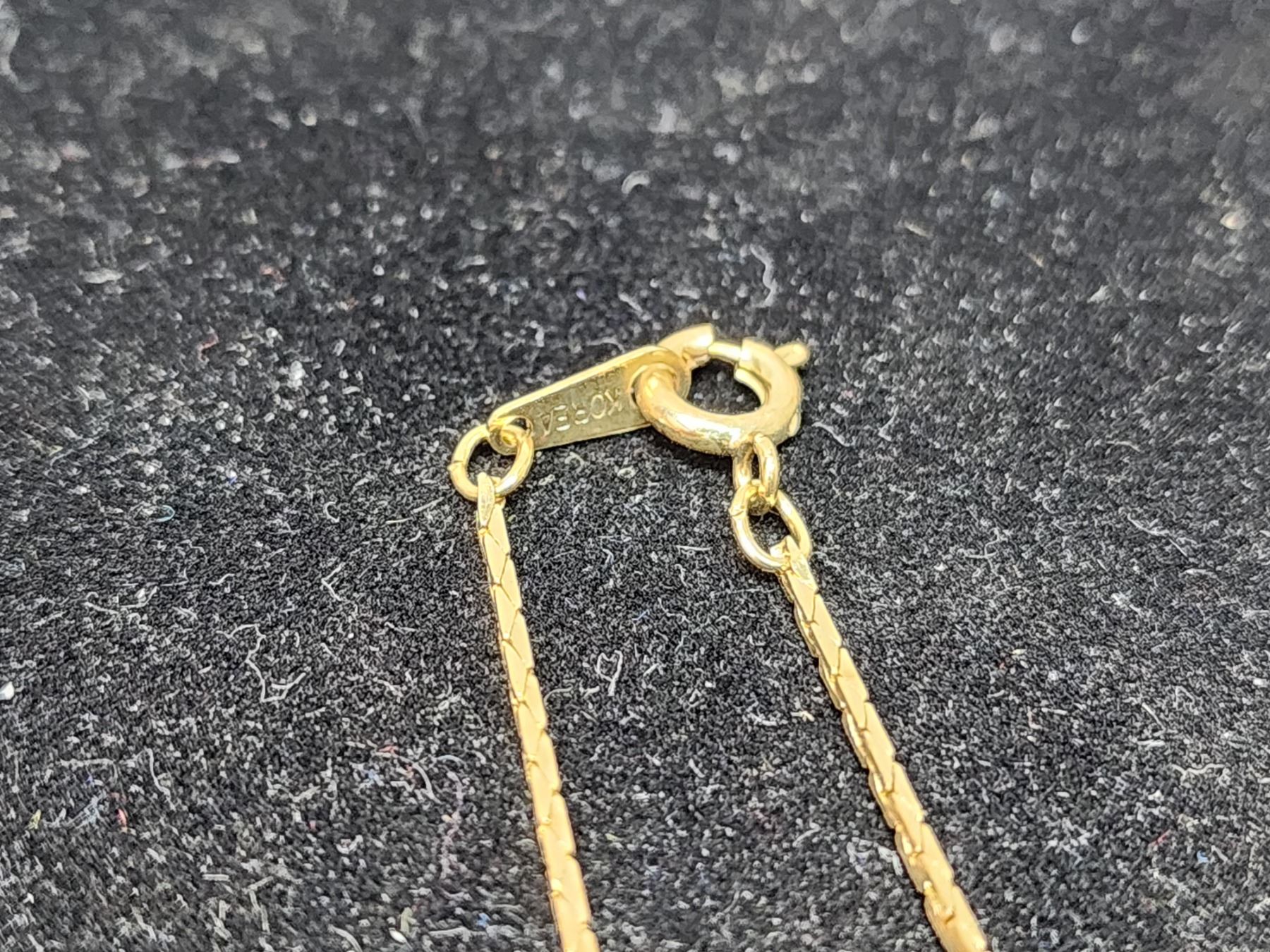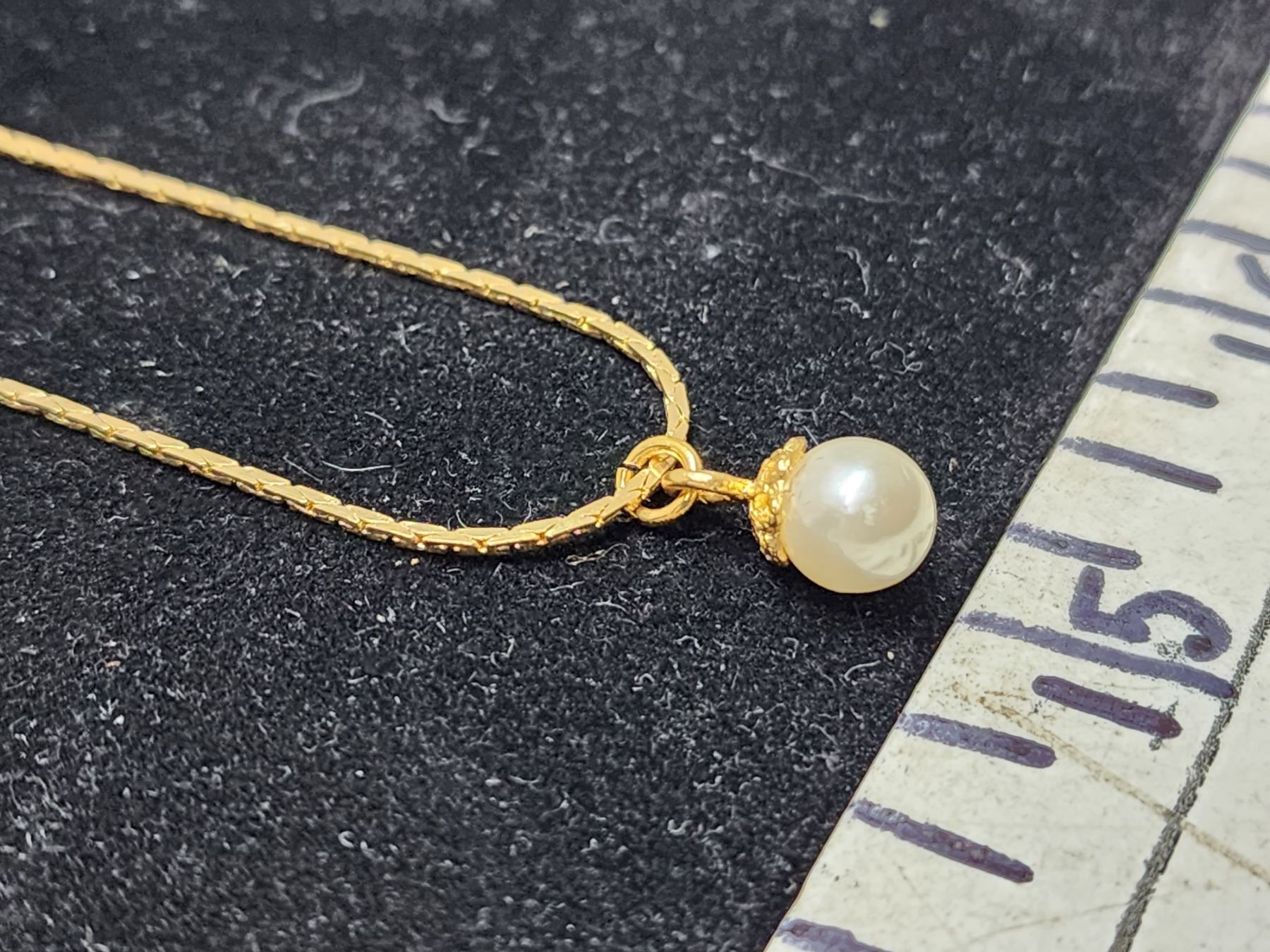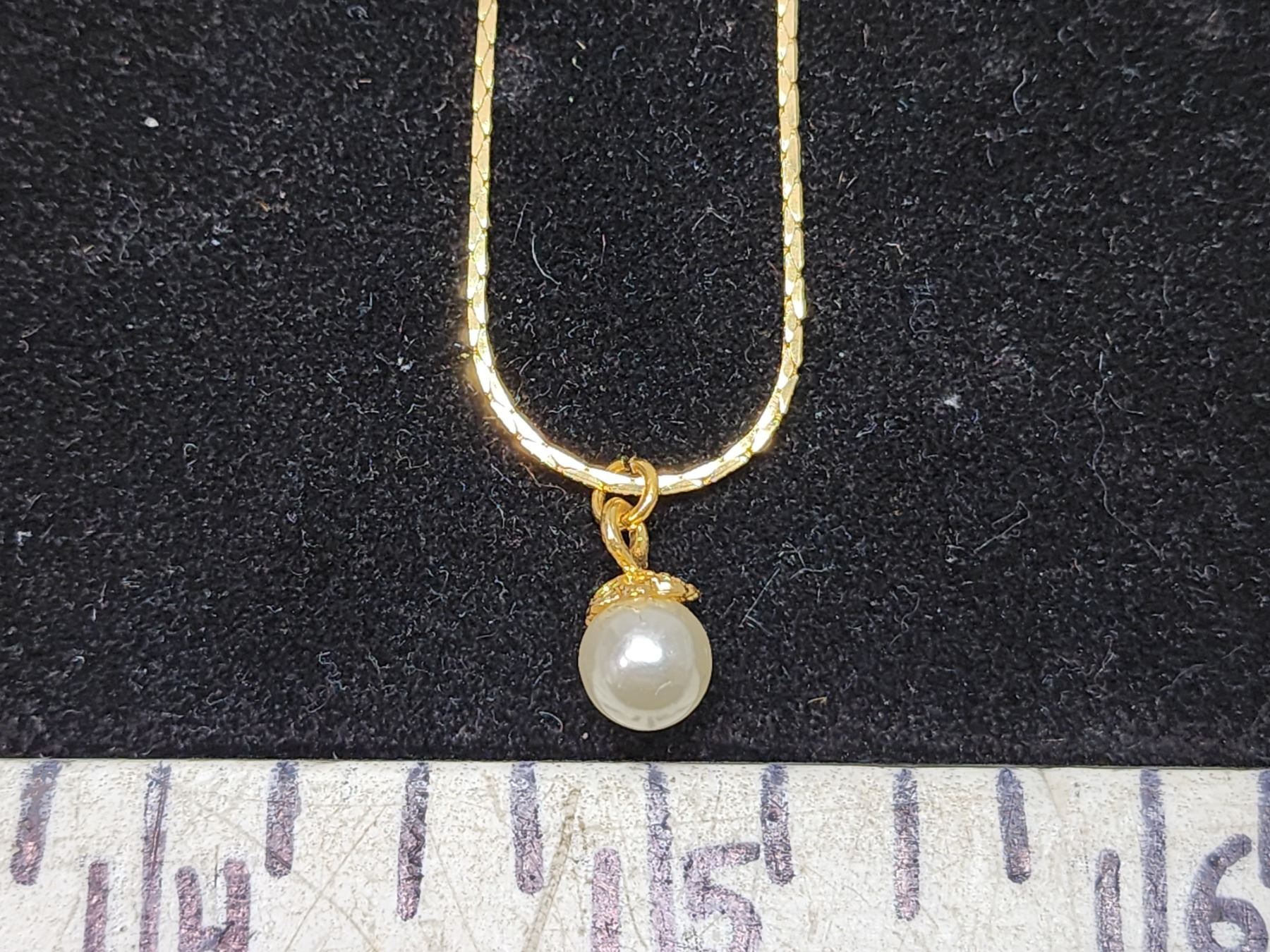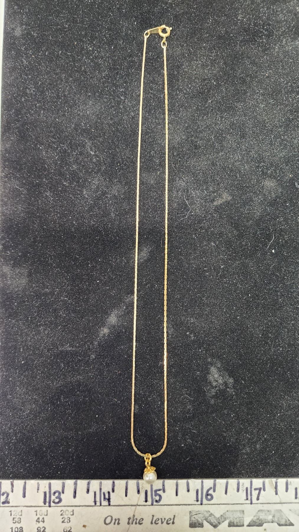 Gold colored necklace, with pearl pendant (can't say pearl is real or not)