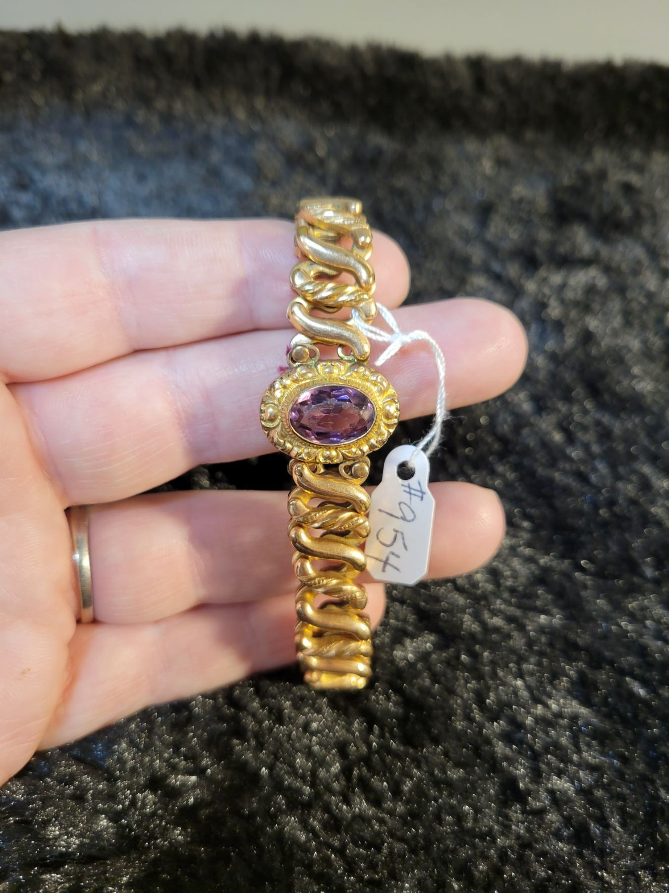 Gold plated Sweetheart expansion bracelet with faux amethyst, circa 1910