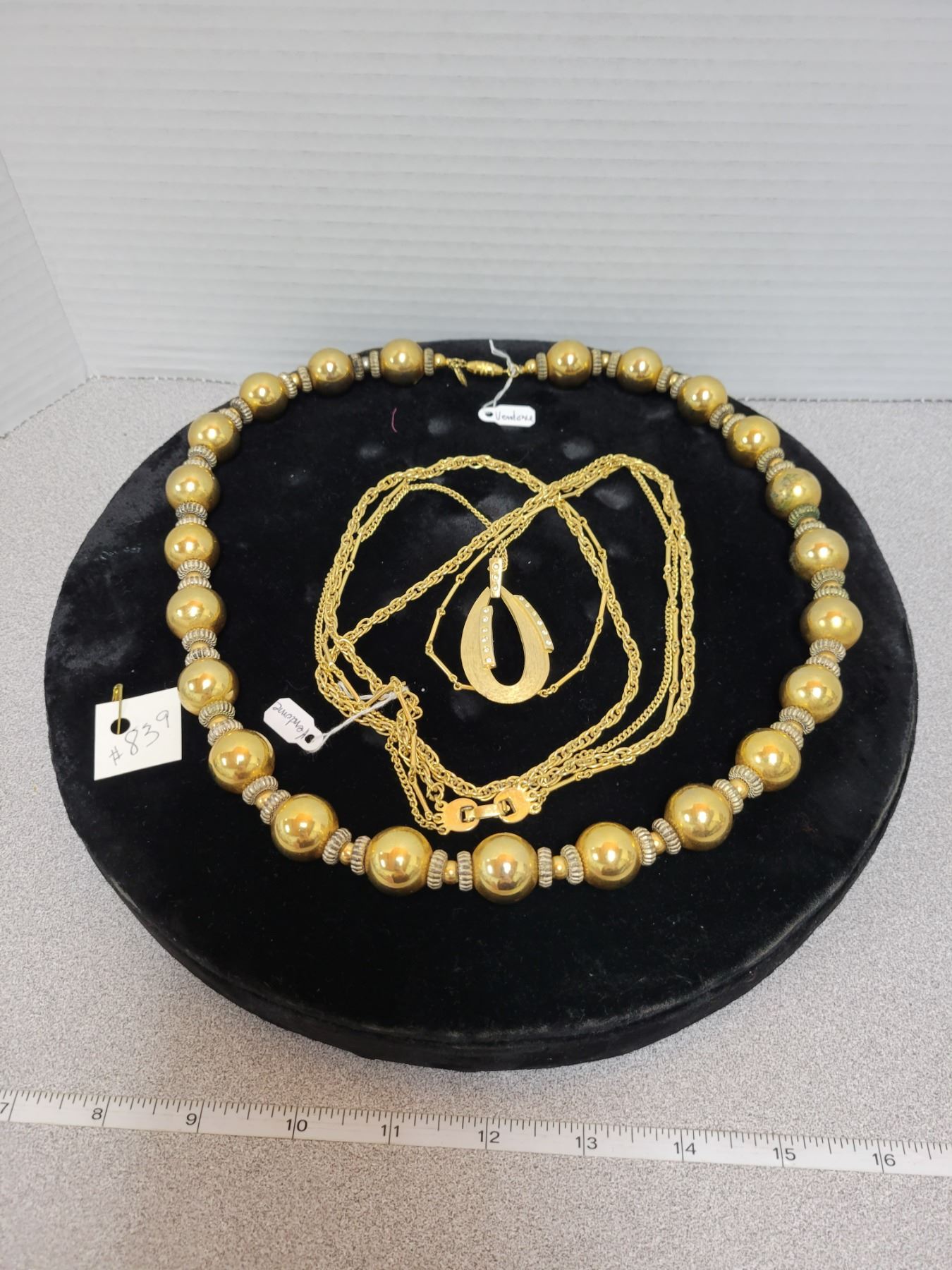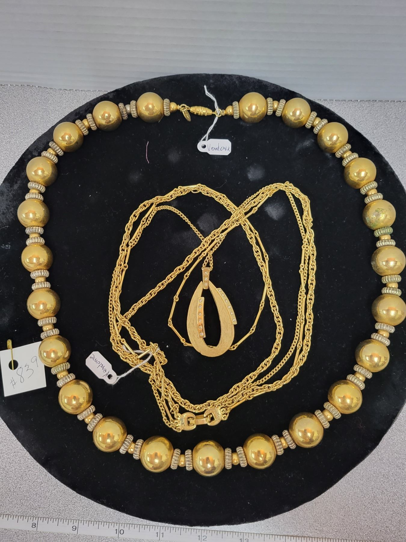 Gold tone Vendome necklaces (2) and velvet display