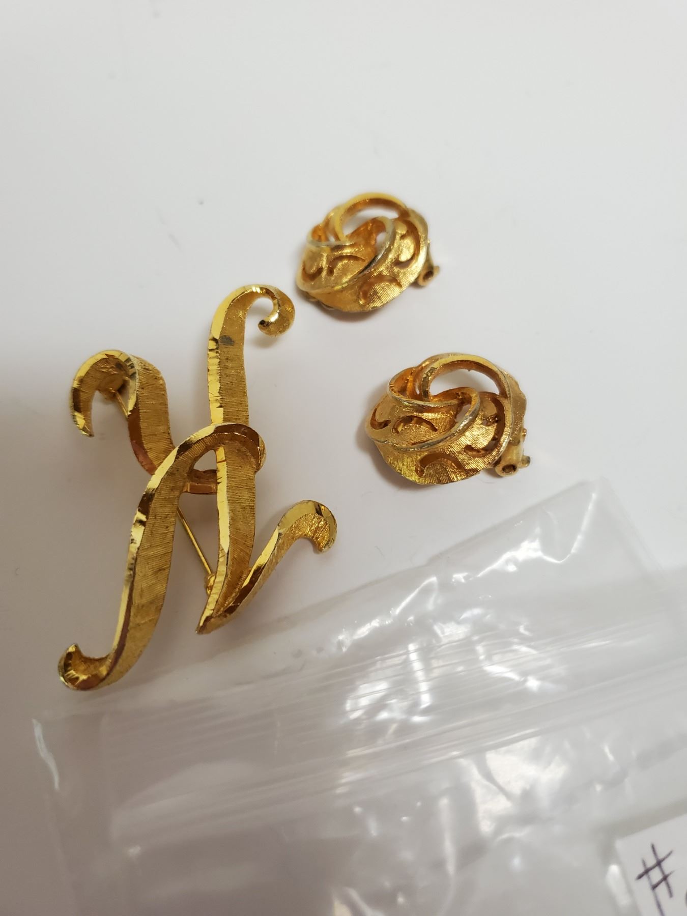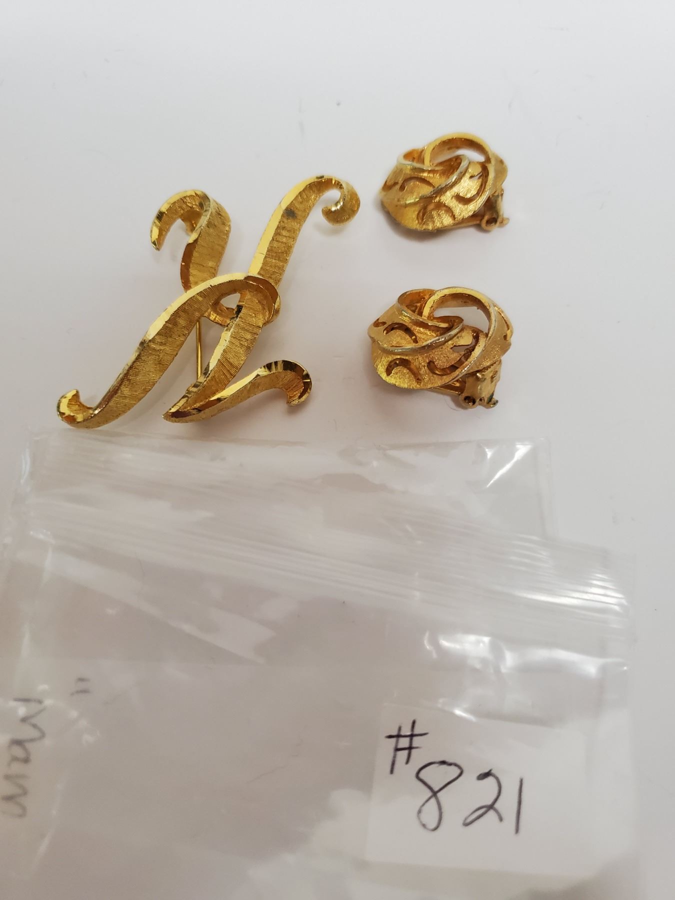 Gold tone broach and clip earring set, “Mamselle”