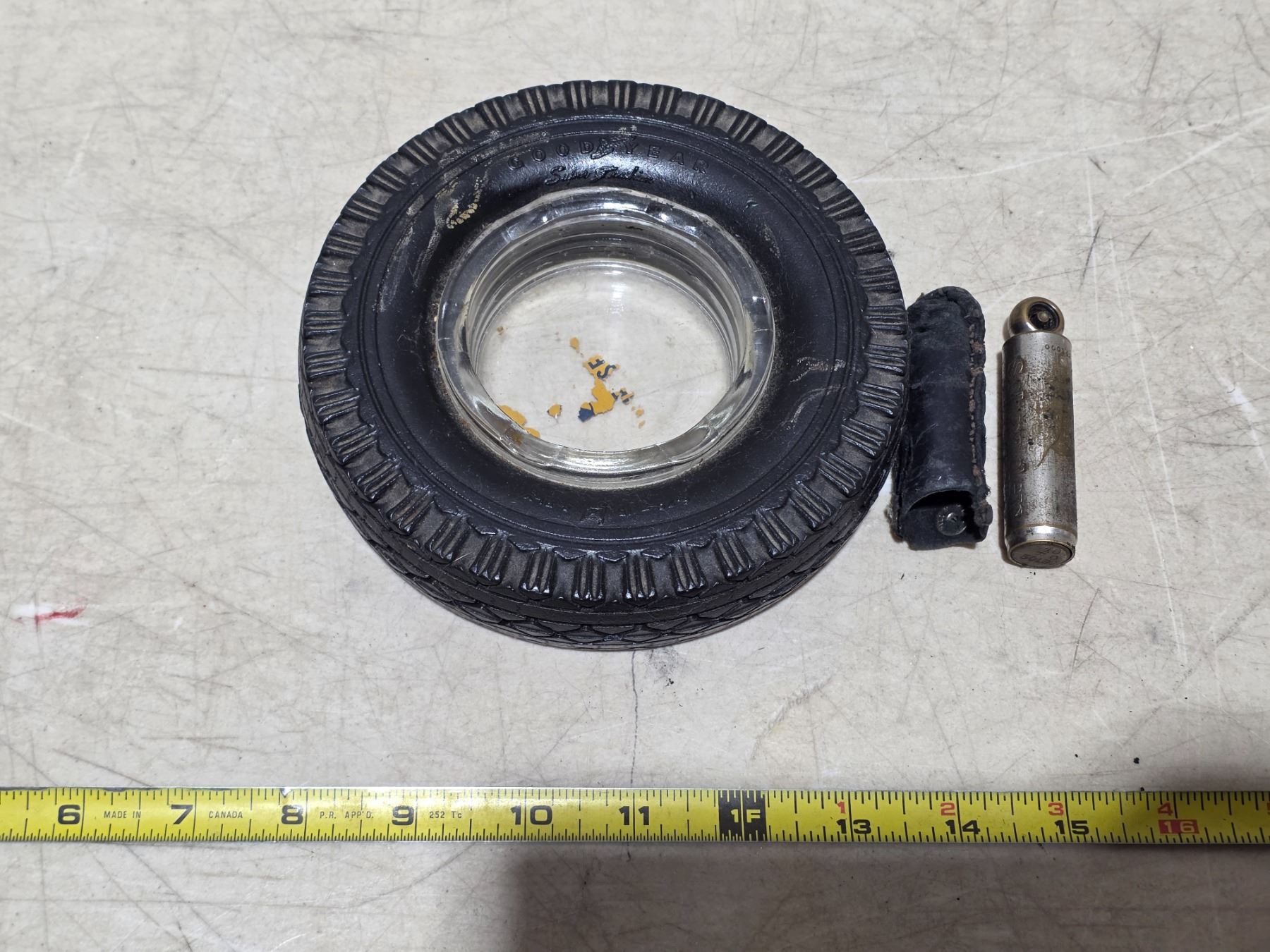 Goodyear tire ashtray and Schrader tire pressure gauge