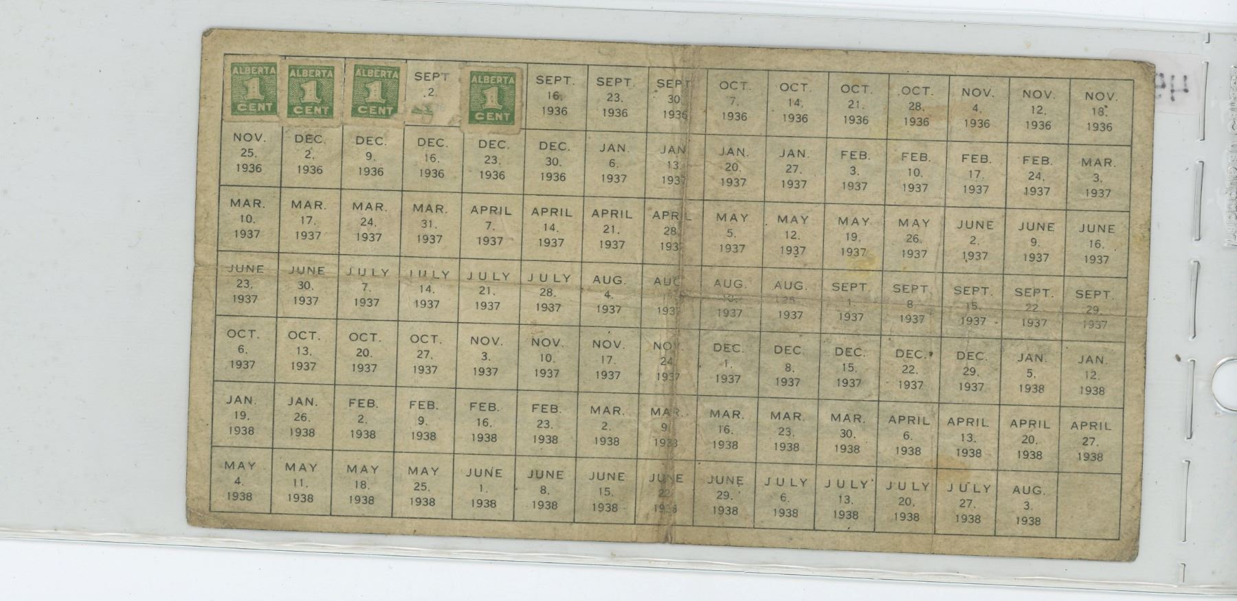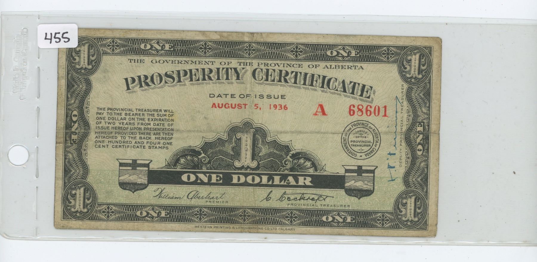 Government of Alberta 1936 $1 Prosperity Certificate with 4 stamps on the reverse. Issued by the Social Credit government of Wild Bill Aberhart. VG-8.