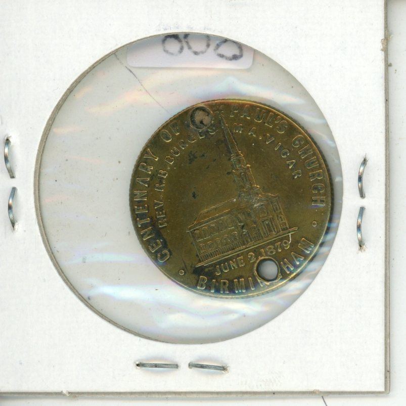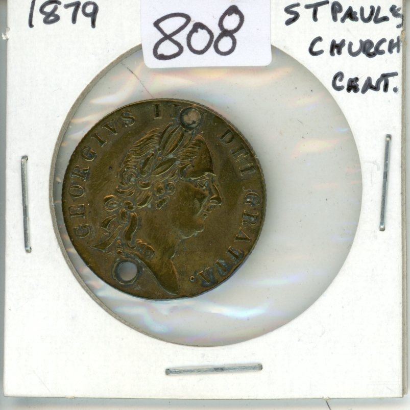 Great Britain. 1879 100th Anniversary of St. Paul’s Church Medal. King George/Church. Holed for suspension. VF.