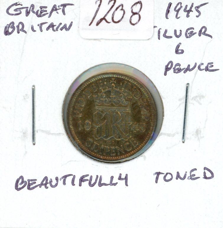 Great Britain. 1945 Silver 6 Pence. Last year of World War II. Beautifully Toned.