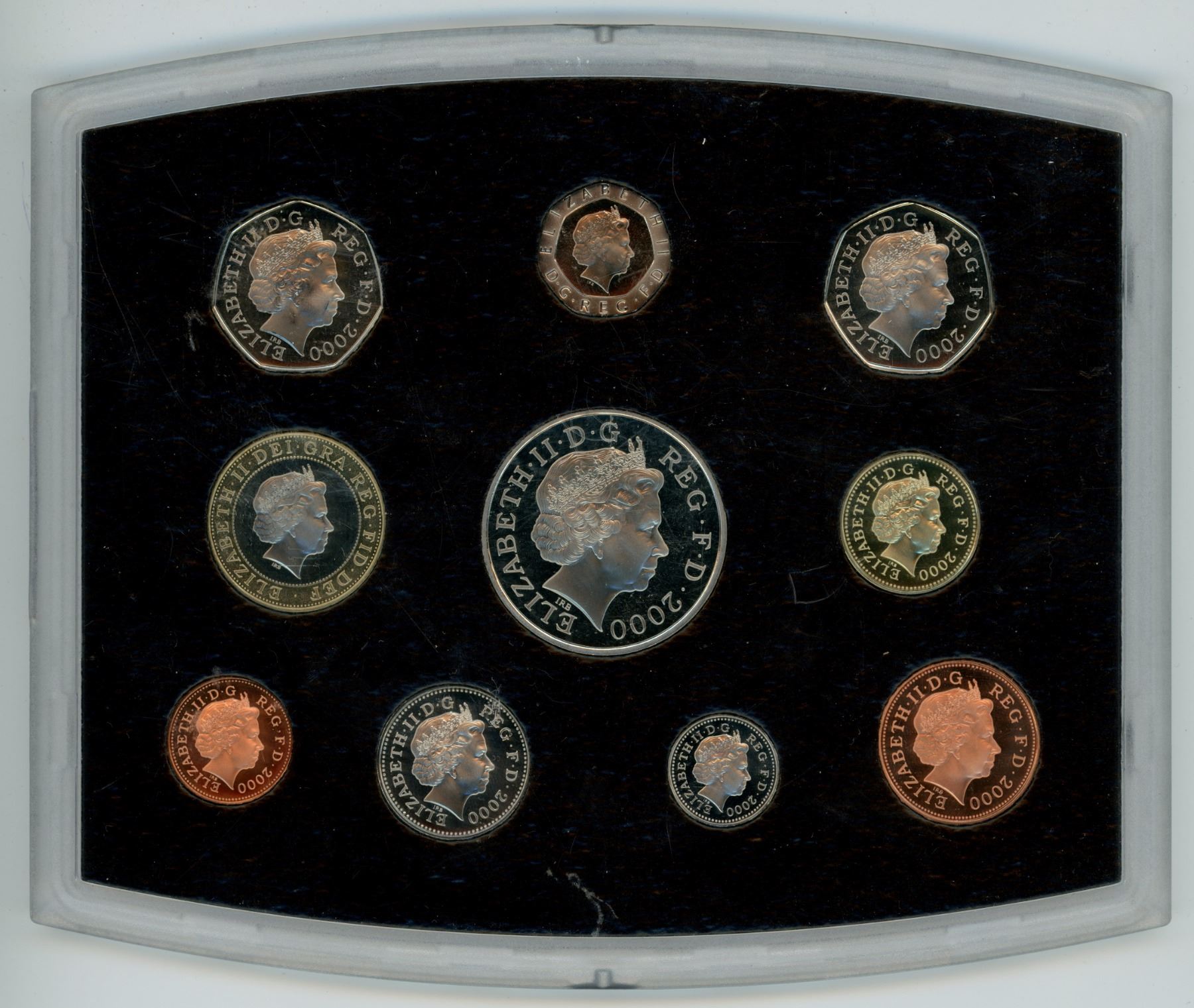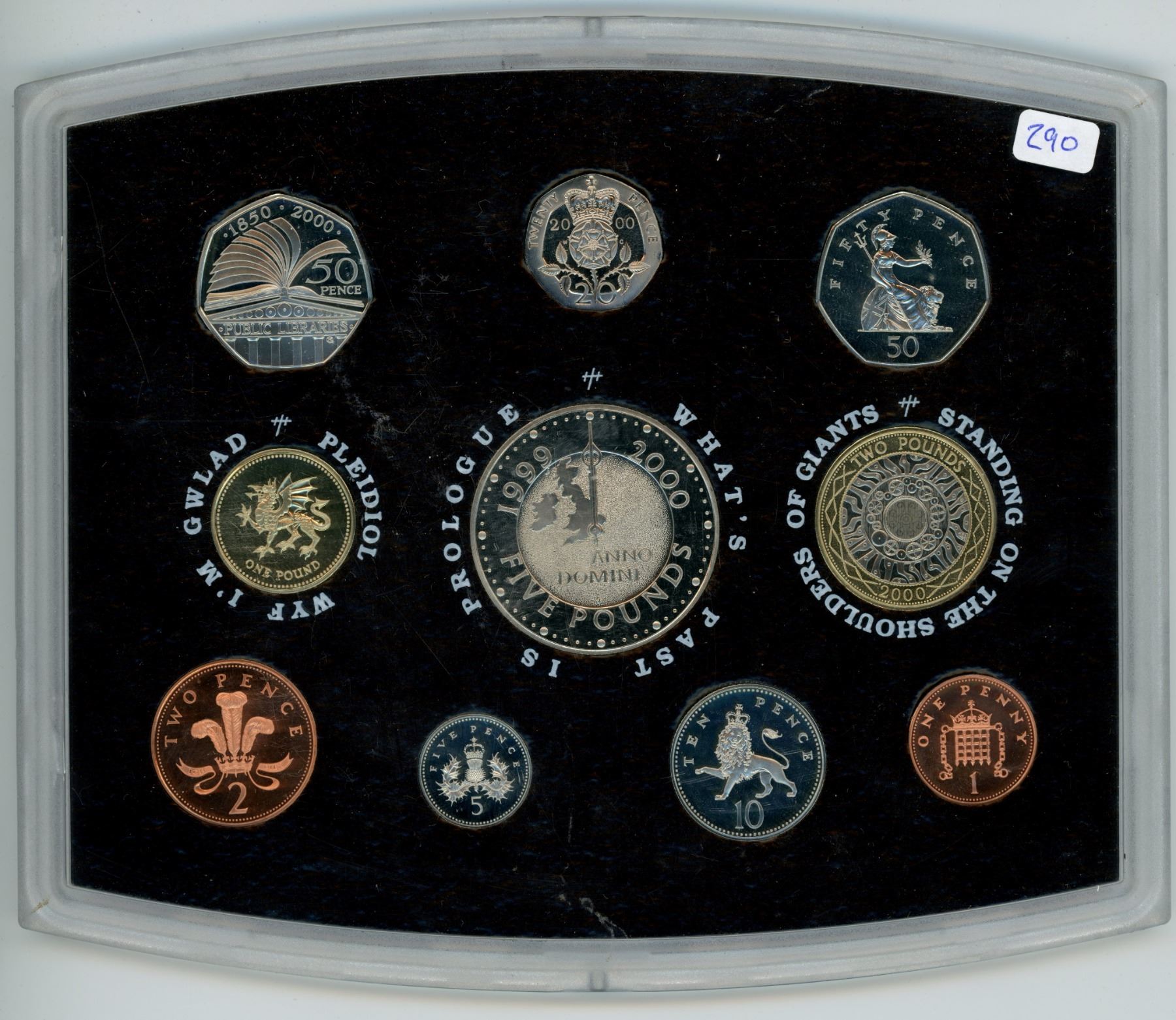 Great Britain. 2000 Proof Set. Includes Millennium Silver 5 Pounds, Commemorative bi-metallic 2 Pounds & Welsh dragon 1 Pound plus 7 other coins. As issued by the Royal Mint. All coins have Cameos.