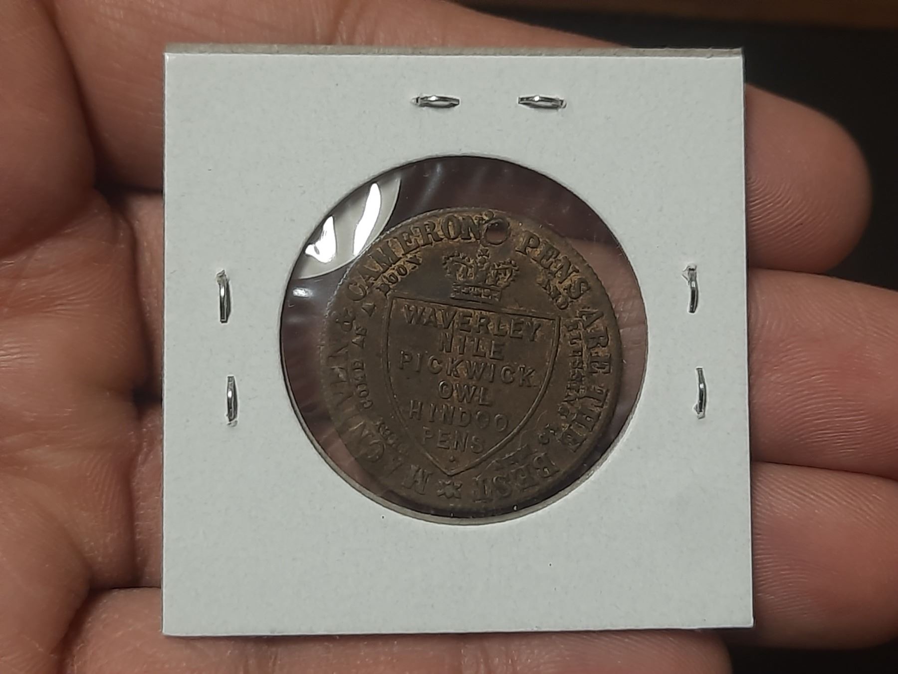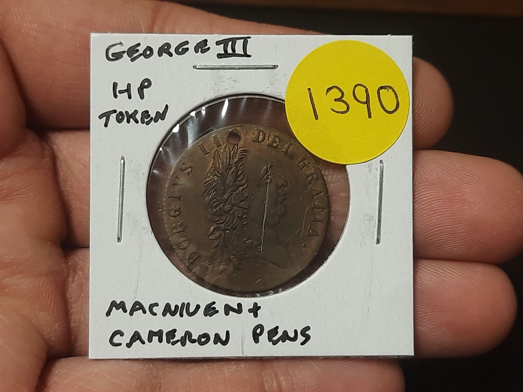 Great Britain. George III Half Penny Token. MacNiven & Cameron Pens are the Best. Holed for suspension.