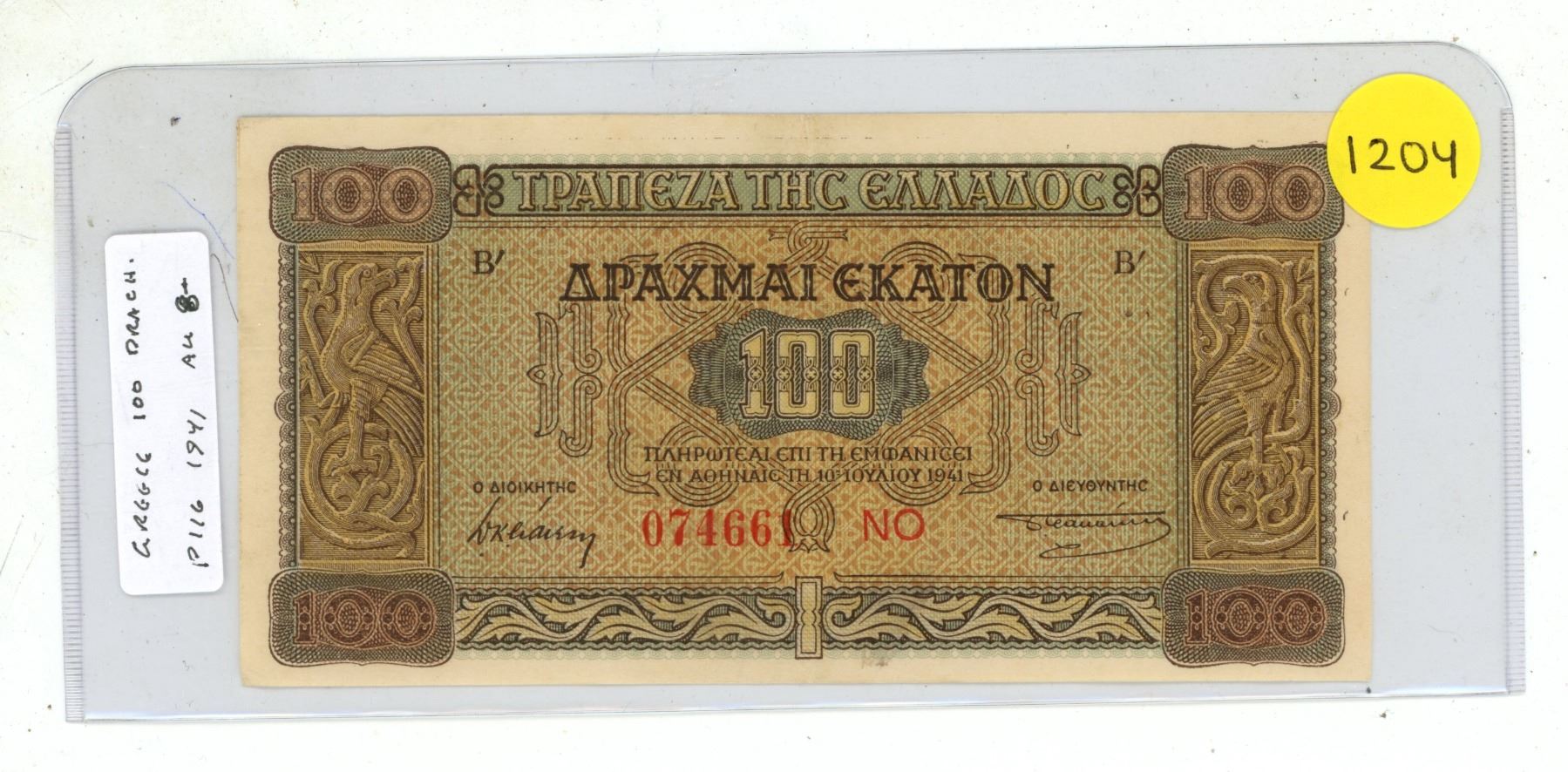 Greece. 1941 100 Drachmai. Issued during World War II. AU.