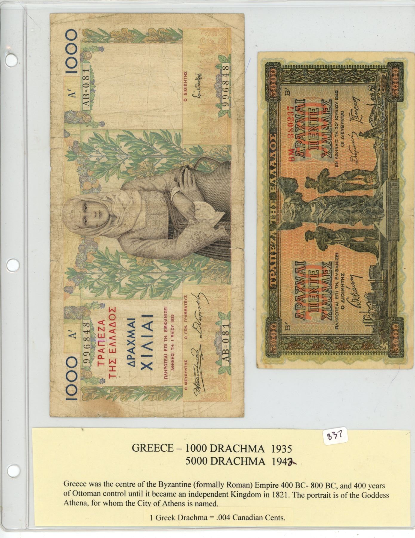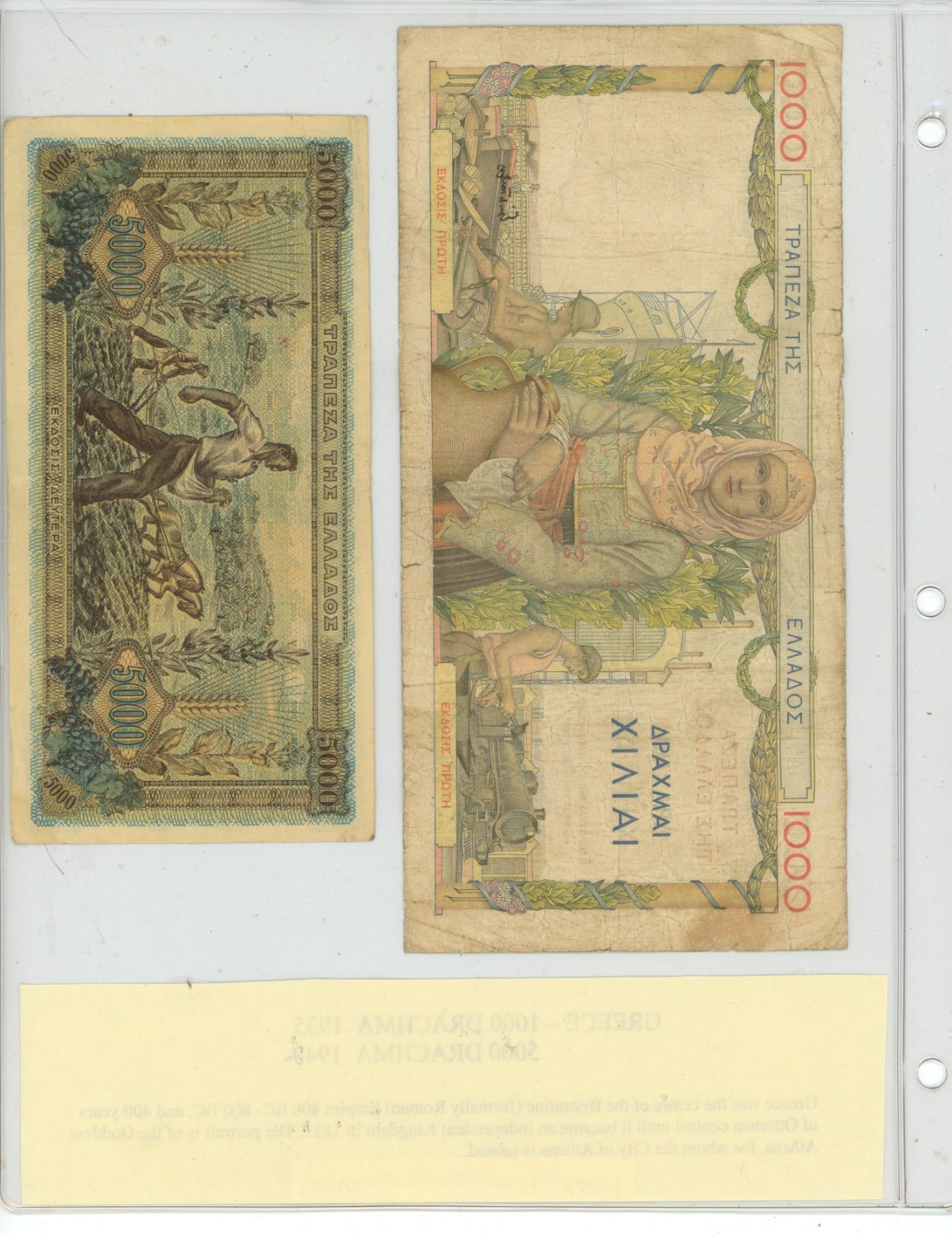Greece. Lot of 2 inflationary notes. 1935 1000 Drachma VG and 1942 World War II 5000 Drachma F+.
