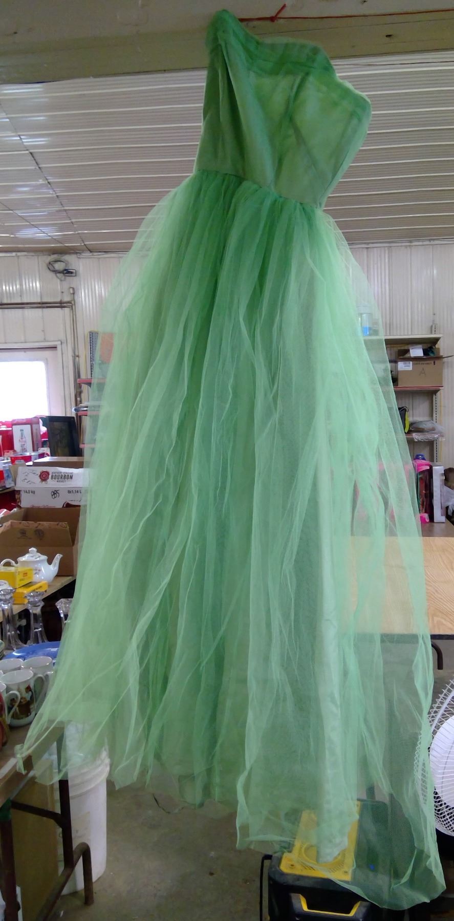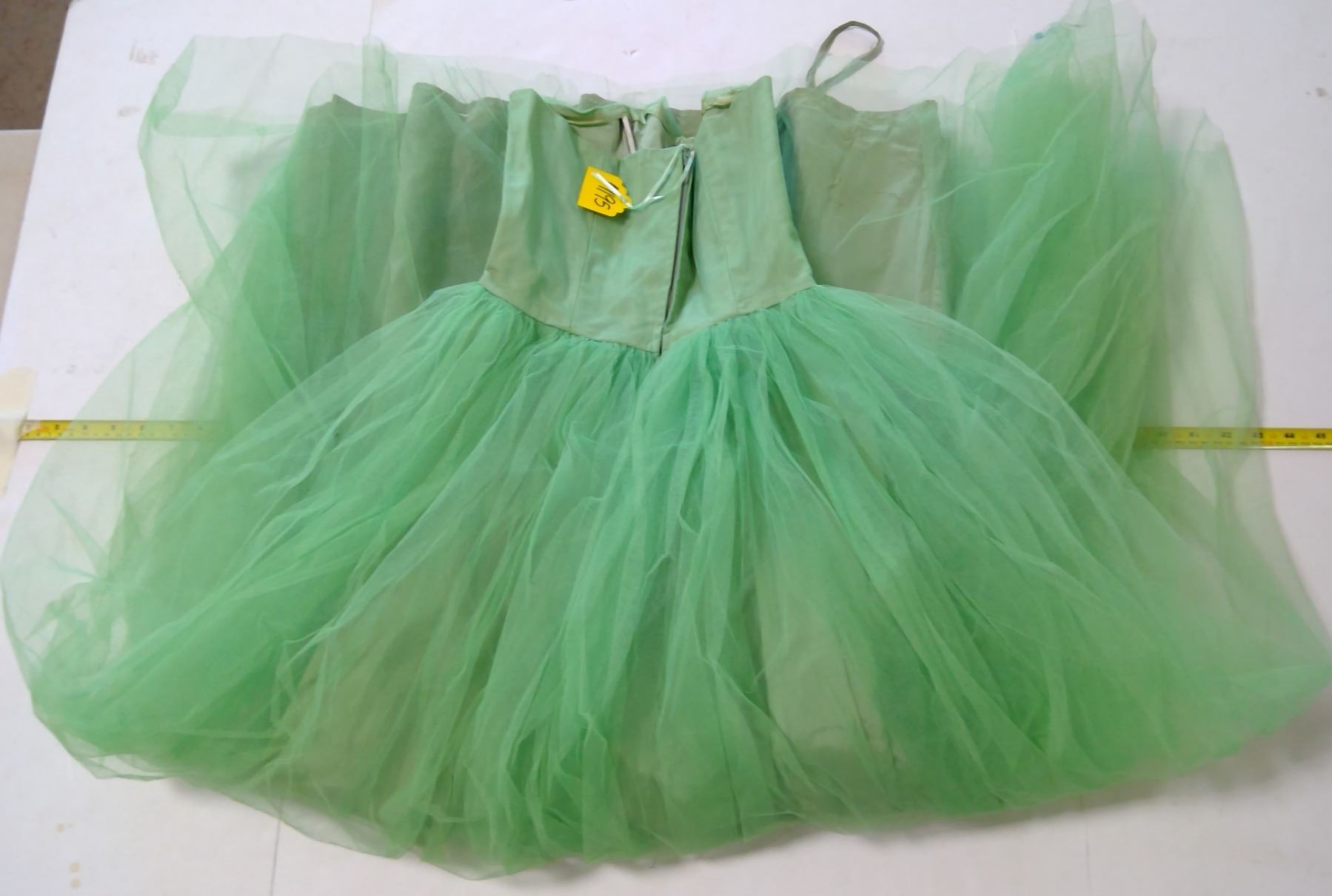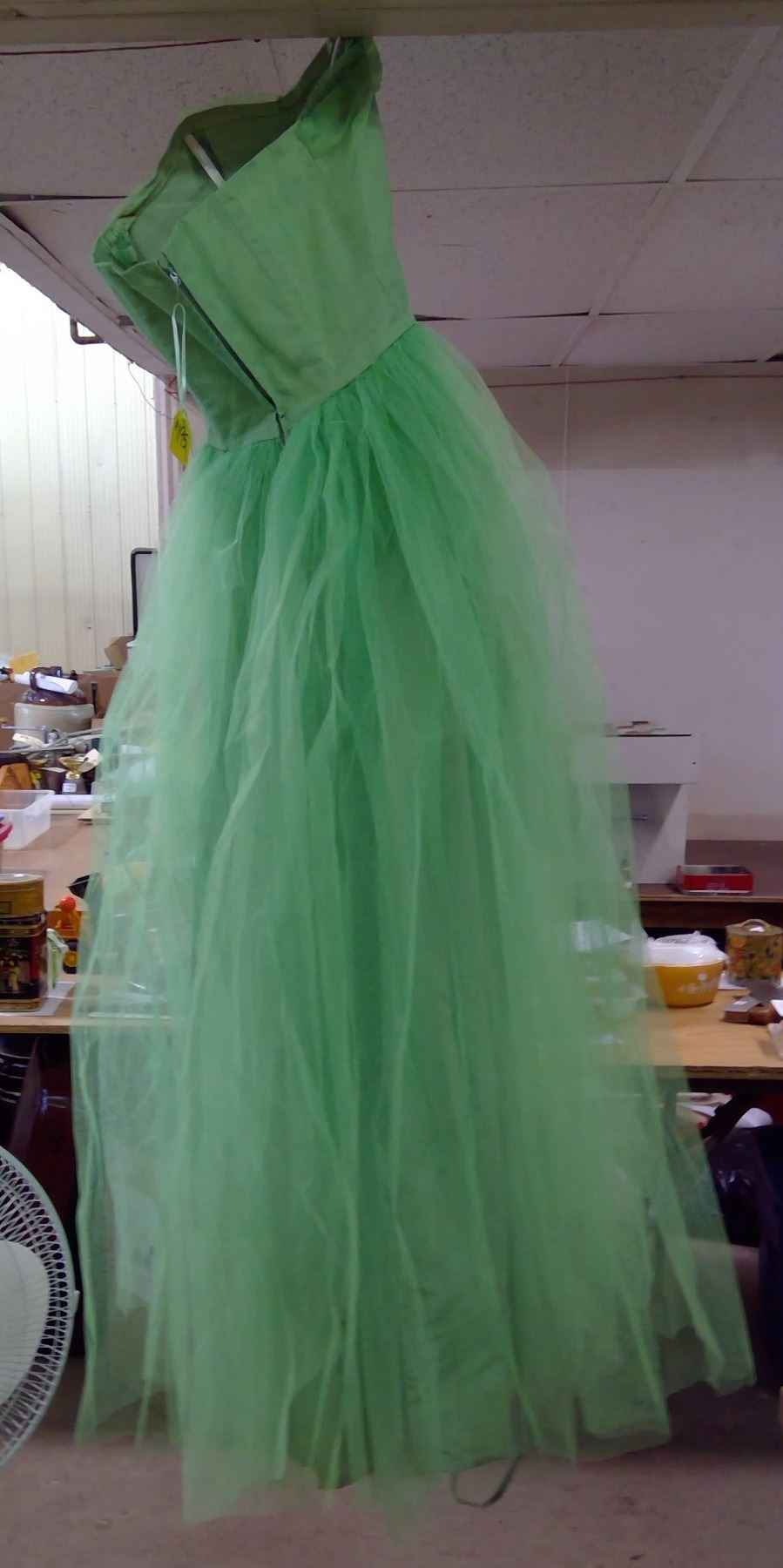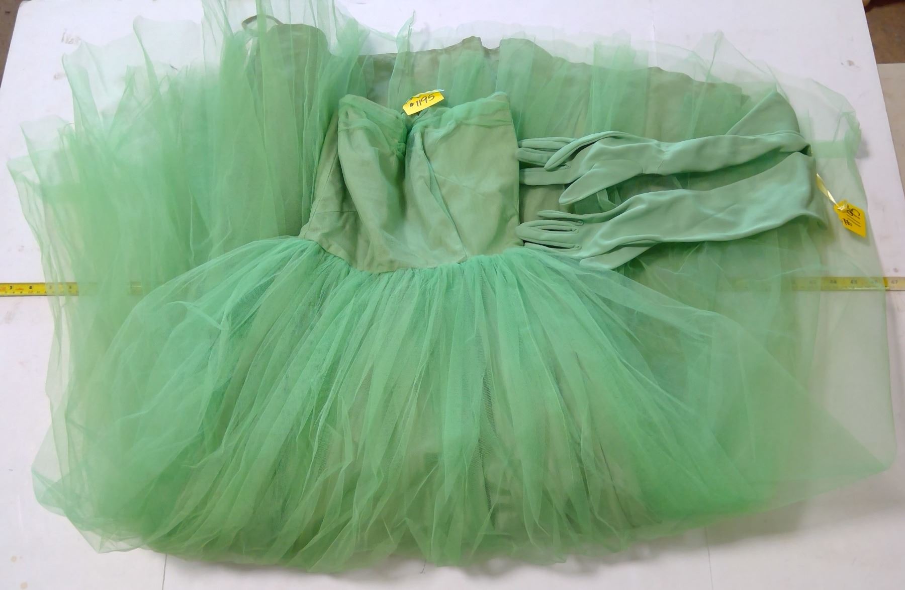 Green Tulle Evening Dress, 1950's with Green Opera Gloves, in Plastic Tub