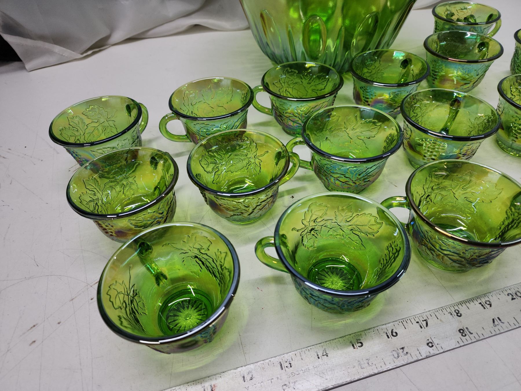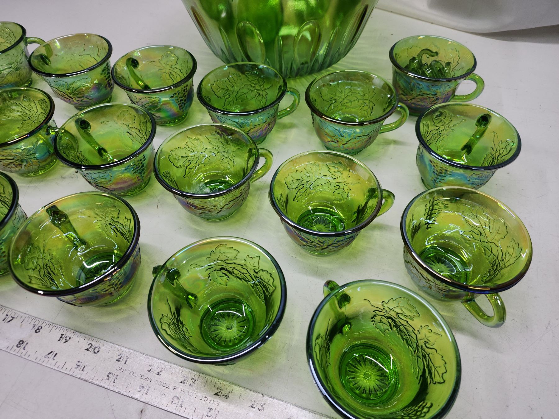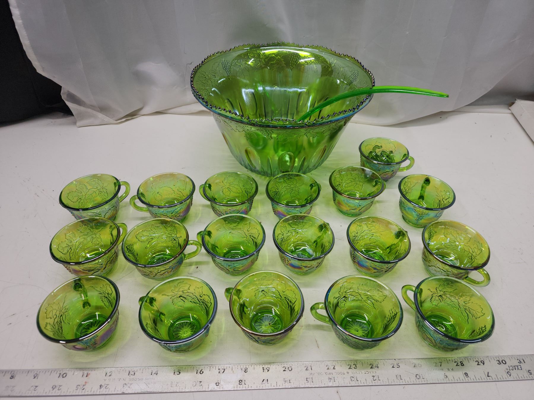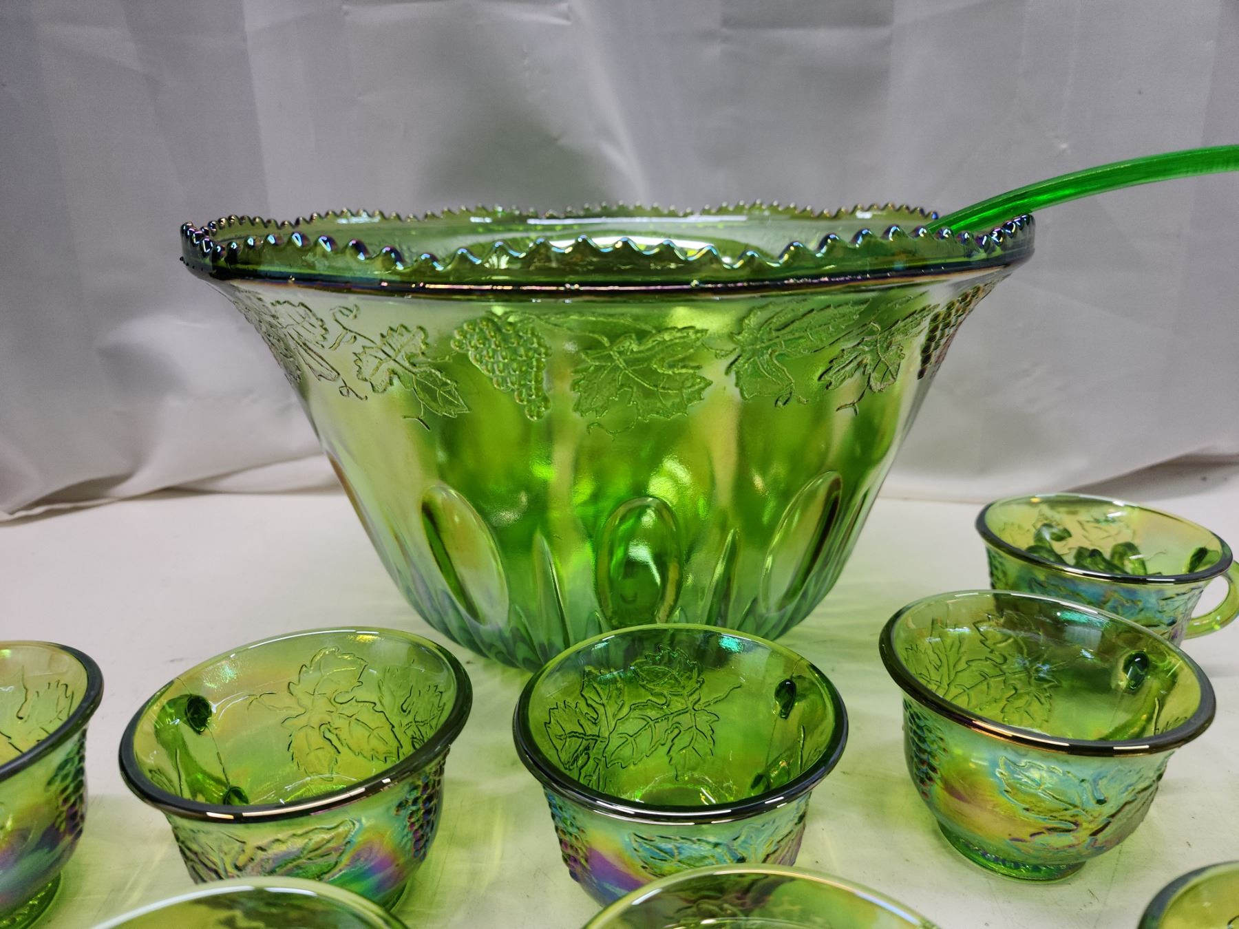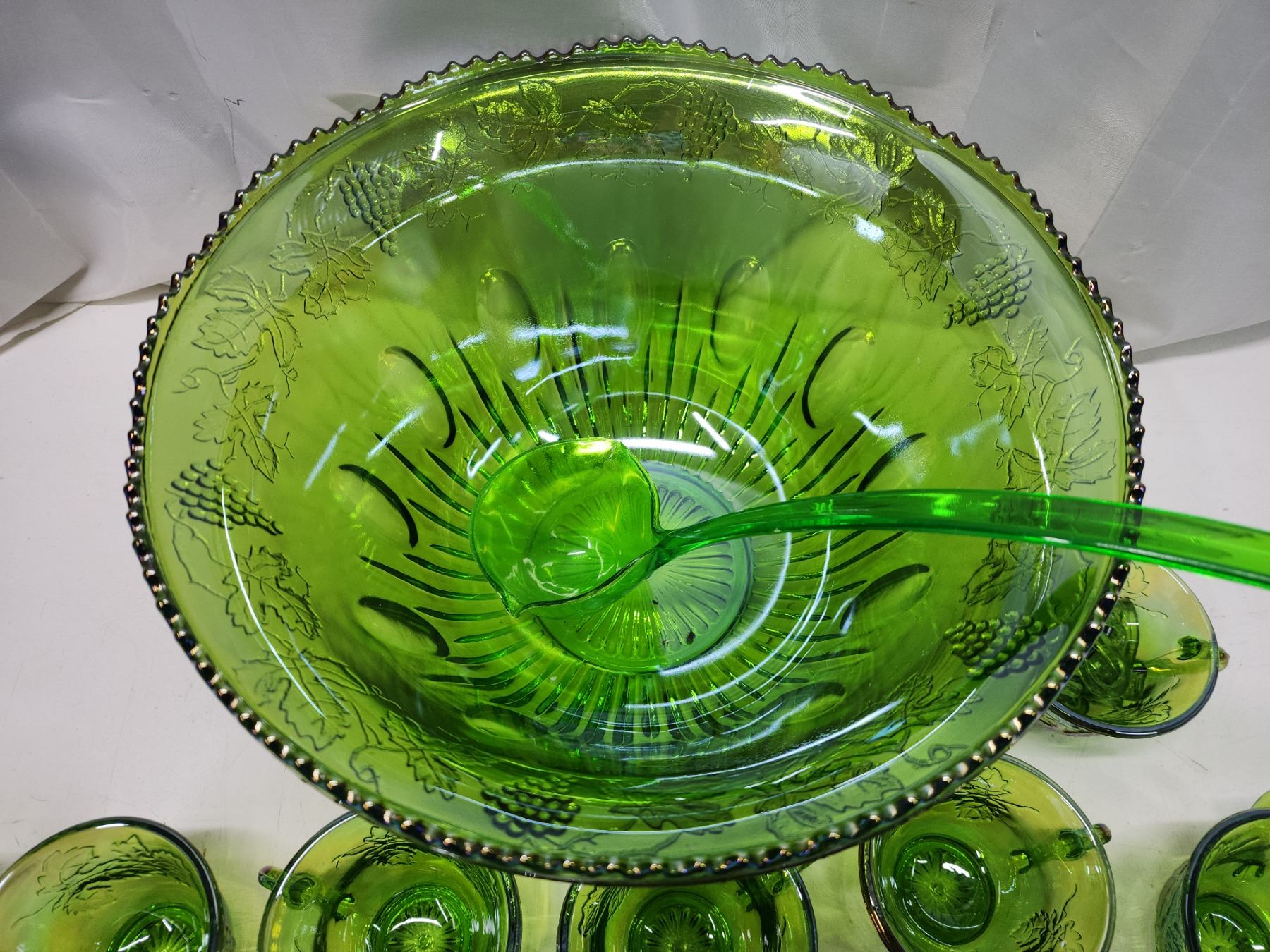 Green carnival glass punch bowl, cups, ladle & hooks