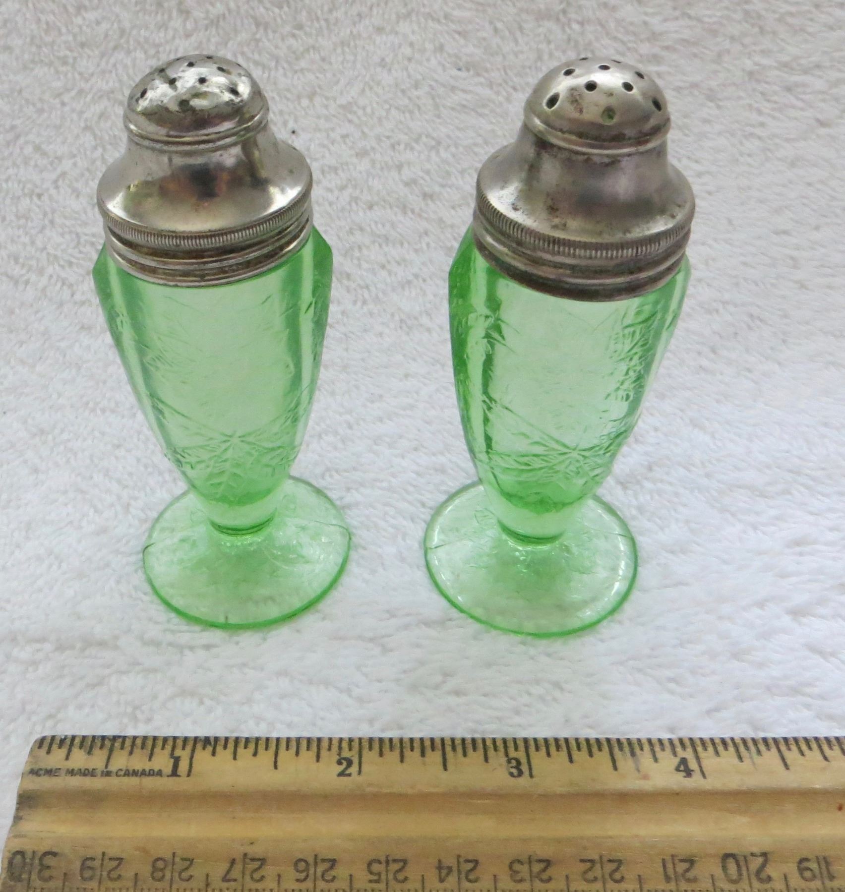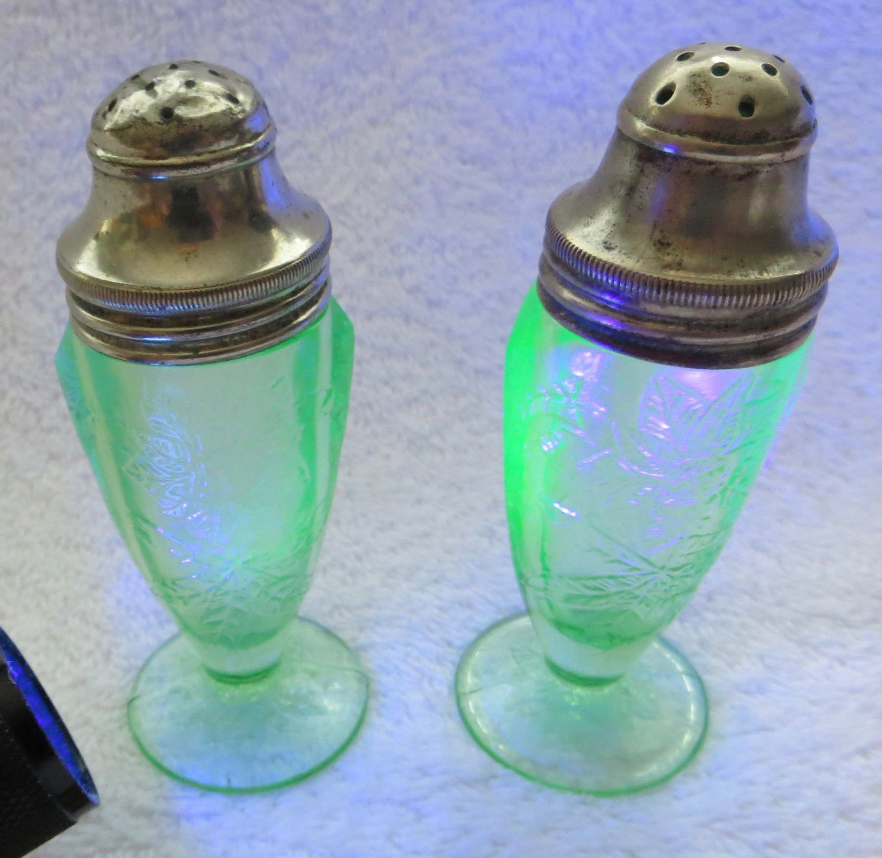 Green depression glass Uranium glass salt & peppers - floral pointsettia pattern