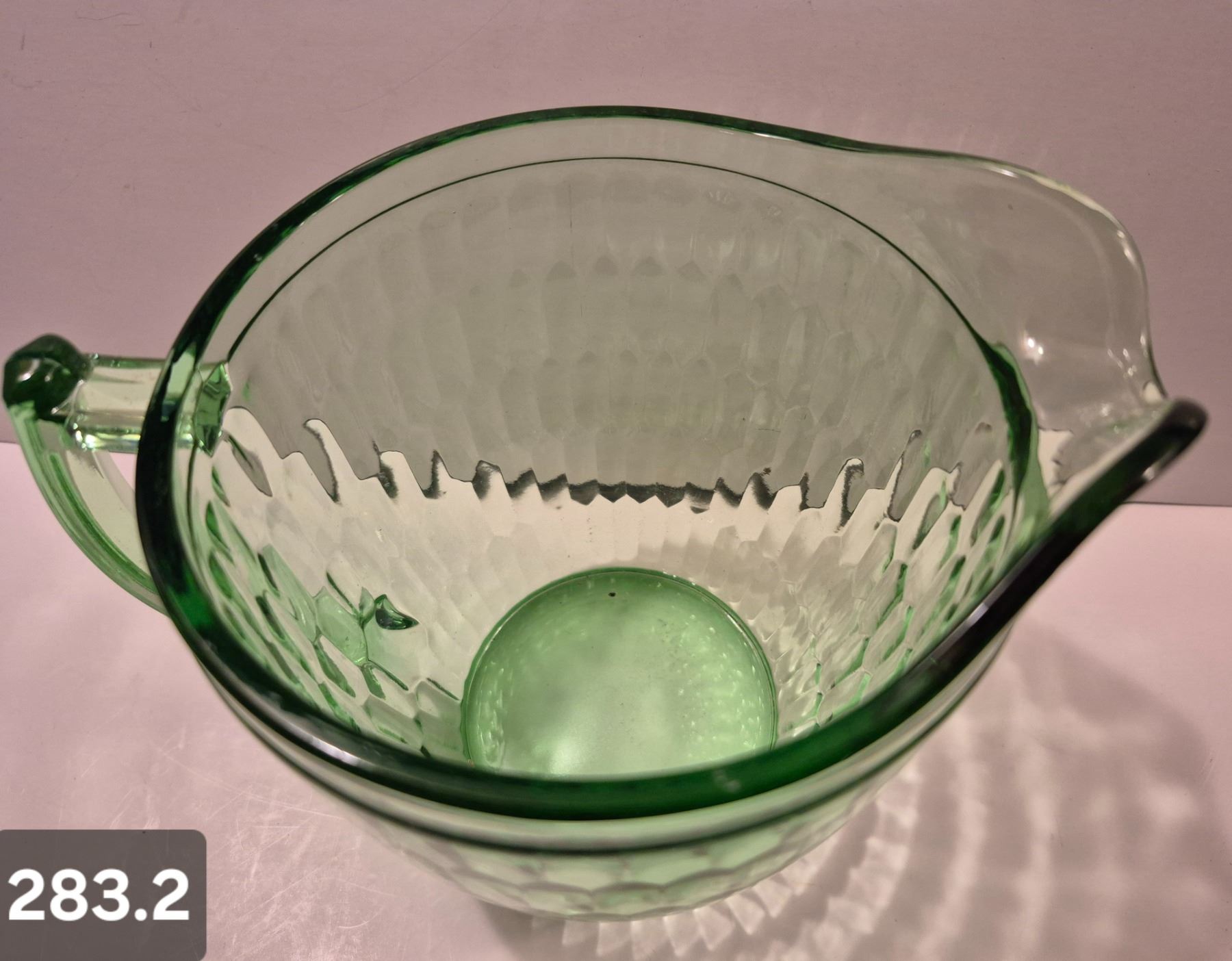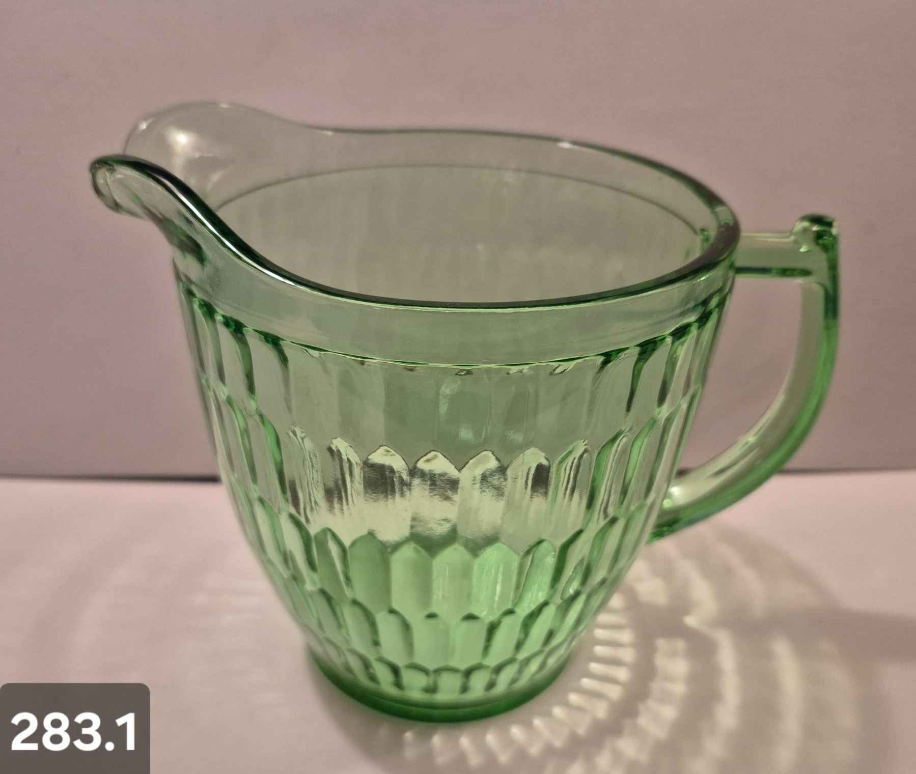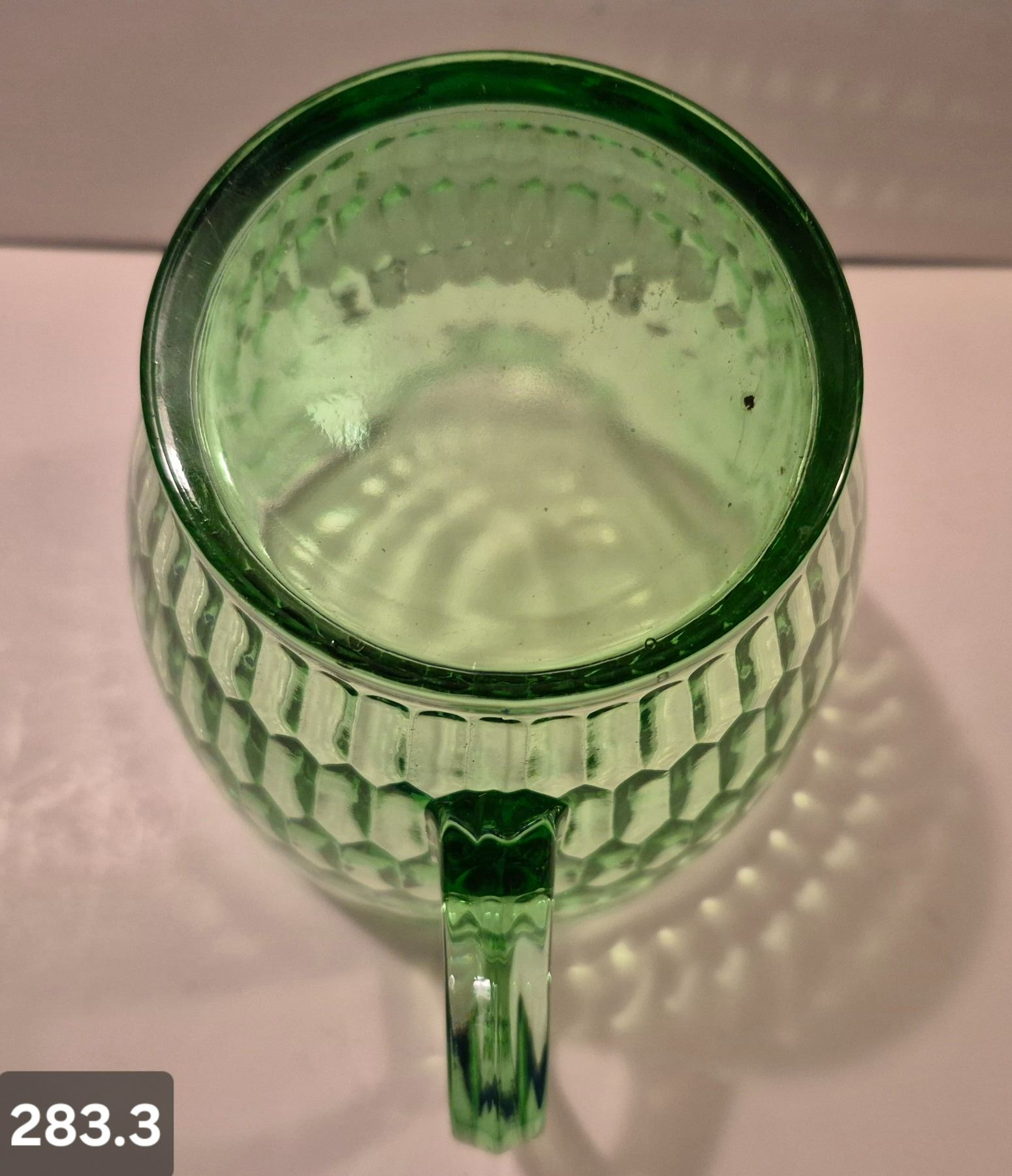 Green depression glass water/milk pitcher - 5 1/2 inches tall, no damage