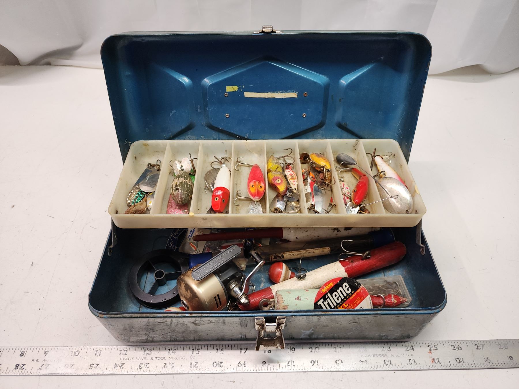 Green metal tackle box, c/w accessories