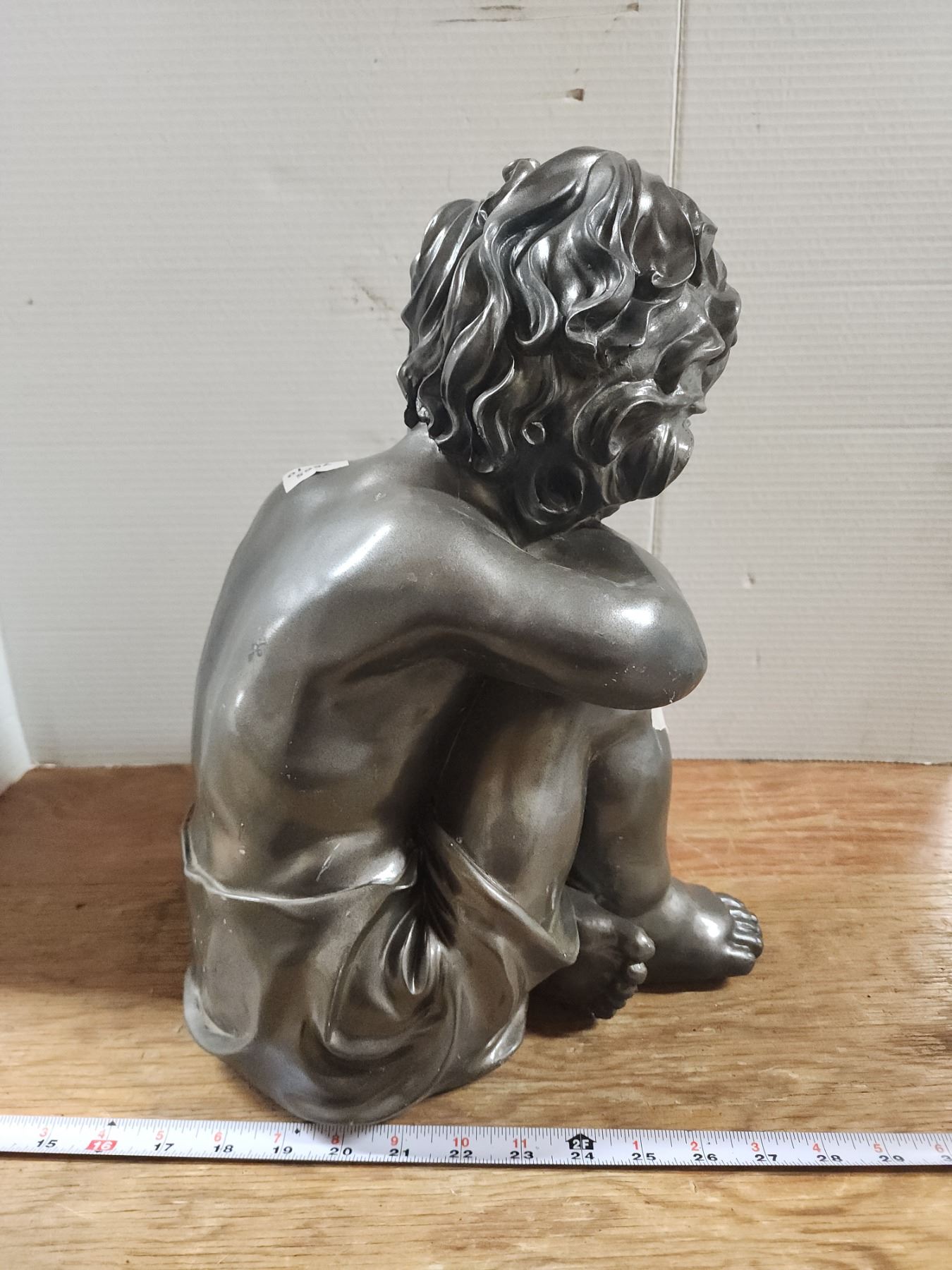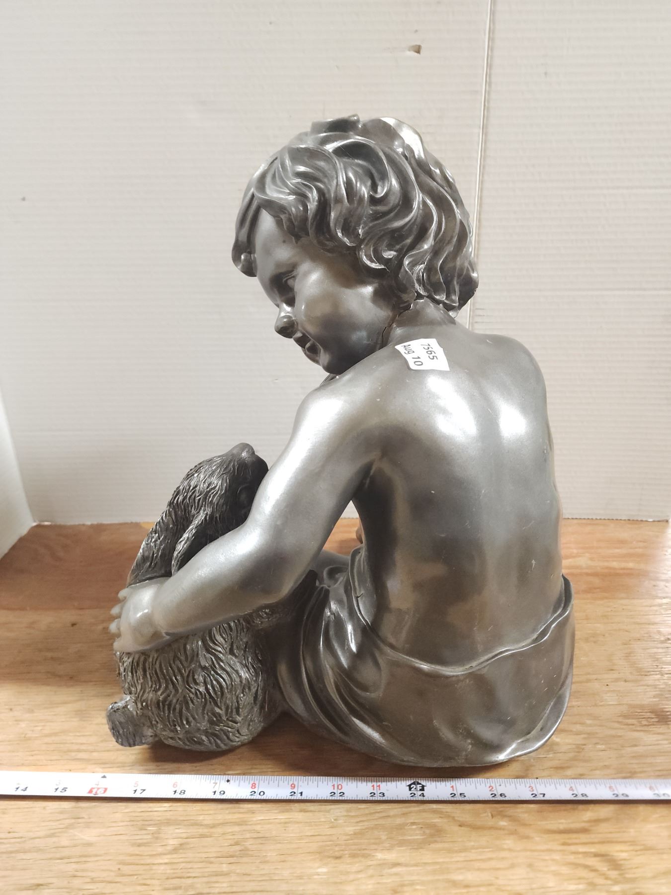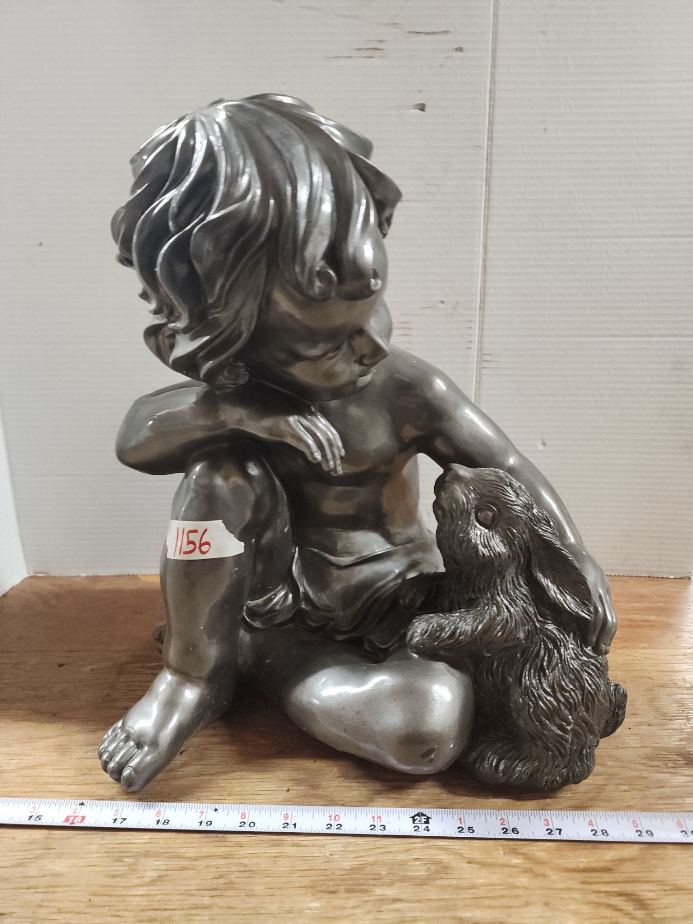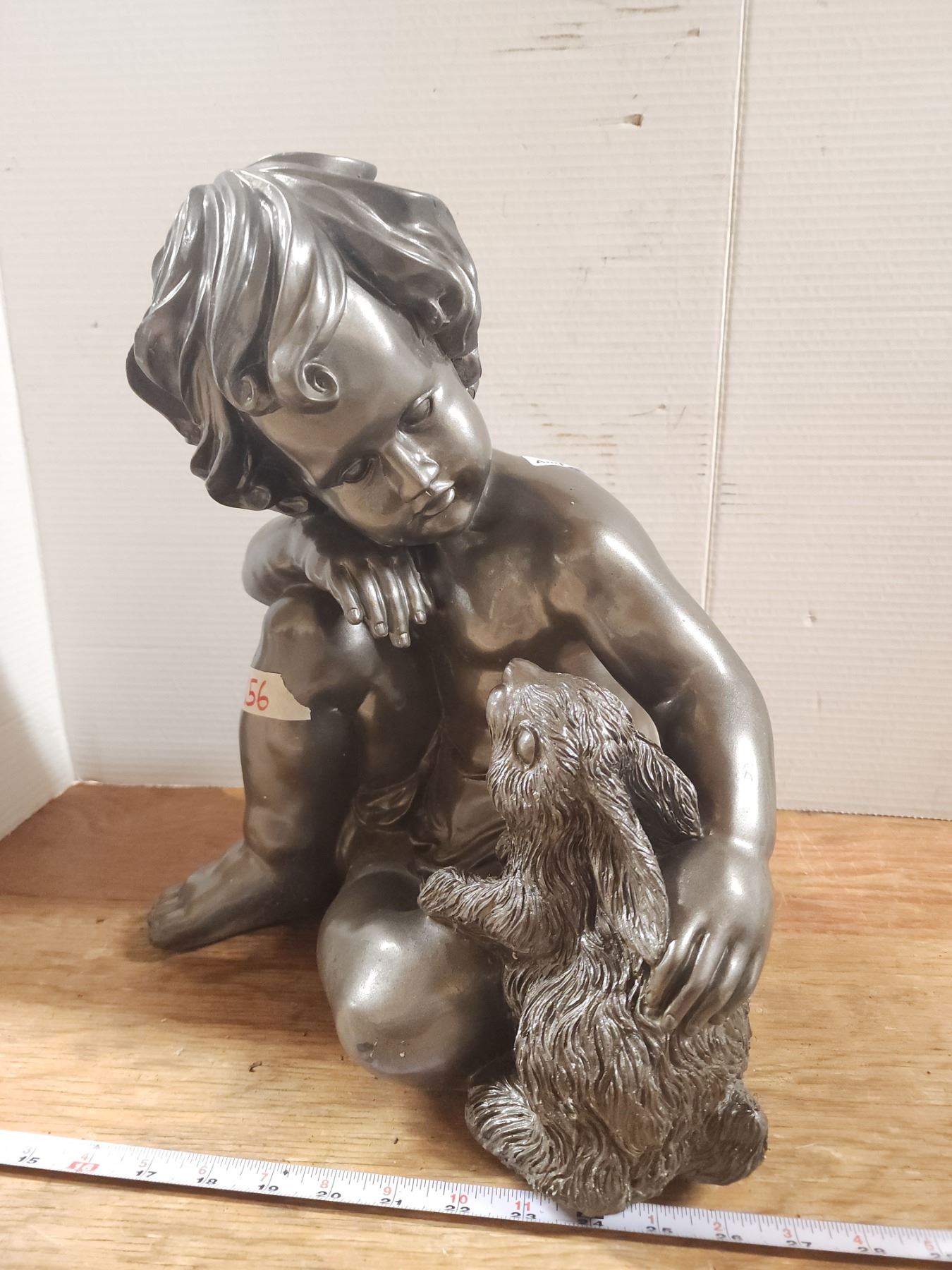 Grey boy and rabbit statue garden statue - cracked neck - 16"H - heavy