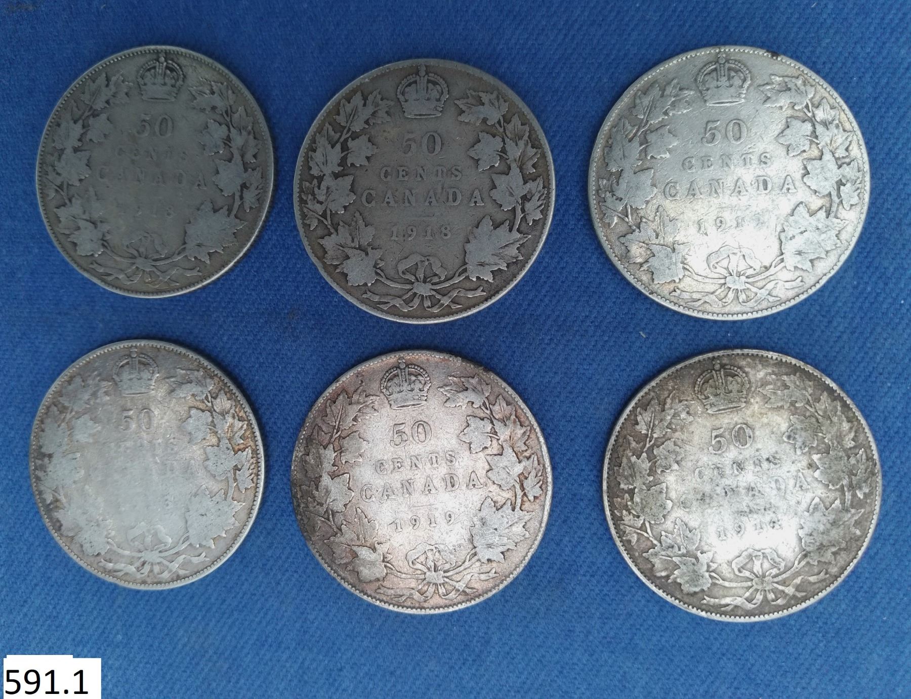 Group of 6 Canadian half-dollars, 50-cent pieces, including - 1914, 1916, 2-1918, and 2-1919 - Face