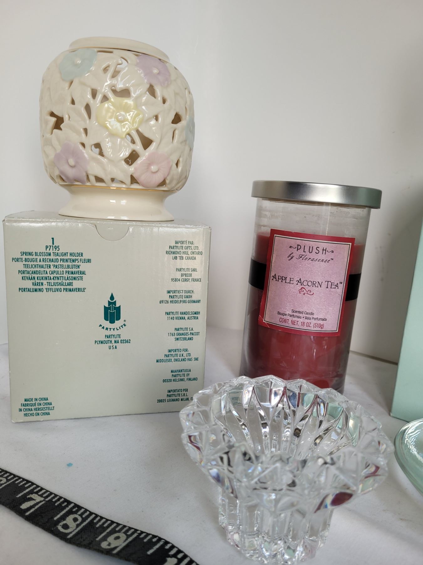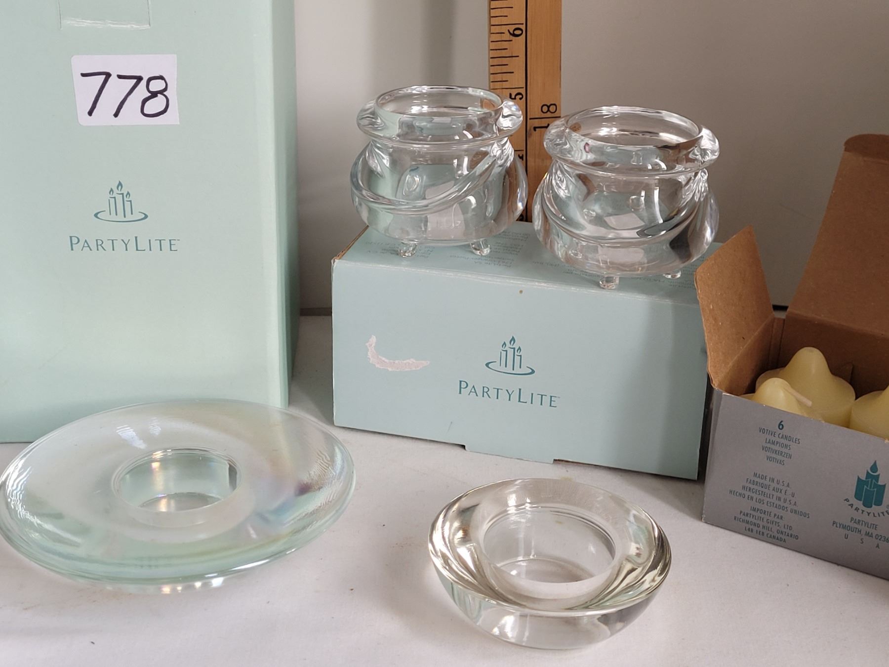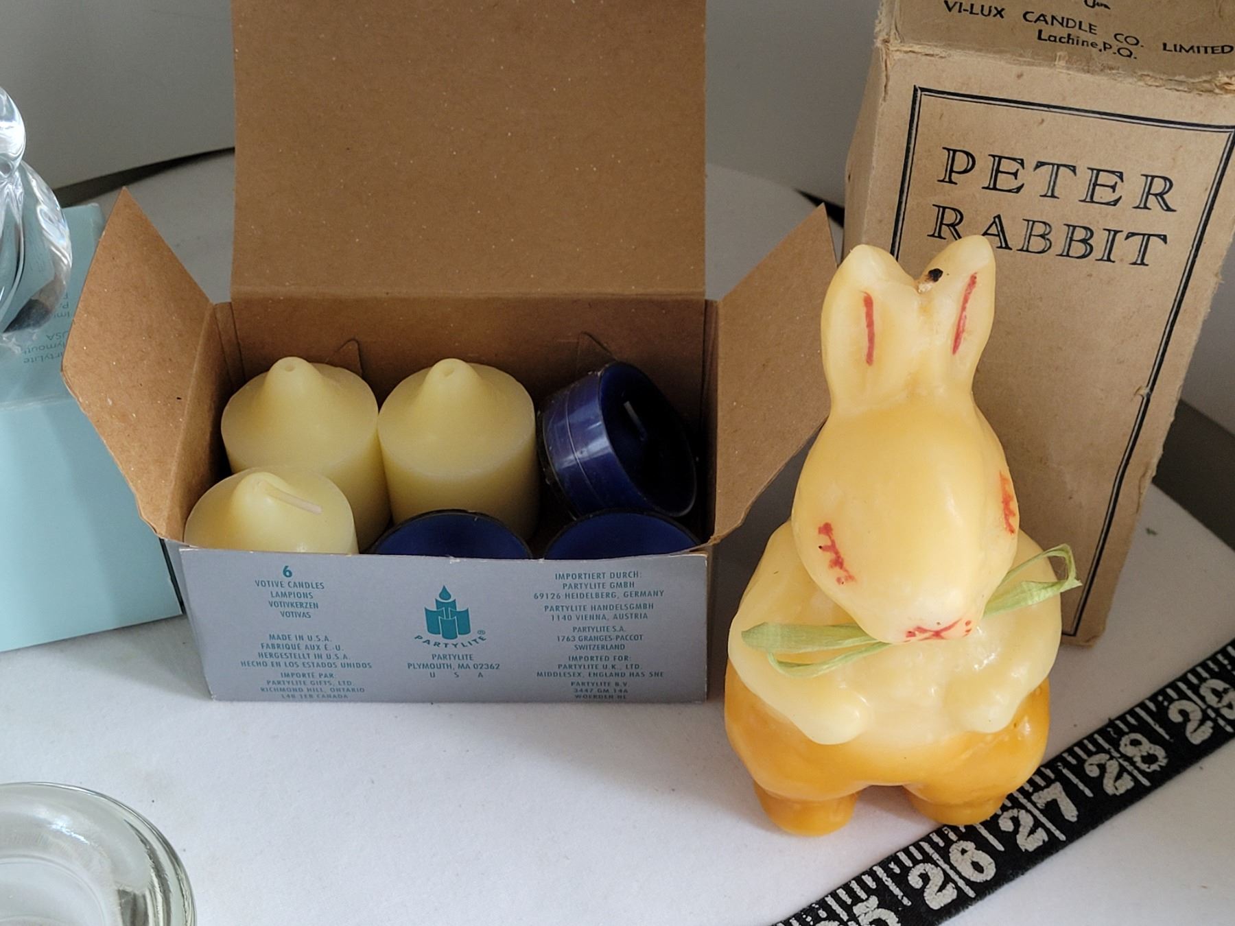 Group of candles & holders. New old stock partylite, vintage Peter rabbit in original box.