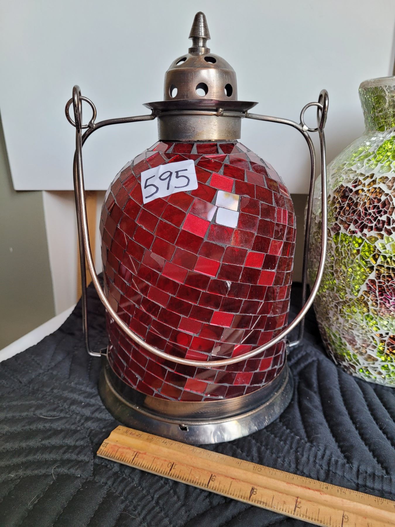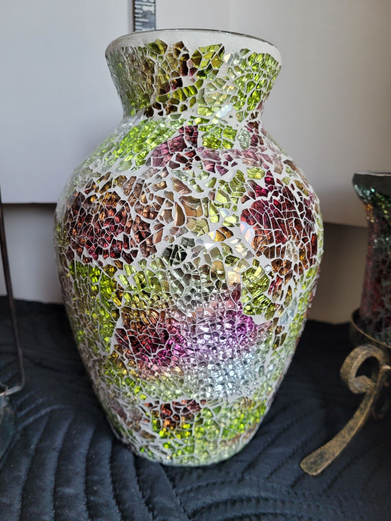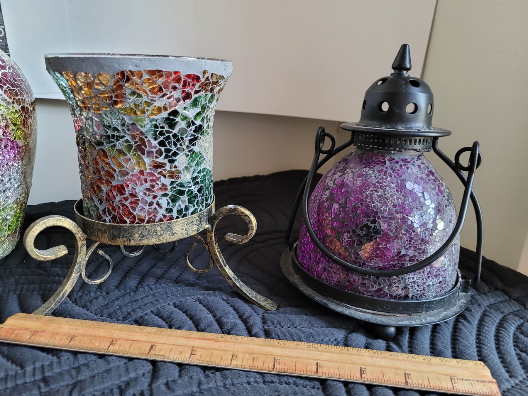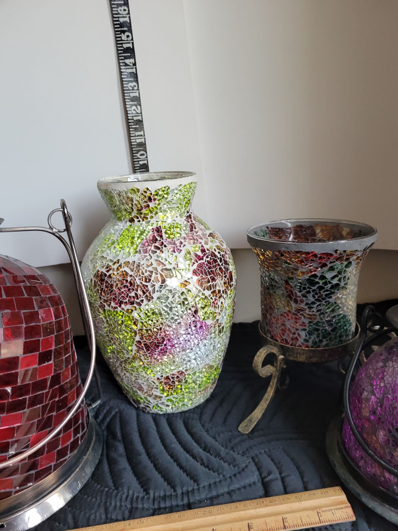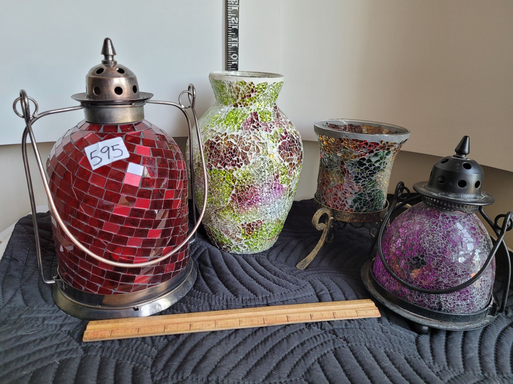 Group of mosaic candle light lamps and mosaic vase.