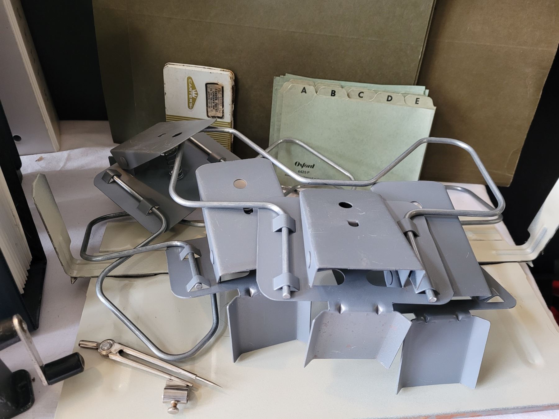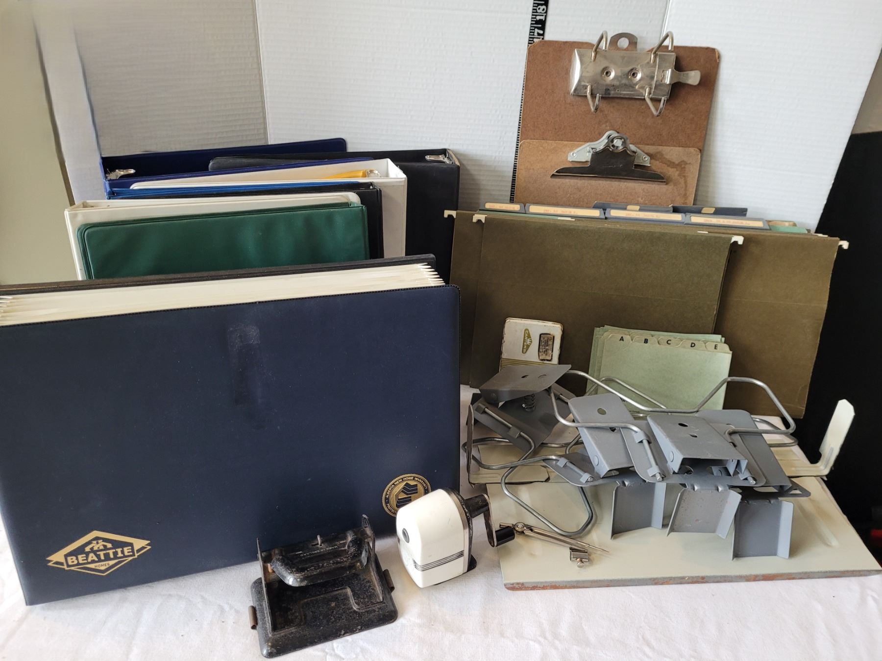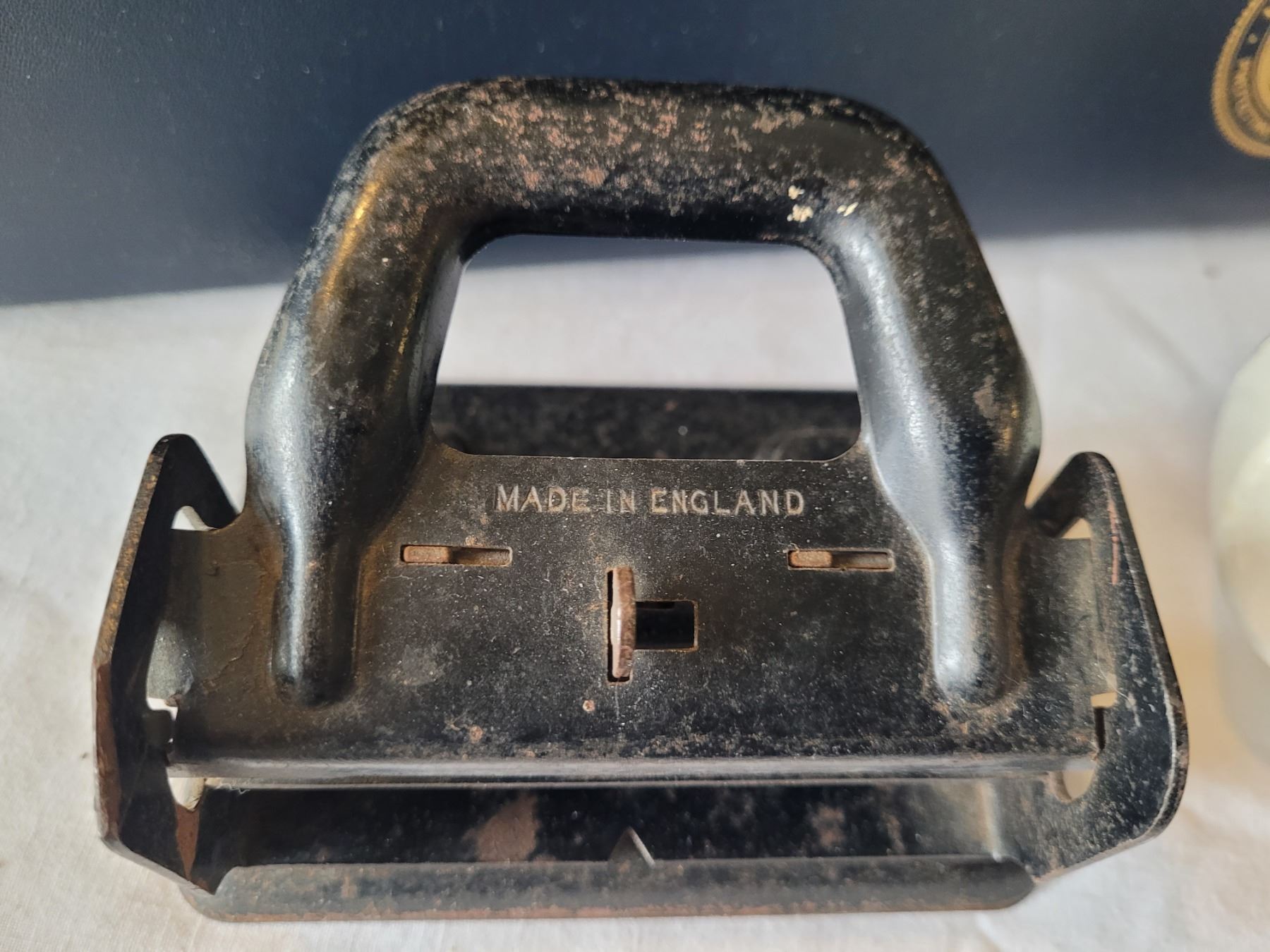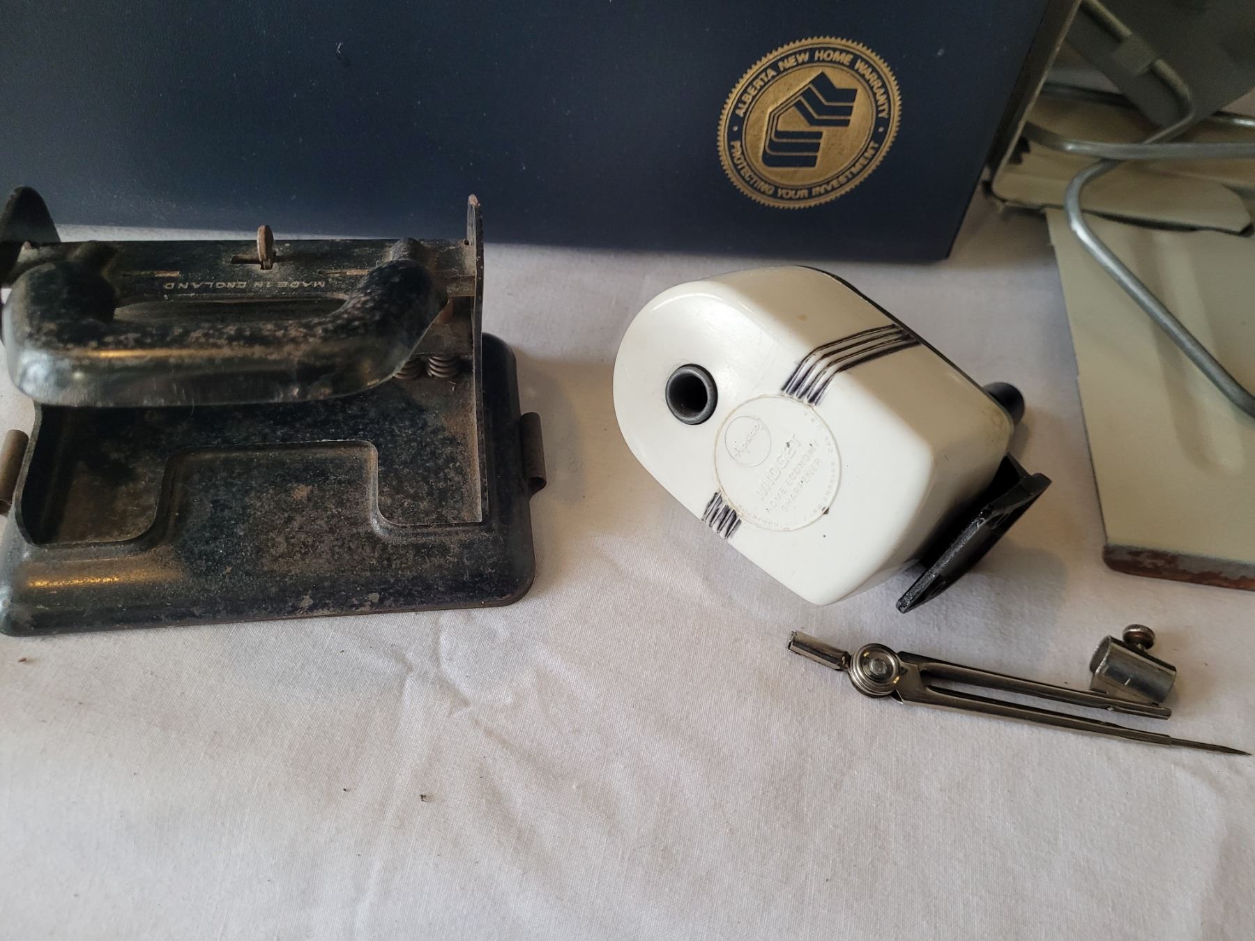 Group of office supplies including vintage hole punch (England) & Pencil sharpener.(USA)