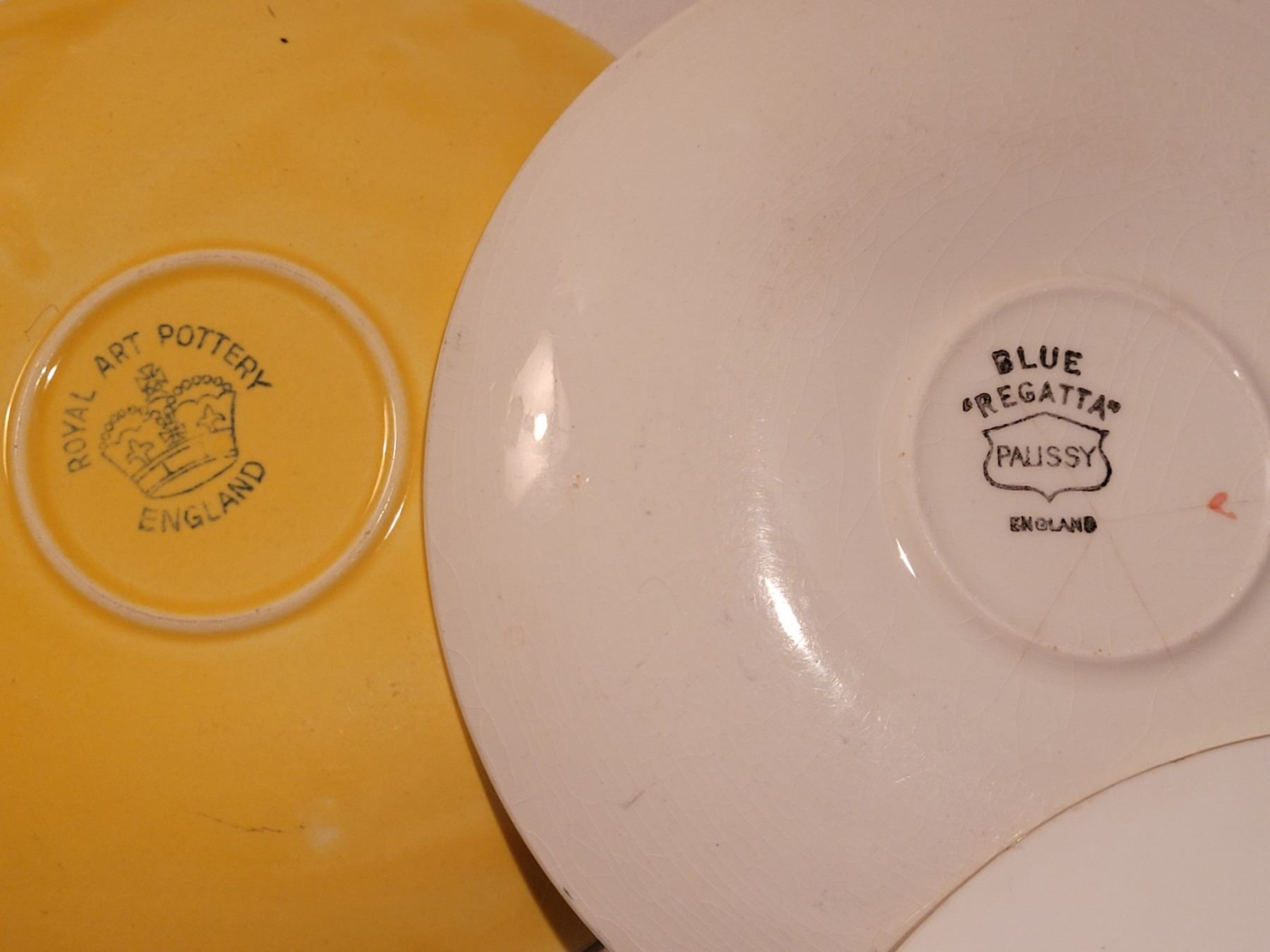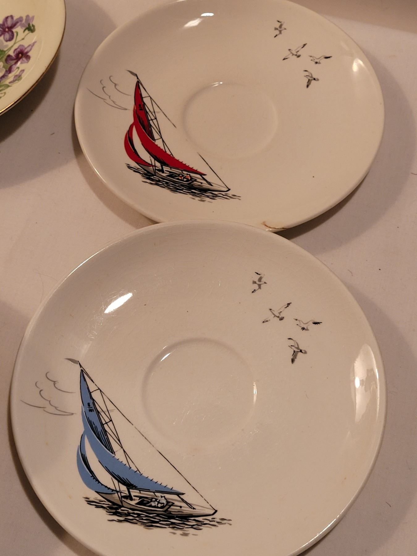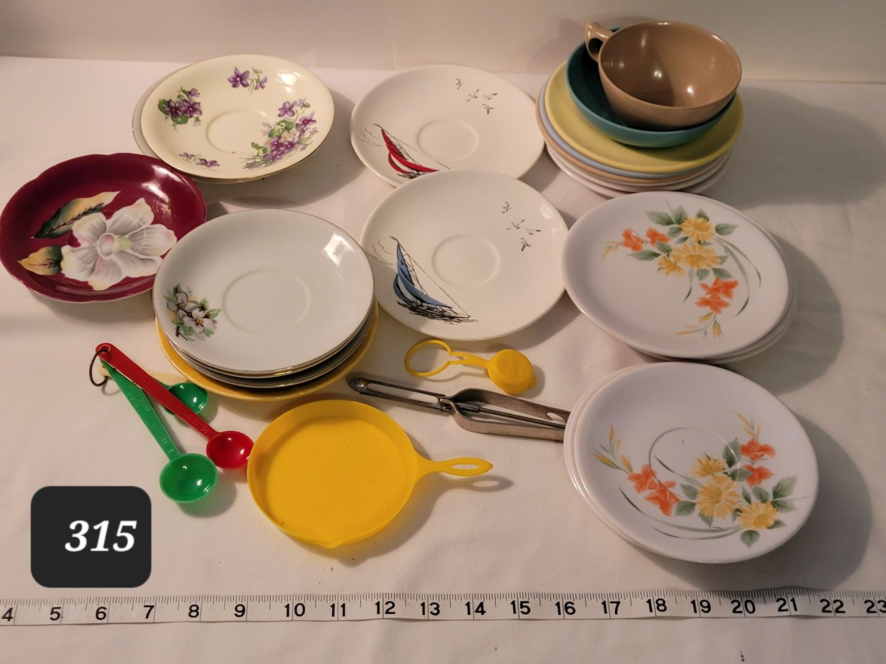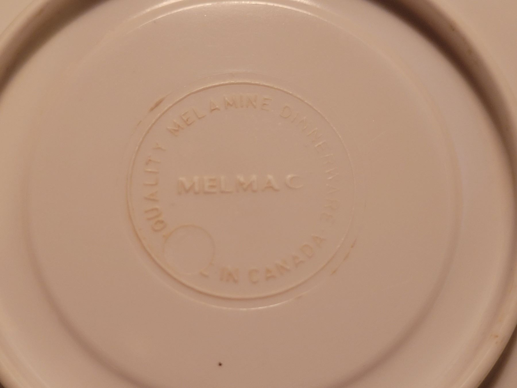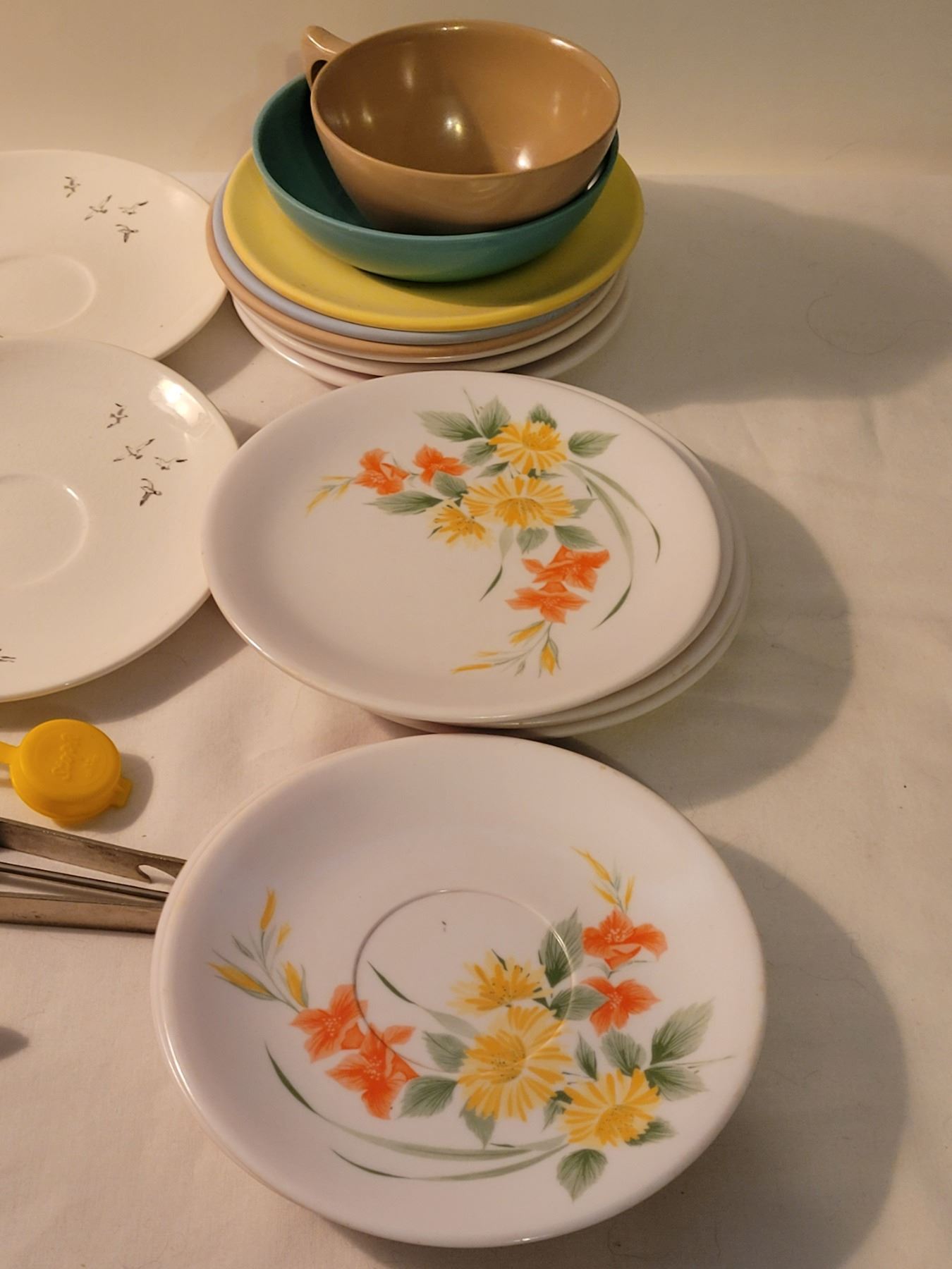 Group of vintage Melmac & Duraware dishes, China plates,utensils by Fuller & Majic