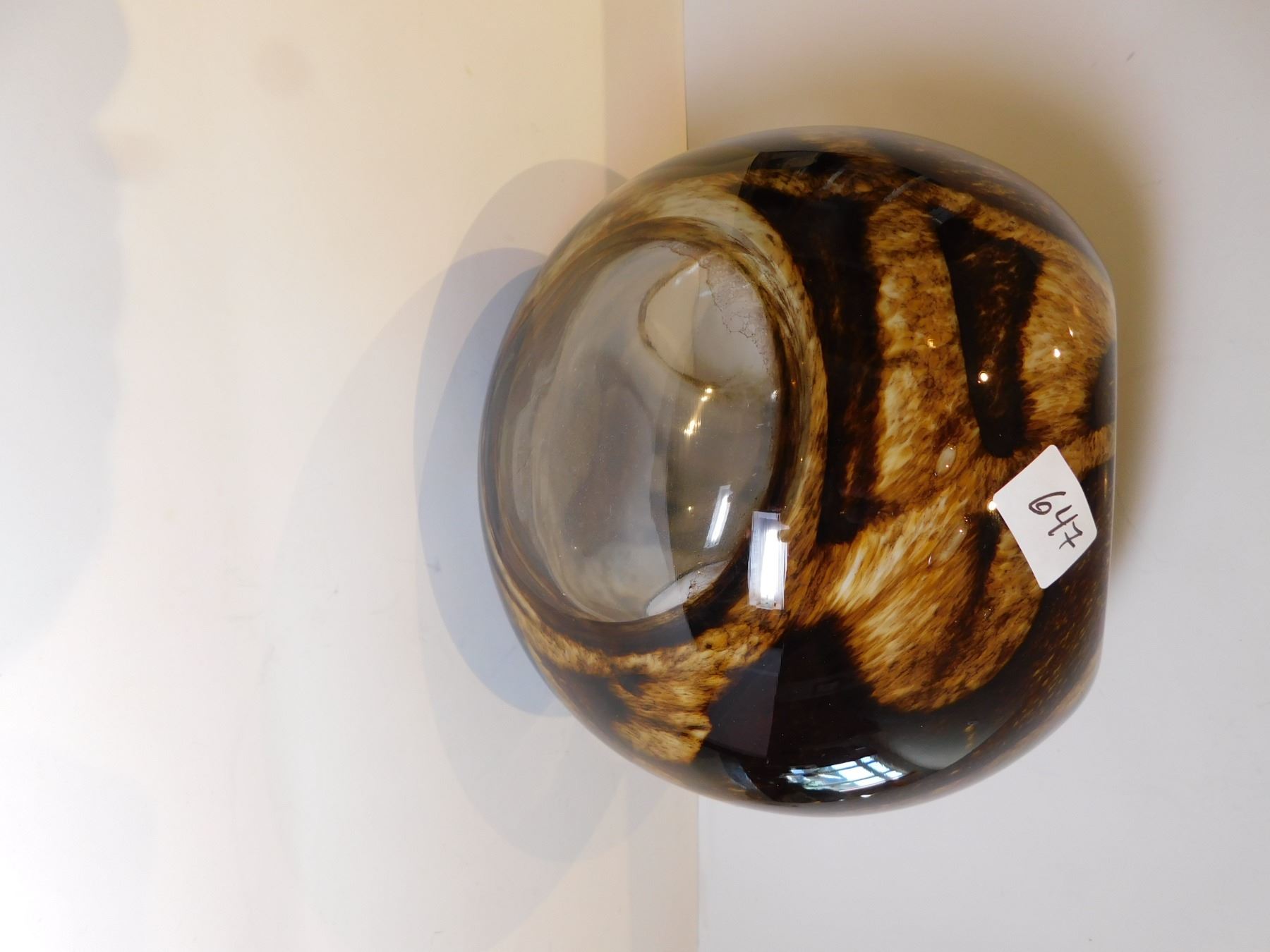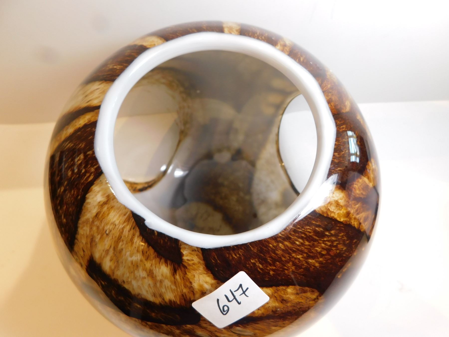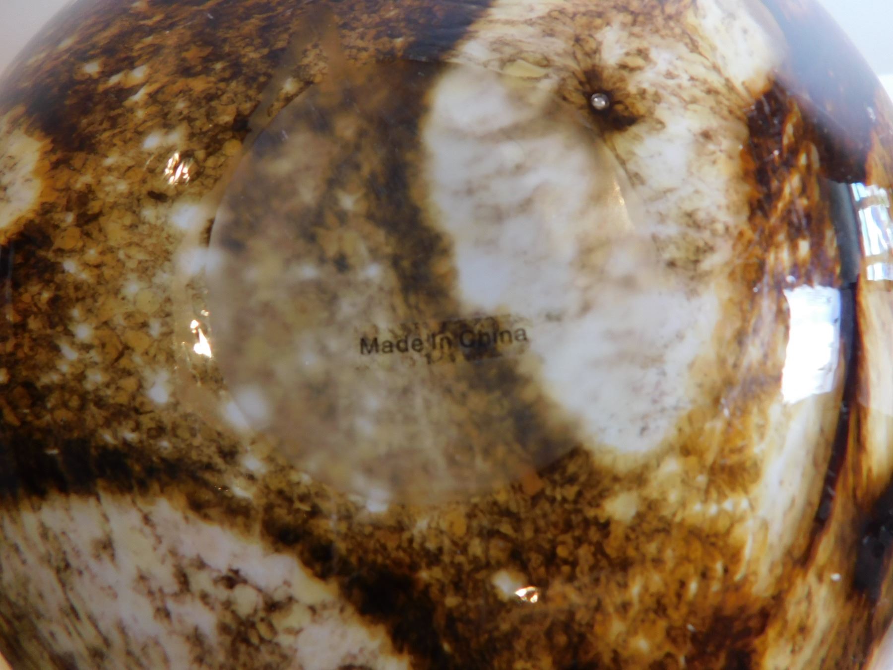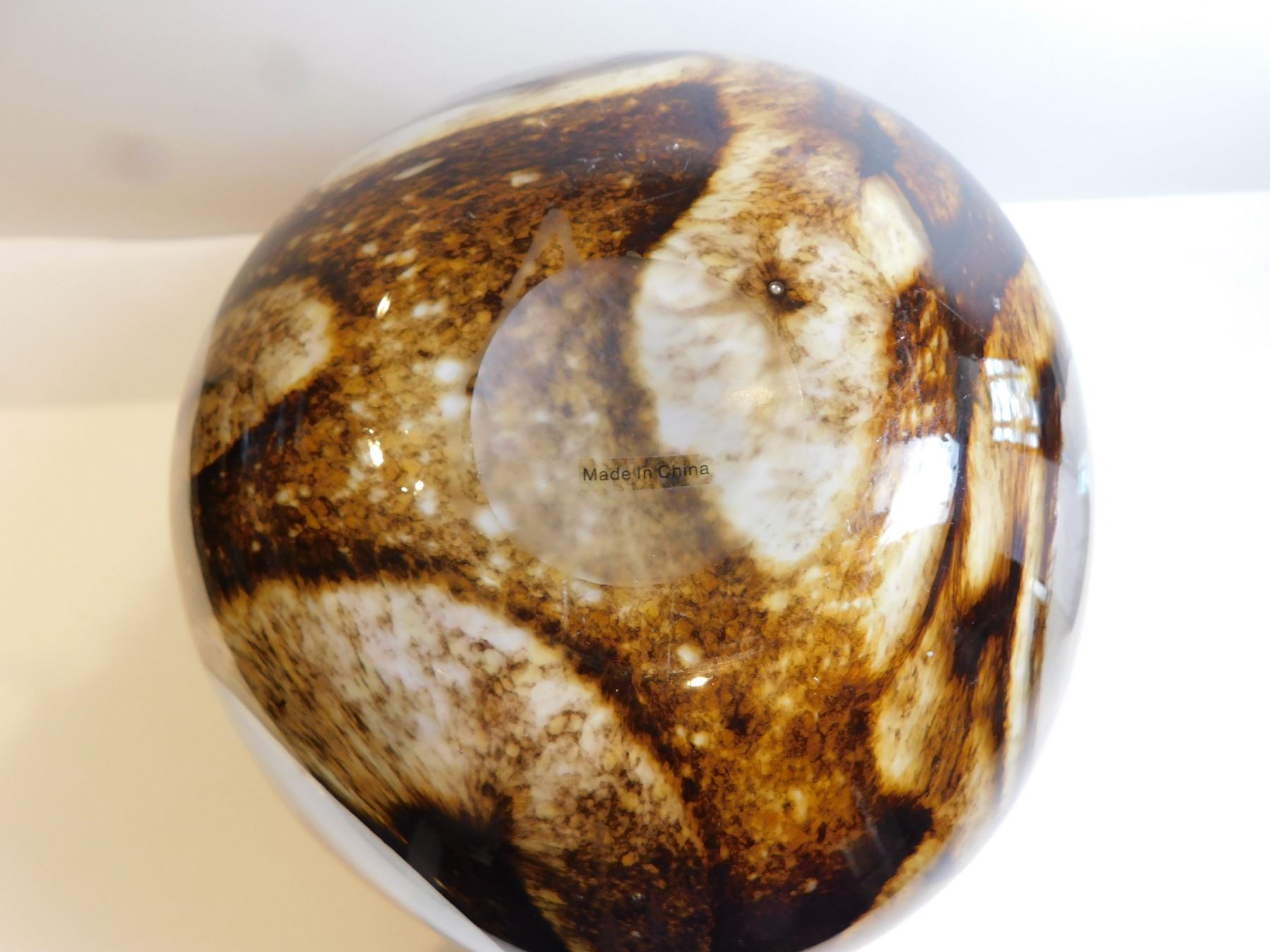 HAND BLOWN ART GLASS, 8” DIAMETER, TORTOISE SHELL PATTERN VASE