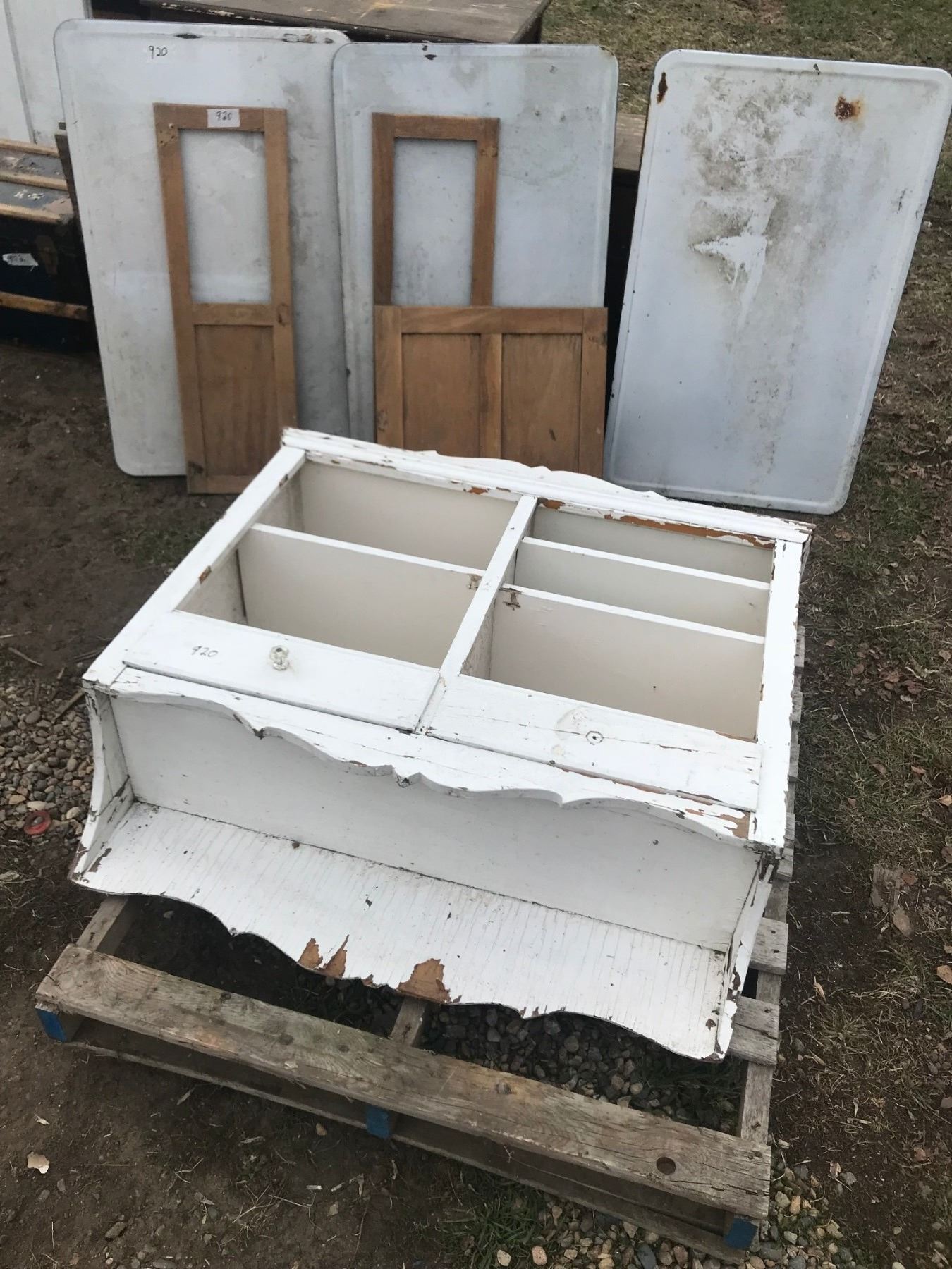 HANGING PINE CUPBOARD, 3 METAL HOOSIER DOORS, 3 METAL HOOSIER TOPS