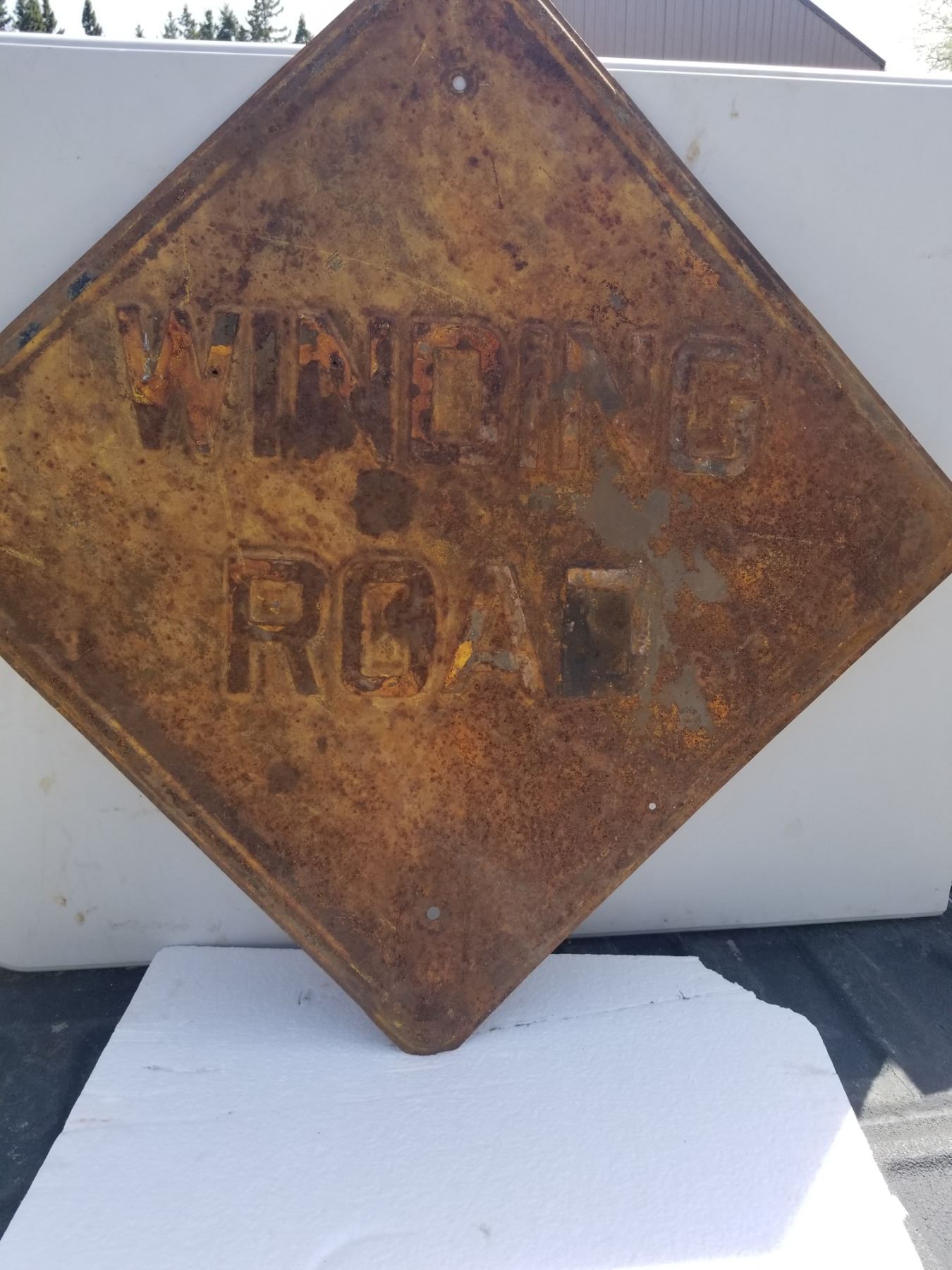 HEAVY STEEL EMBOSSED ROAD SIGN (1940'S) *WINDING ROAD* (2' X 2')