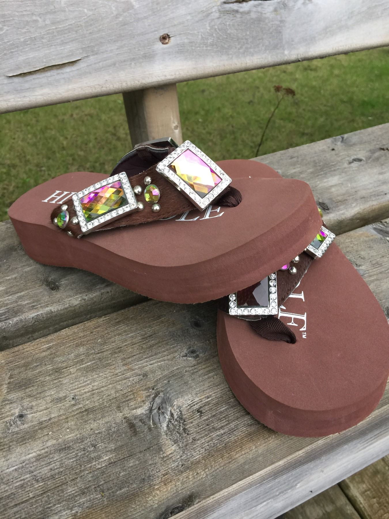HIDE N SOLE flip flops /Brown leather hair on hide straps/volcano stones/size small/***stones may or may not have some discoloring***can be removed from strap easily
