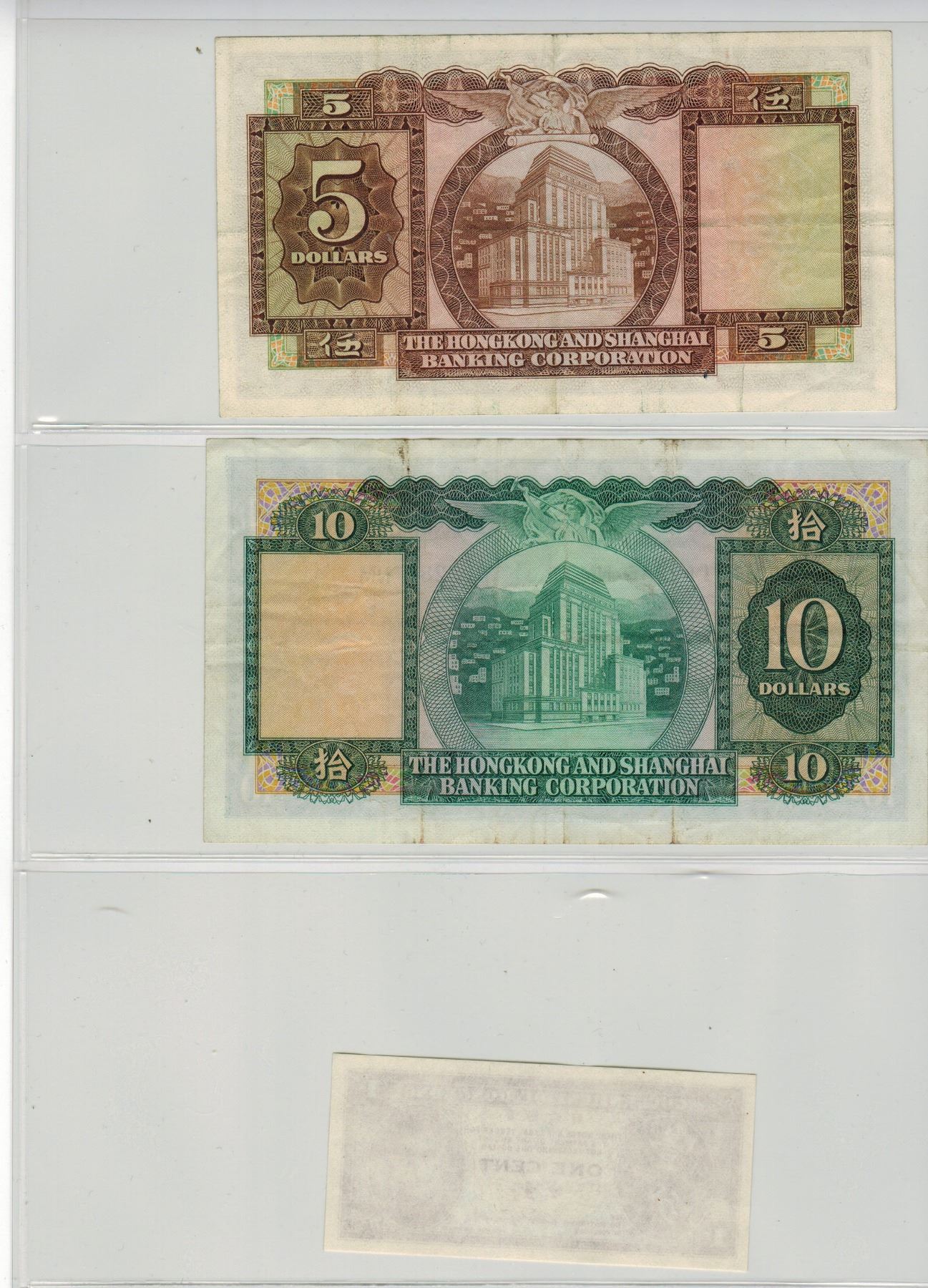 HONG KONG BANK NOTES - Lot of 3 - 1 Cent - 5 Dollars (1969) - 10 Dollars (1969)