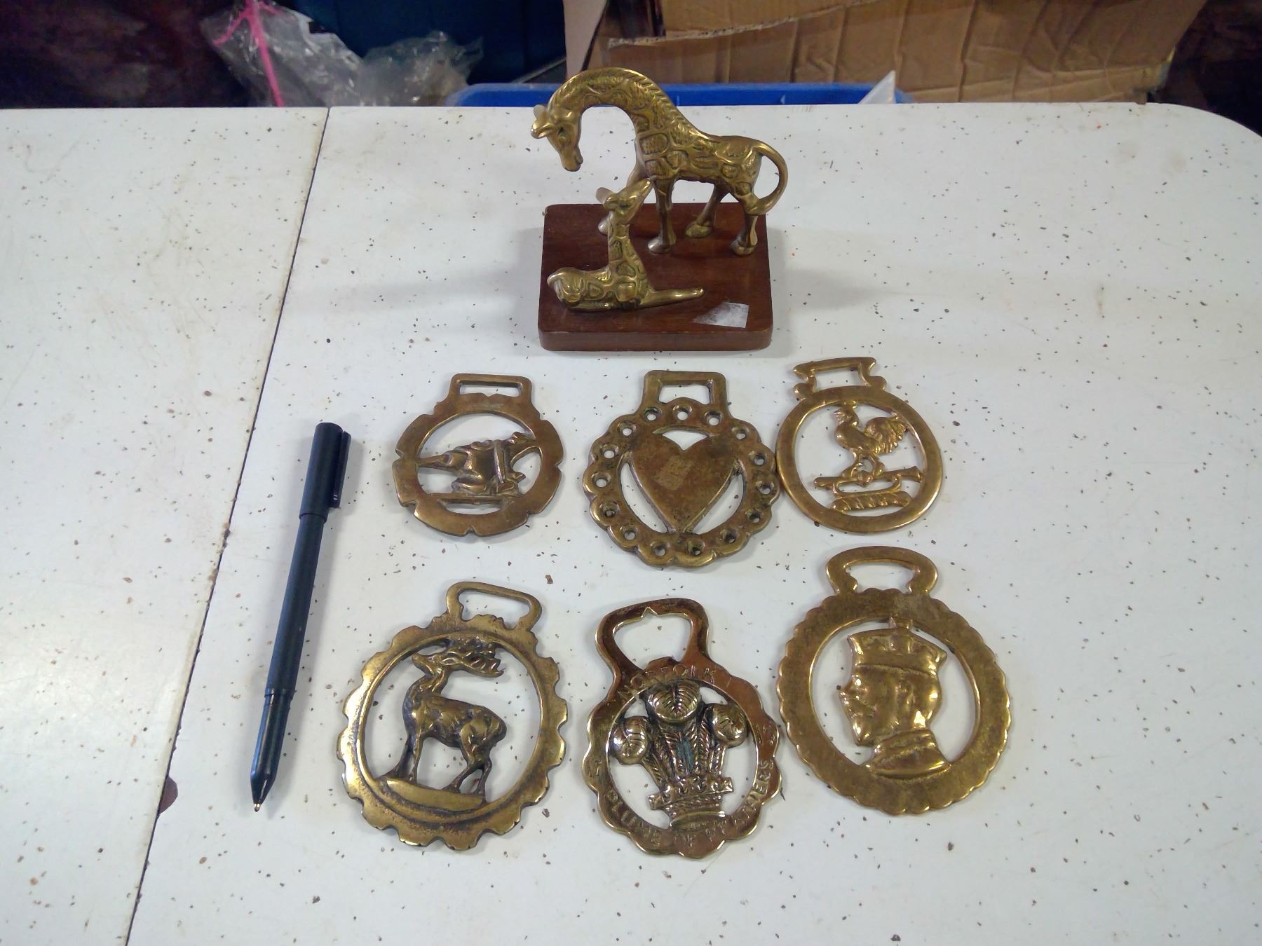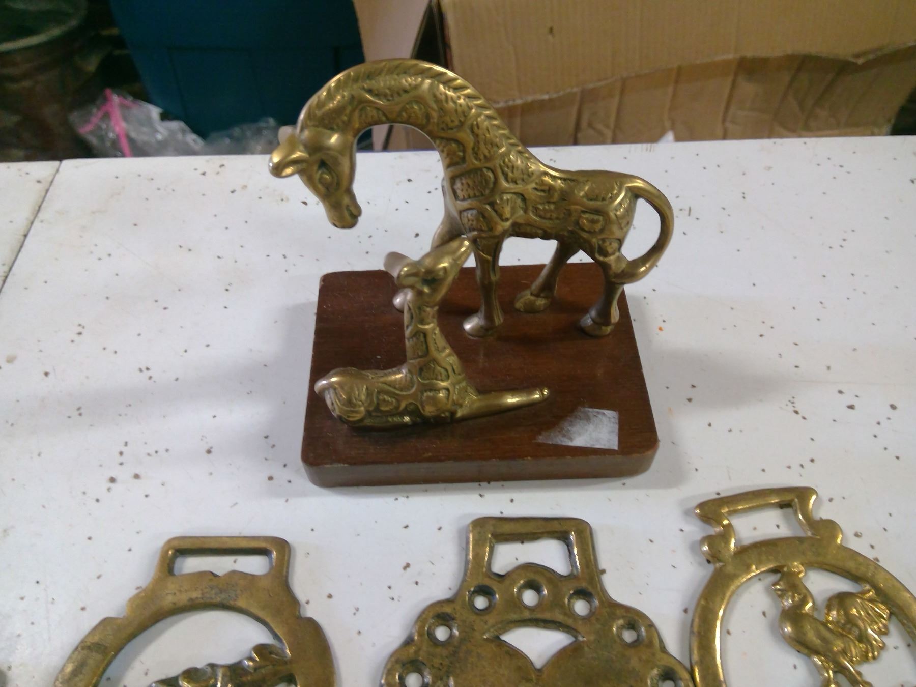 HORSE HARNESS BRASS HANGINGS W/ BRASS GIRAFFE STATUE