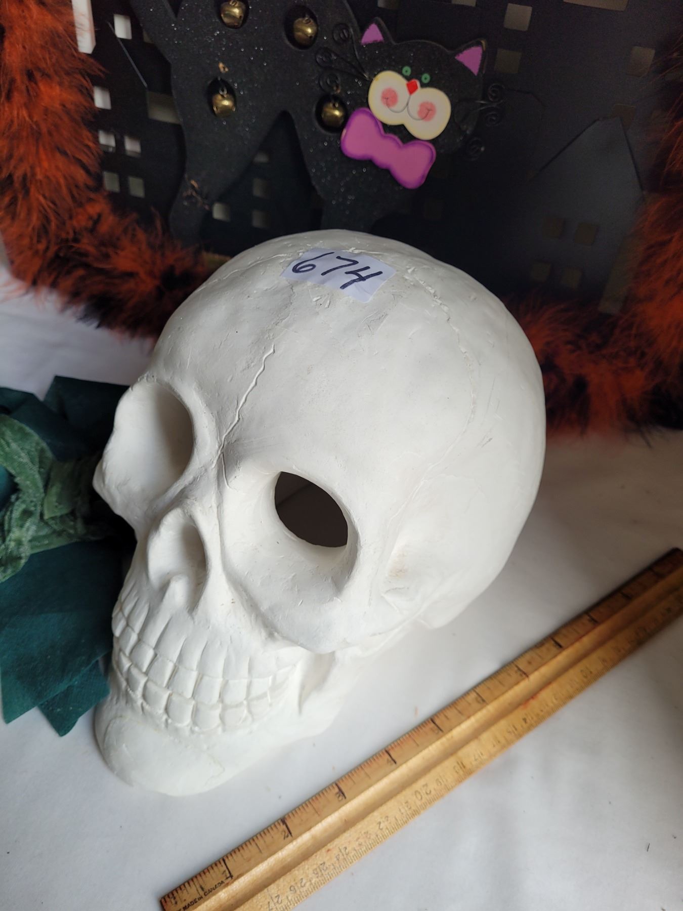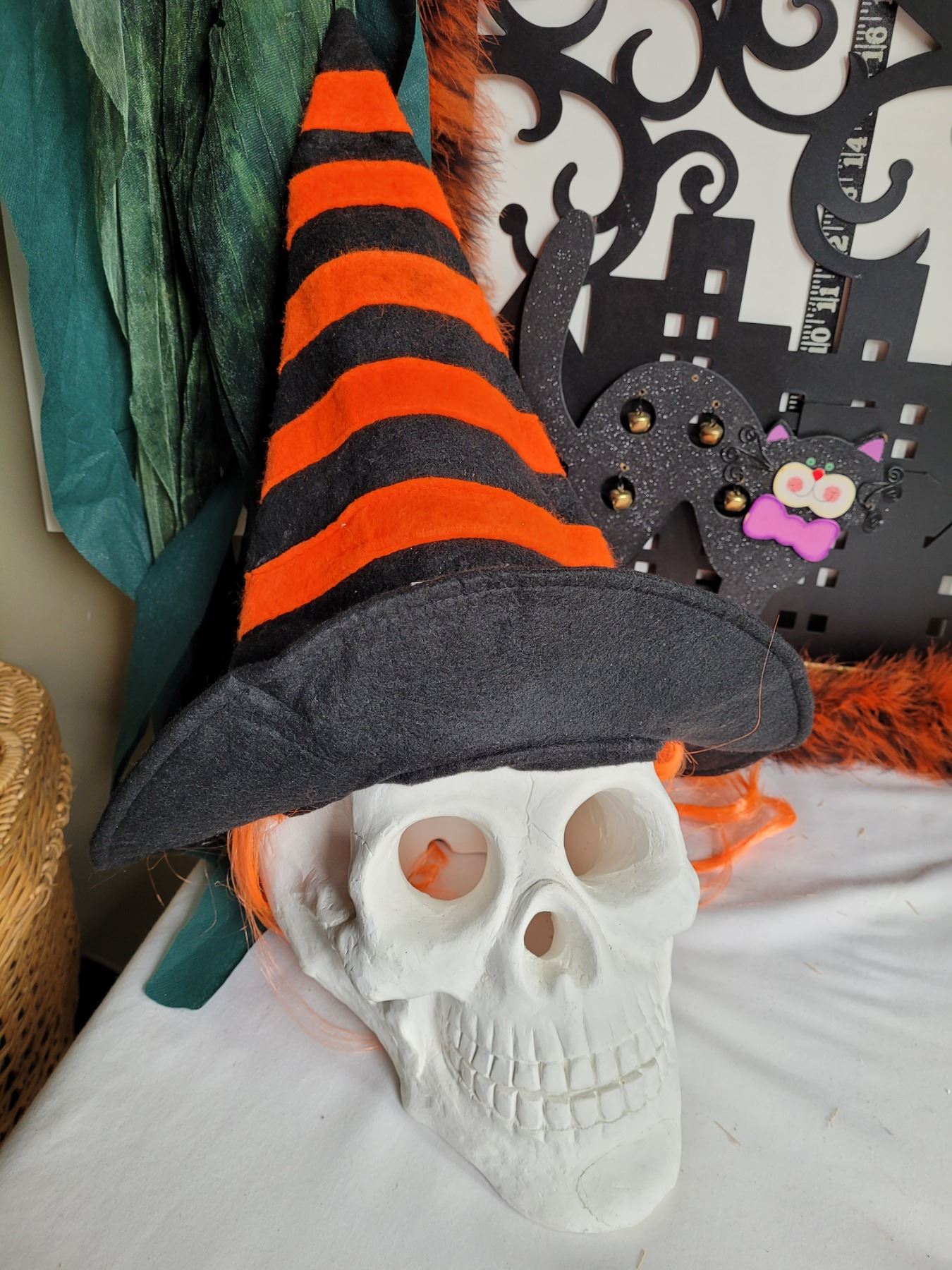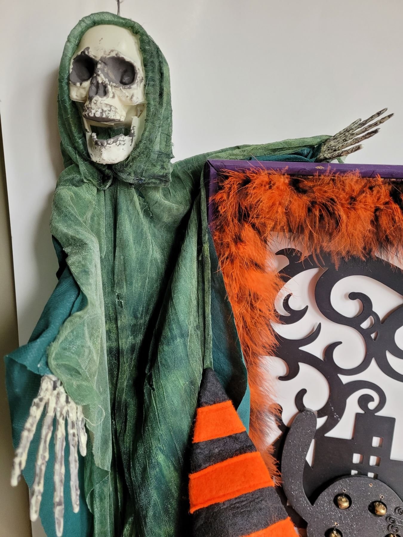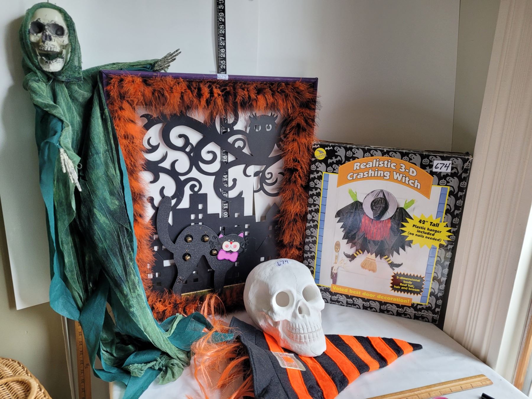 Halloween lot. Door hanger, plaster skull, hooded skeleton, crashing witch & orange hair hat.